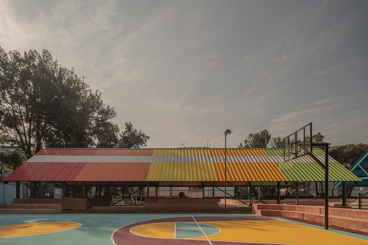 Today, with the intervention complete, the space has been transformed into a new social hub. At school dismissal, children gather around the central architectural element of the intervention: a colorful gabled structure that introduces scale, spatial definition, and character to what was once a bleak sun-exposed court. The decision to place this structure at the heart of the site was strategic—discouraging future encroachments, preserving open perimeters, and ensuring continuous visibility and natural surveillance.