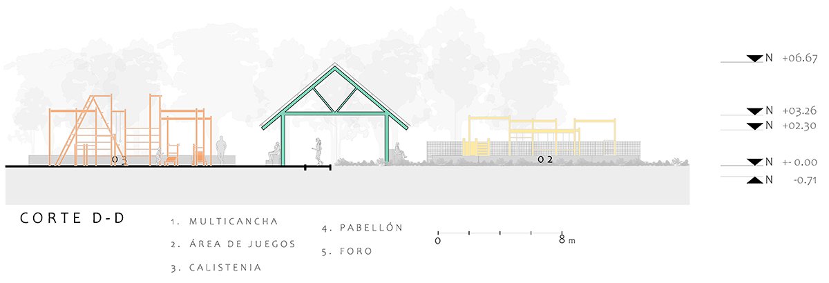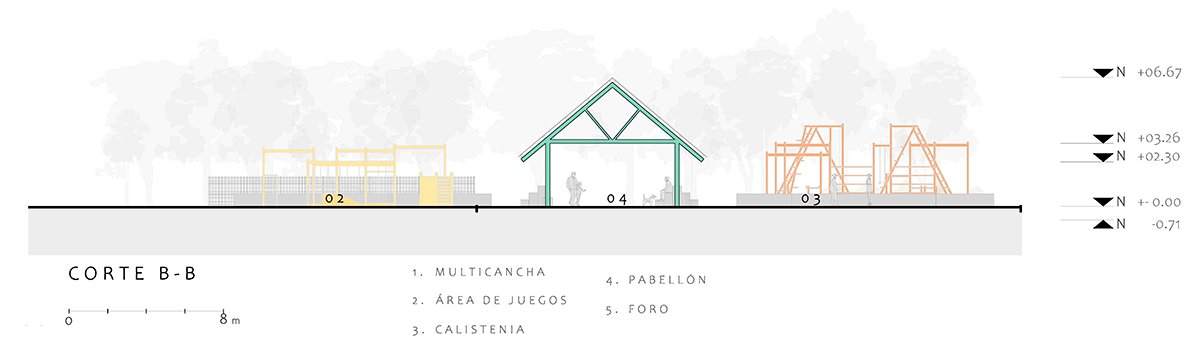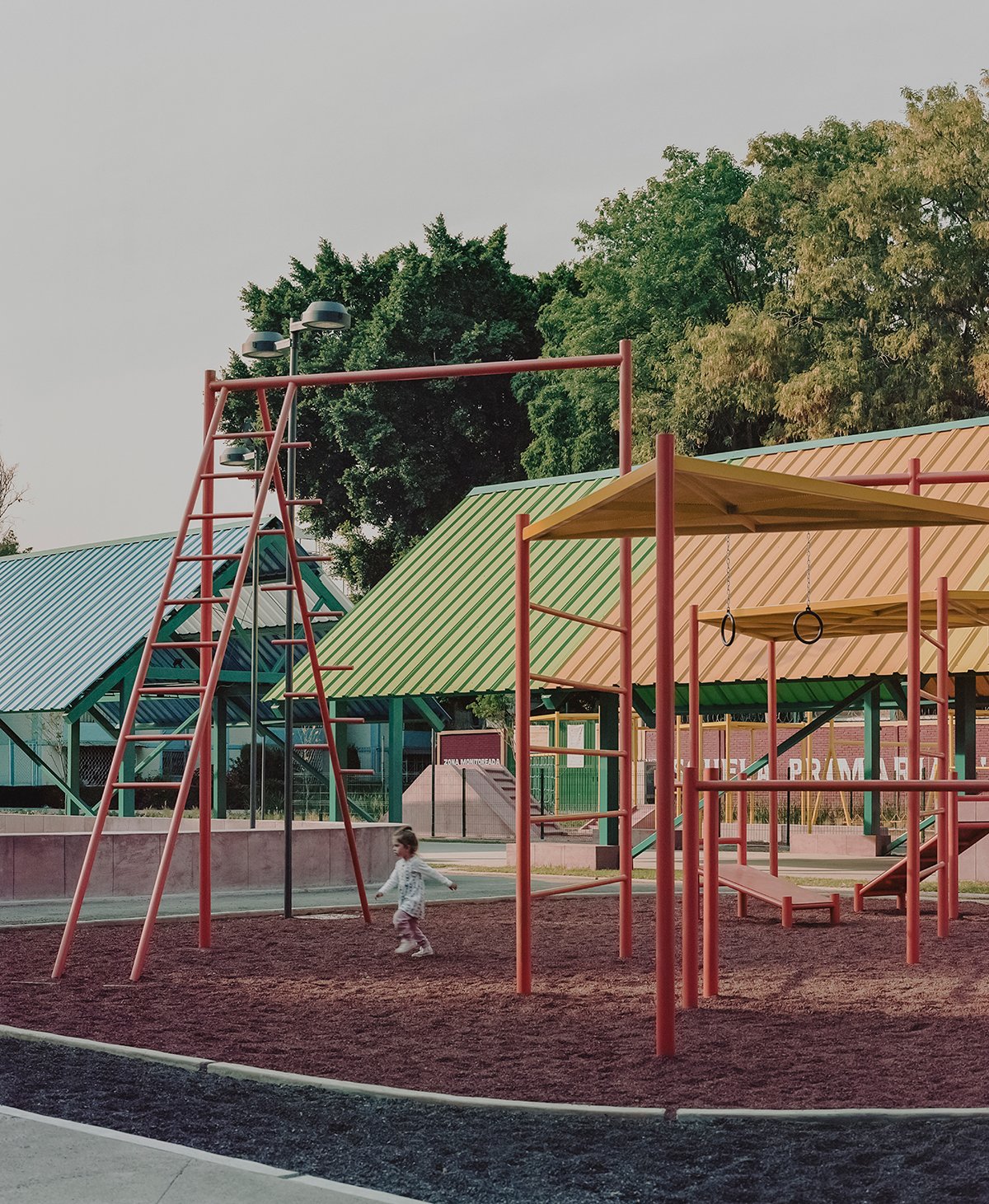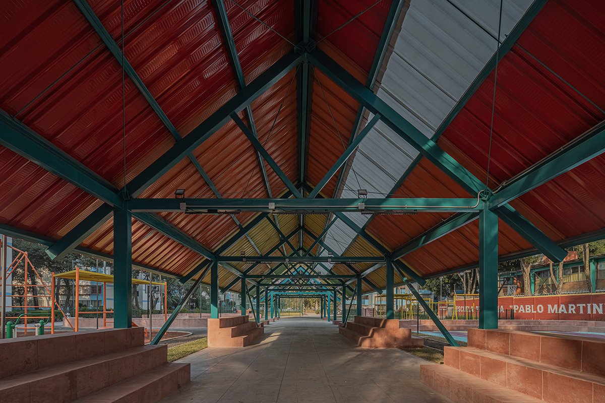 It was in this context that Andrea López and Agustín Pereyra, of AMASA Estudio, developed a conceptual proposal to rehabilitate the plaza—ultimately winning the tender. Before the intervention, the site contained worn-out sports courts, aging playground equipment, outdoor gym apparatus, and several underutilized residual spaces. The area was enclosed by the perimeter walls of two neighboring schools: the “Pablo Martínez del Río” primary school and the “Héroes de 1810” kindergarten. This condition created residual corners prone to informal use, waste accumulation, and antisocial behavior, including substance use.