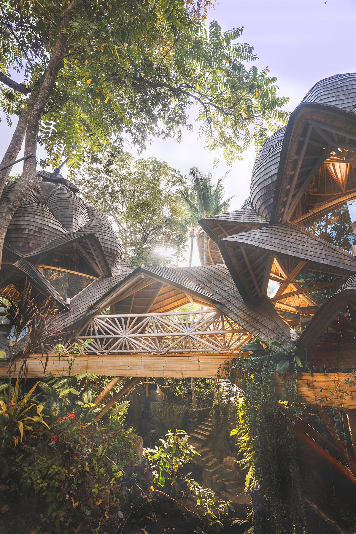 Bamboo, a remarkably sustainable material, is extensively used in the resort’s construction, showcasing the unique beauty of bamboo architecture which seamlessly blends with the surrounding vegetation, along with the warm tones of rammed earth, with curvilinear roof formations that can be admired from various angles and aspects. The yoga studio is a true architectural marvel, with its cantilevered structure supporting a parabolic bamboo pavilion, seemingly suspended on the edge of a cliff.