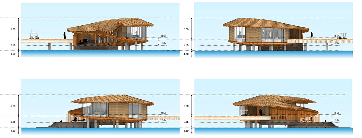 The arrangement of buildings on the land follows the natural profile and geometry of the shoreline, incorporating curved organic shapes to blend harmoniously with the desert landscape. Inspired by the rich coral life within the island’s oceans, our design for the offshore sea villas features a spiral volume emerging gracefully from the sea, offering unobstructed views of the ocean landscape. All structures, including hotel facilities, embrace a coral and dune-shaped plan, reflecting our commitment to integrating architecture with its environment.
