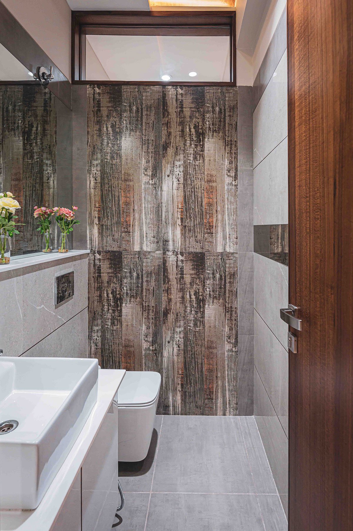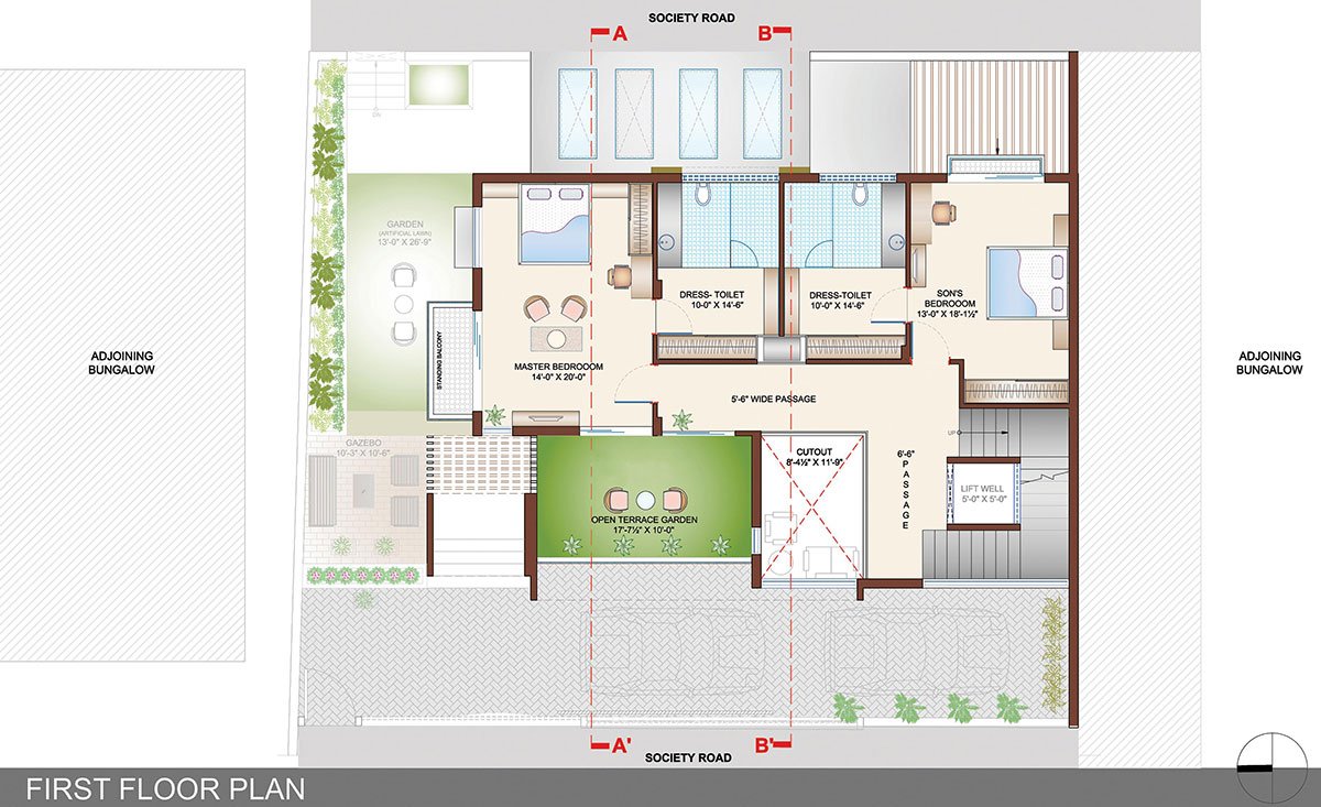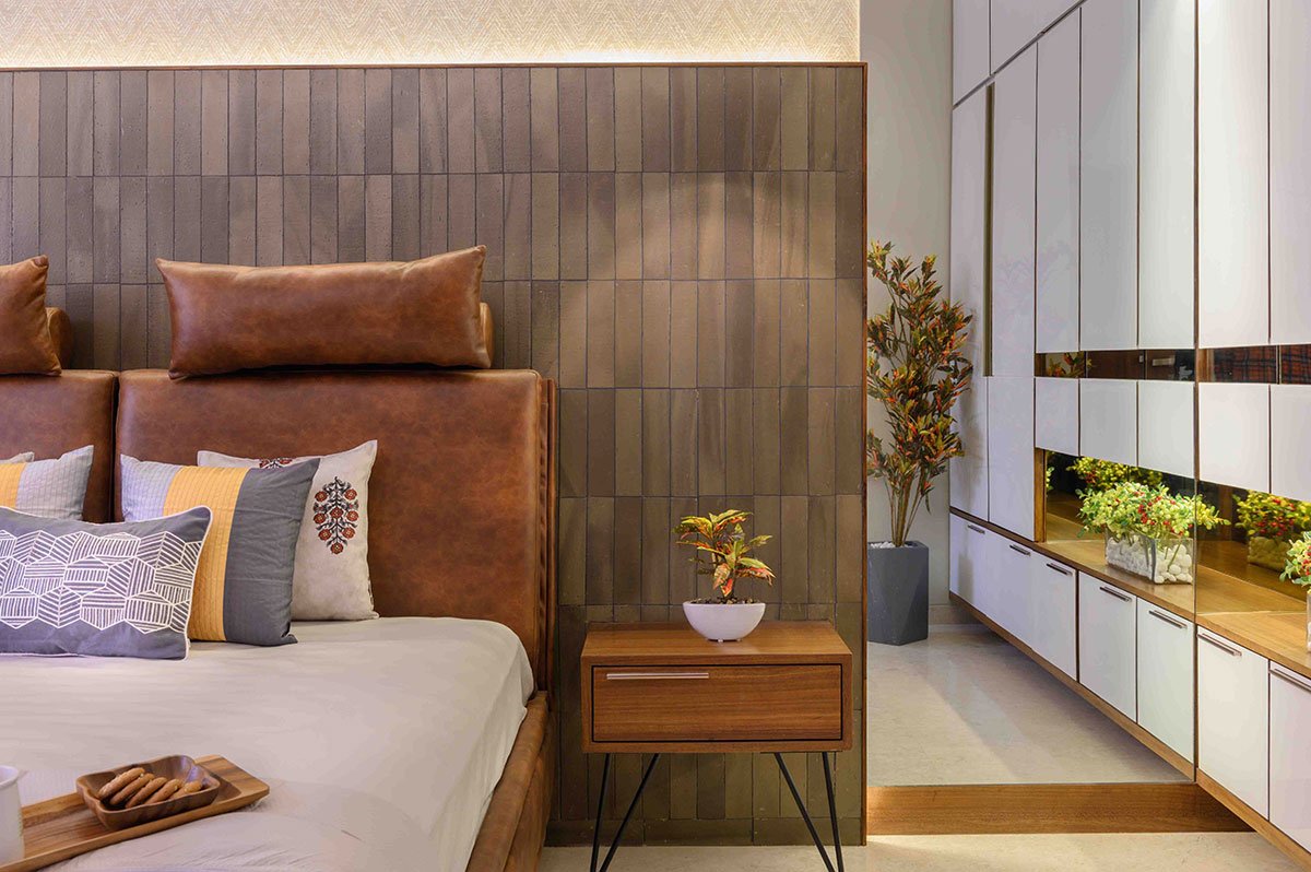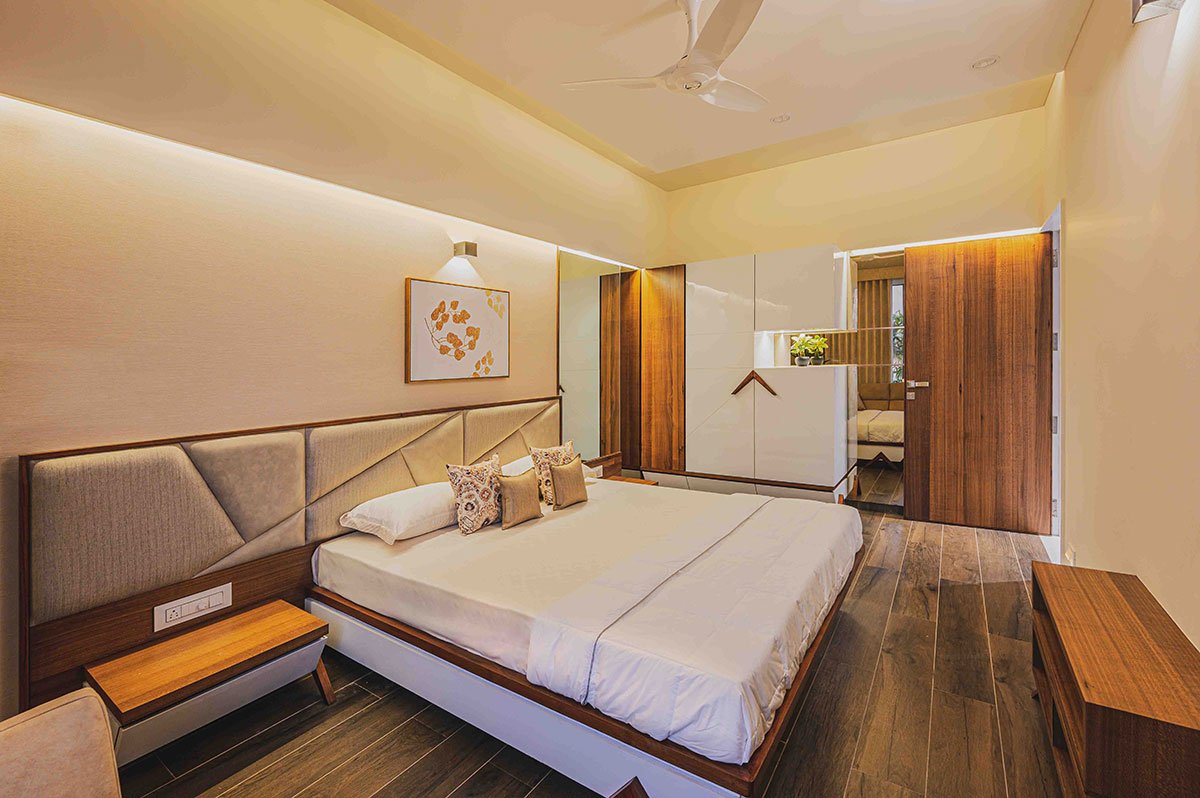 The first floor is a brightly lit space with the natural light striking the passages that lead to the master and son’s bedroom. The passage overlooks the vertical garden wall & the family sitting below. The master bedroom expresses warmth of the wood and the combination of bronze mirror with white MCM cladding material and its significantly large size allows visual connections with the ground floor entrance and the garden below. An elevated garden facing west has been provided on the first level, being enclosed directly by the highest façade frame, it becomes a double heighted garden. The son’s bedroom towards the south displays a blend of dark earthen elements.