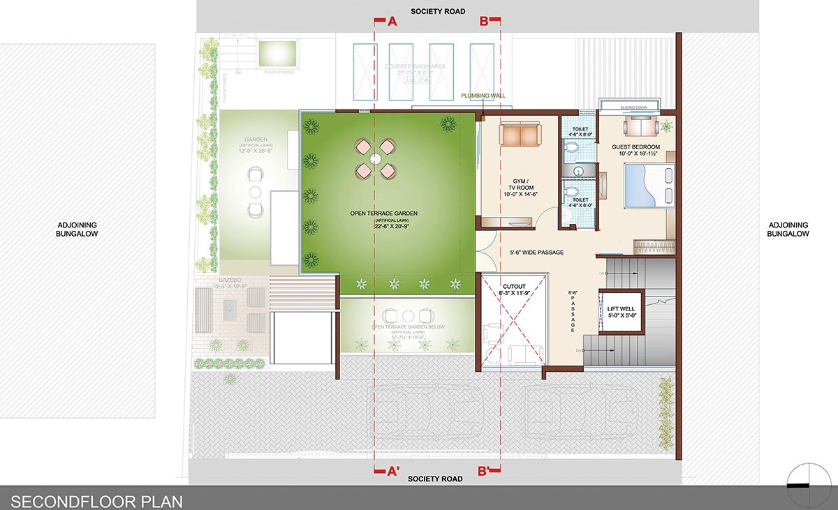 On the second floor, a guest bedroom and a compact leisure room is placed adjoining to a vast elevated party lawn. This terrace garden gives the users a chance to get closer to the ultimate height of the uppermost frame.