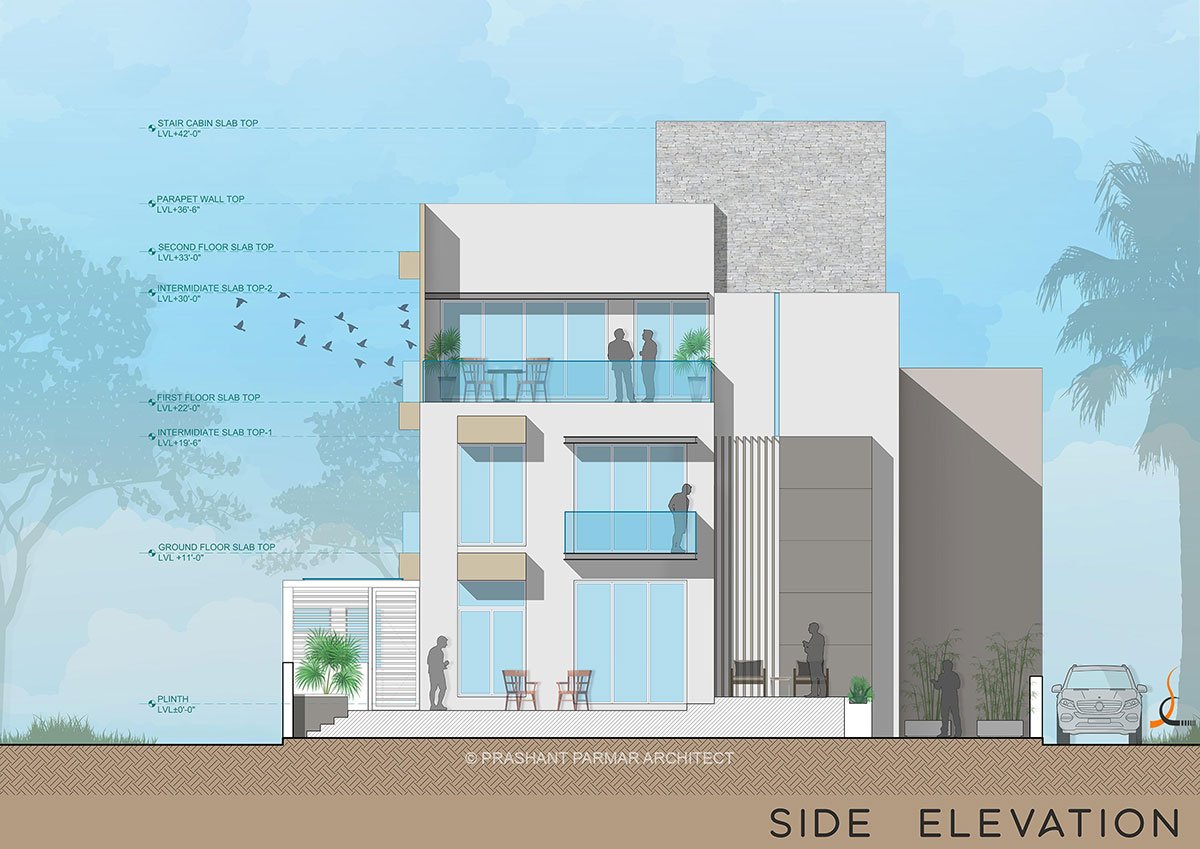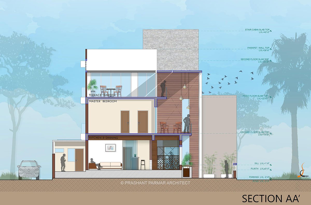 As one enters the house, the built form reveals its framed facade closely. This concept of frames is introduced with intent to maintain the privacy of the user. The planning allows for integrating a linear parking area. Since the house shares a common wall with the adjoining bungalow on the south, a beautiful garden has been provided in the north. A hierarchy of three frames creates an interesting mass of volumes.