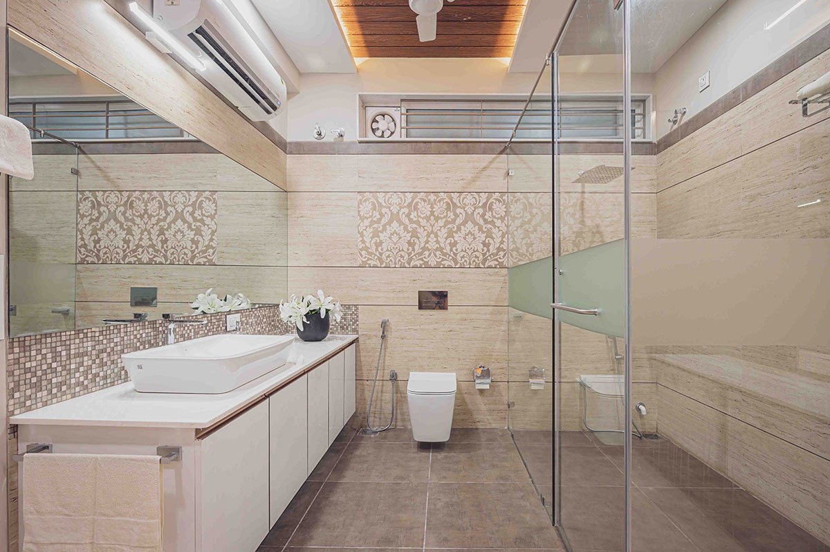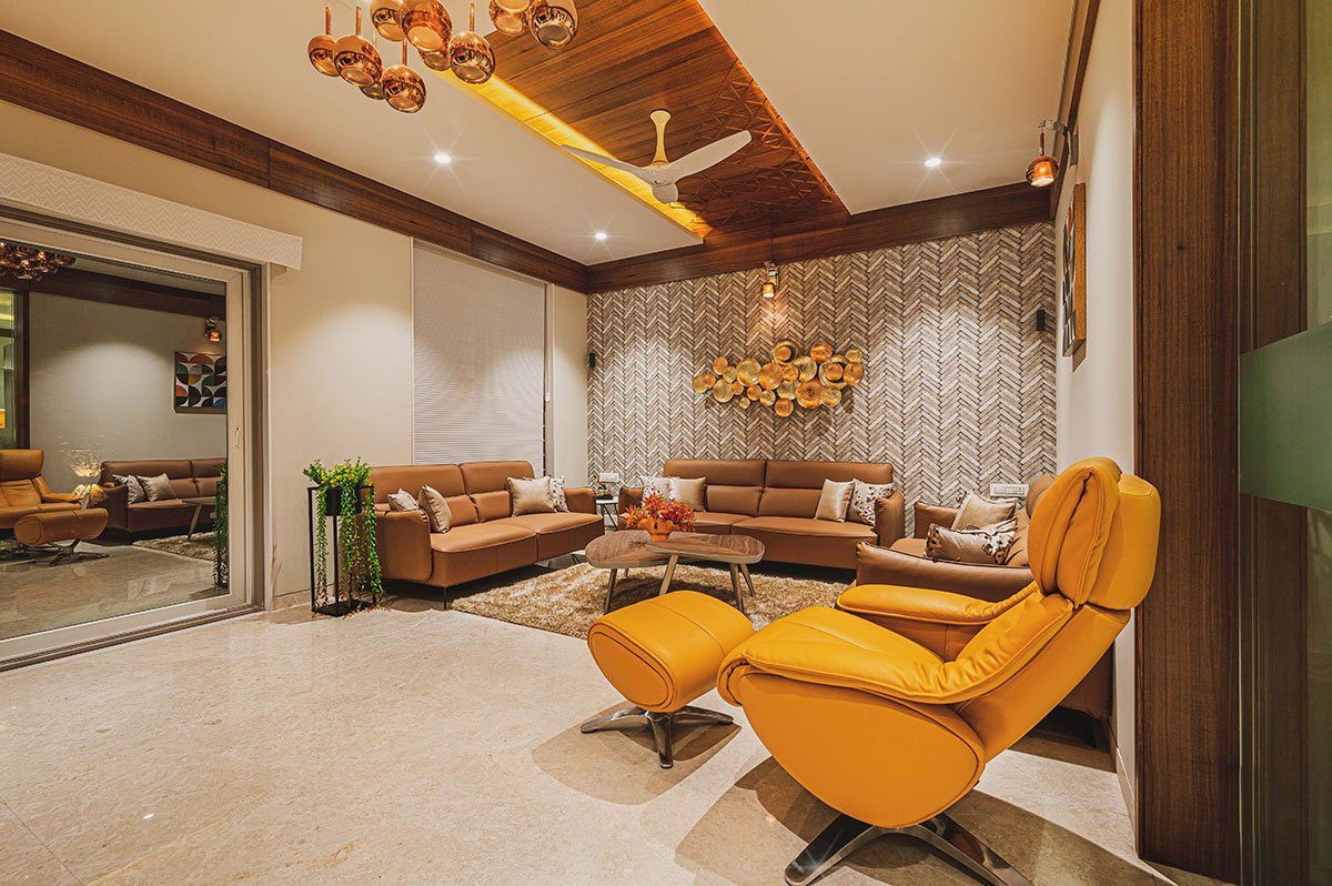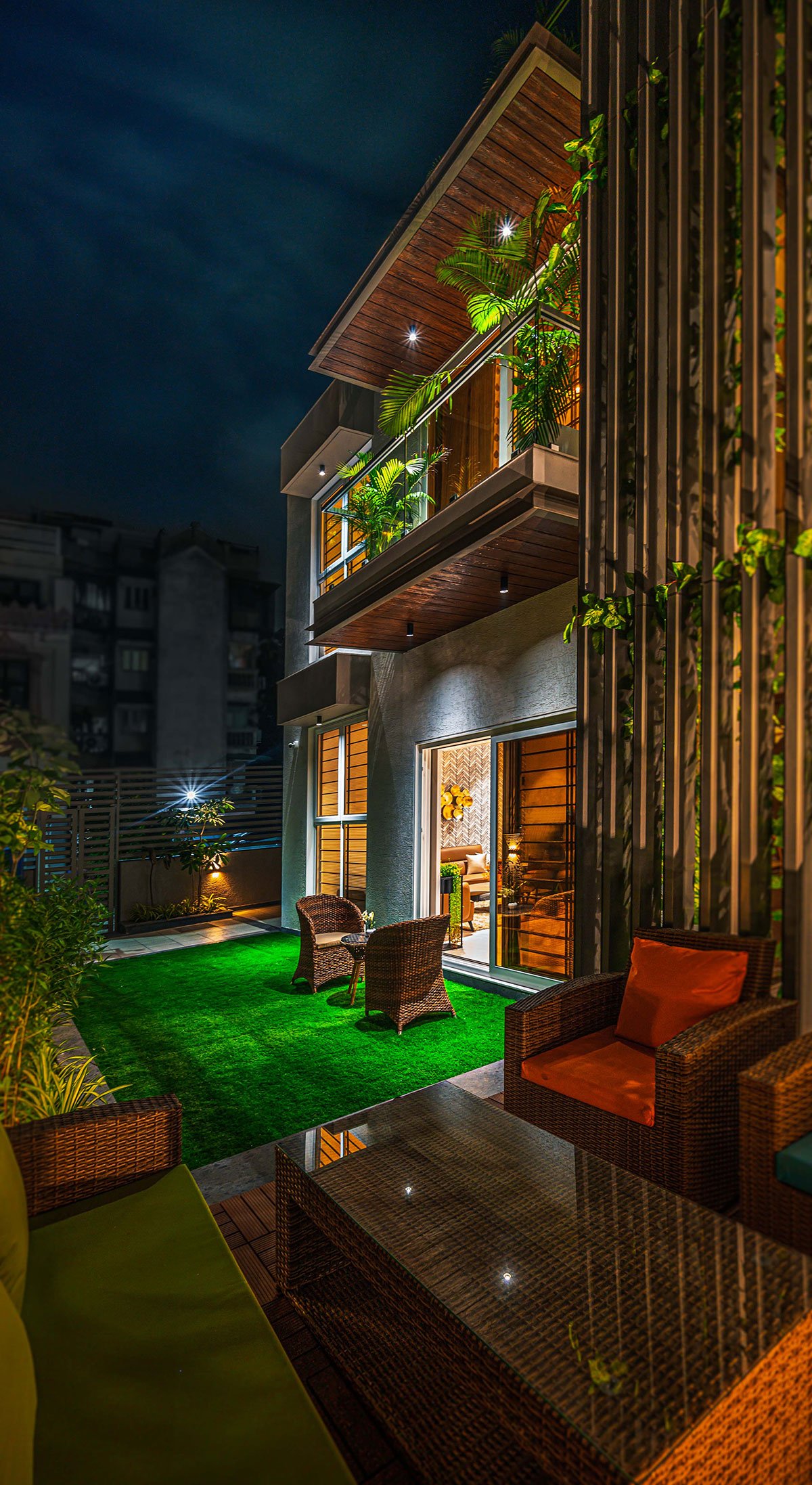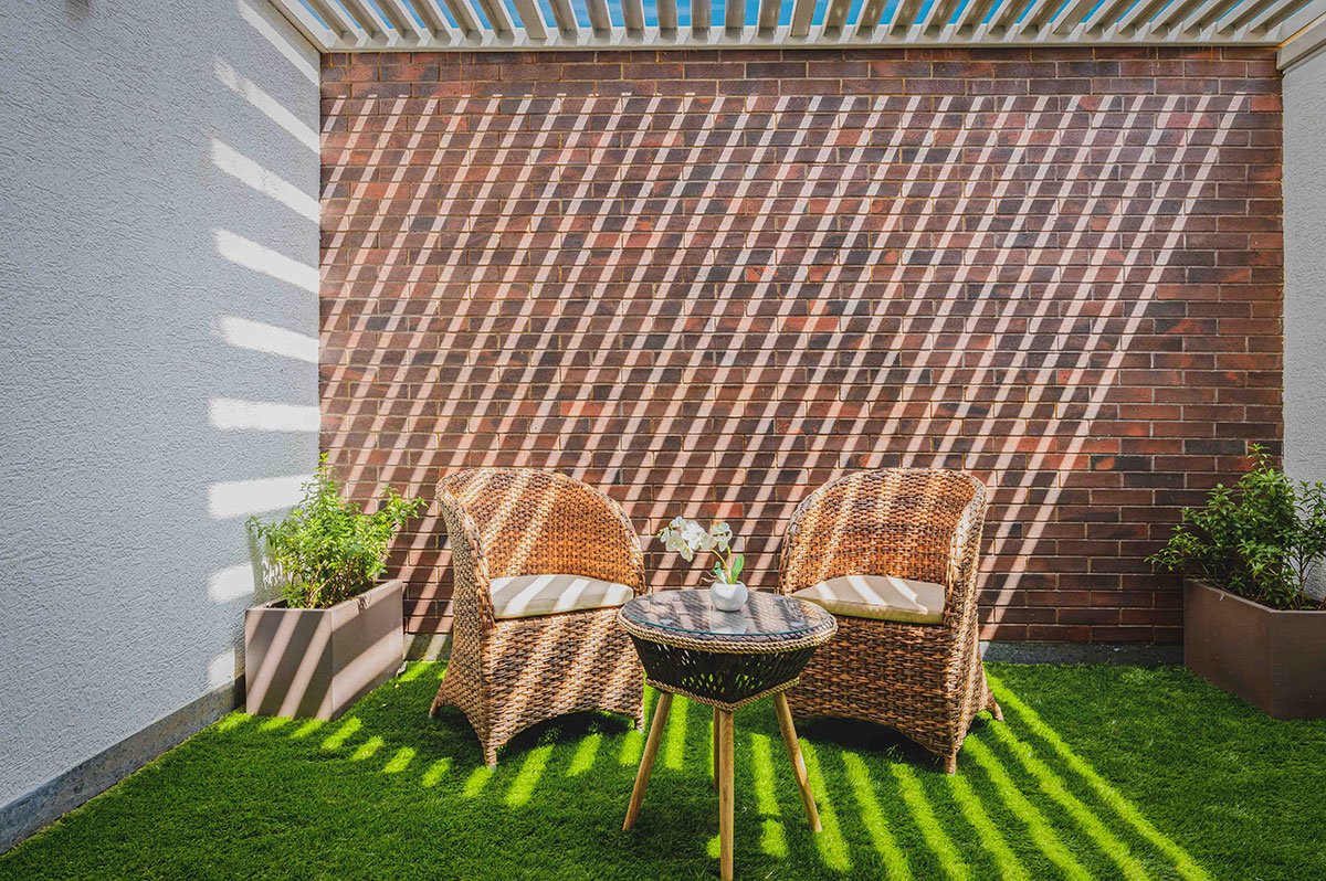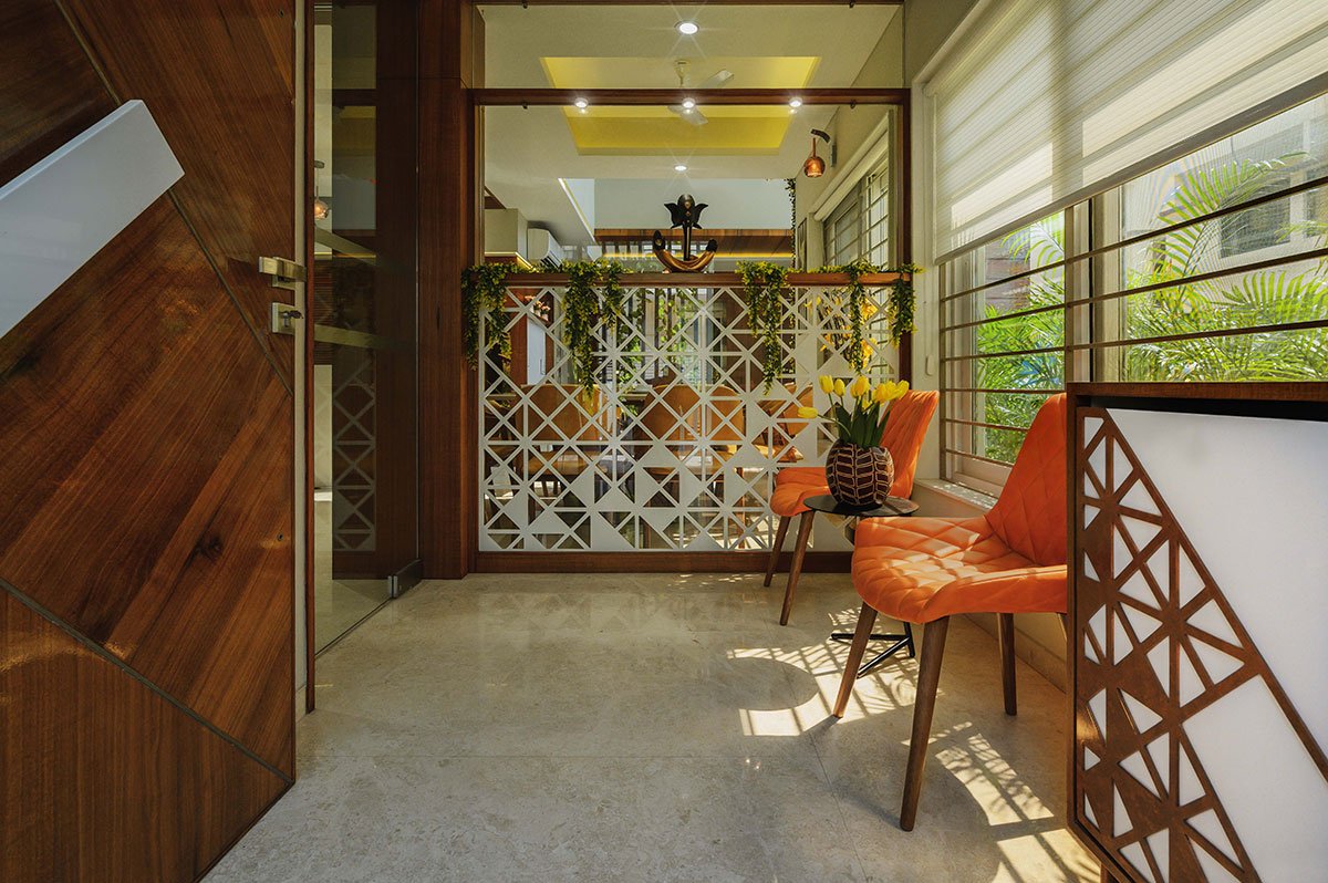 The focal point of this house is a stunning family sitting with a huge void space above connecting the ground floor to the highest ceiling of the house. With an artificial vertical garden in its backdrop, this space becomes even more appealing and colorful. This volume creates a drama of light and shadows through-out the day across the interiors with the triple height window. The parents’ bedroom is drawn towards the south and has its own garden with a pergola. The journey to the upper level happens through the circulation facilities like the staircase and a lift, placed towards the south.