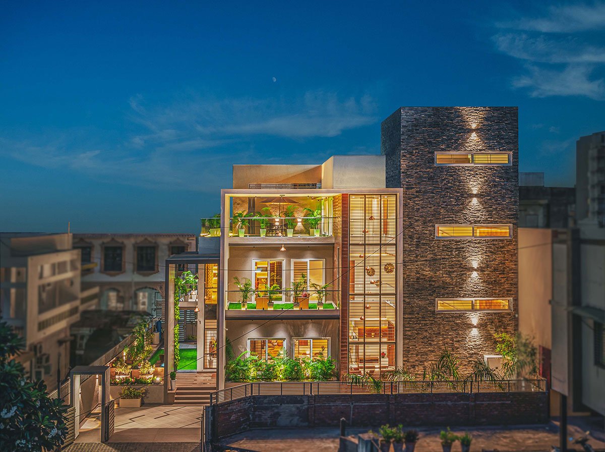 Excerpt: Urban Frame House by Prashant Parmar Architect – Shayona Consultant features a concept of frames intending to maintain the privacy of the user. The residence showcases a dynamic hierarchy of three frames, creating a visually captivating structure with varied volumes. Its harmonious connection with the garden invites natural light into interior spaces, enhancing warmth and vibrancy and creating an inviting atmosphere throughout the home.