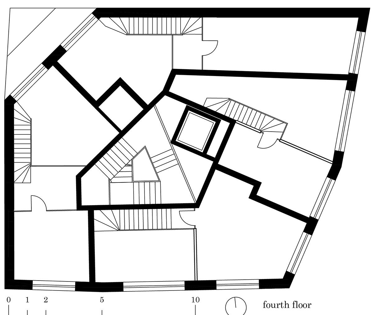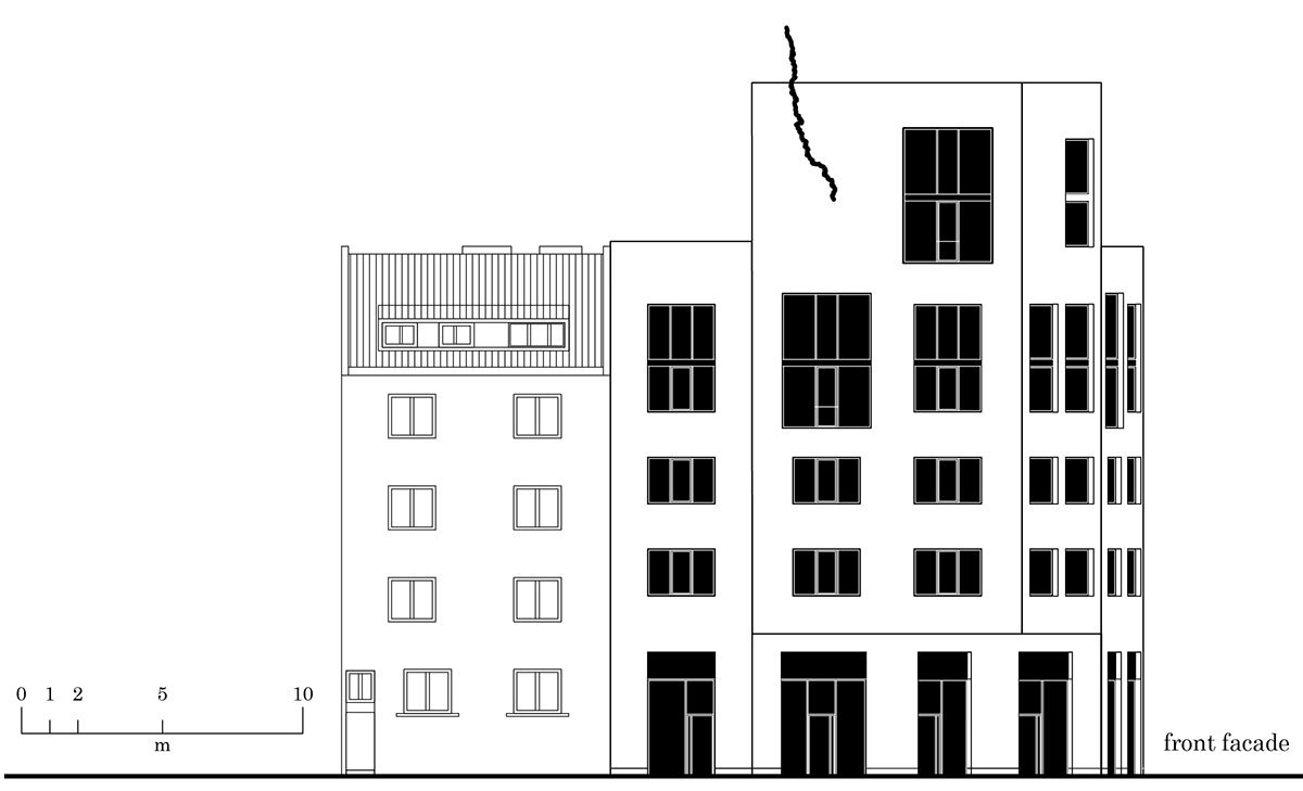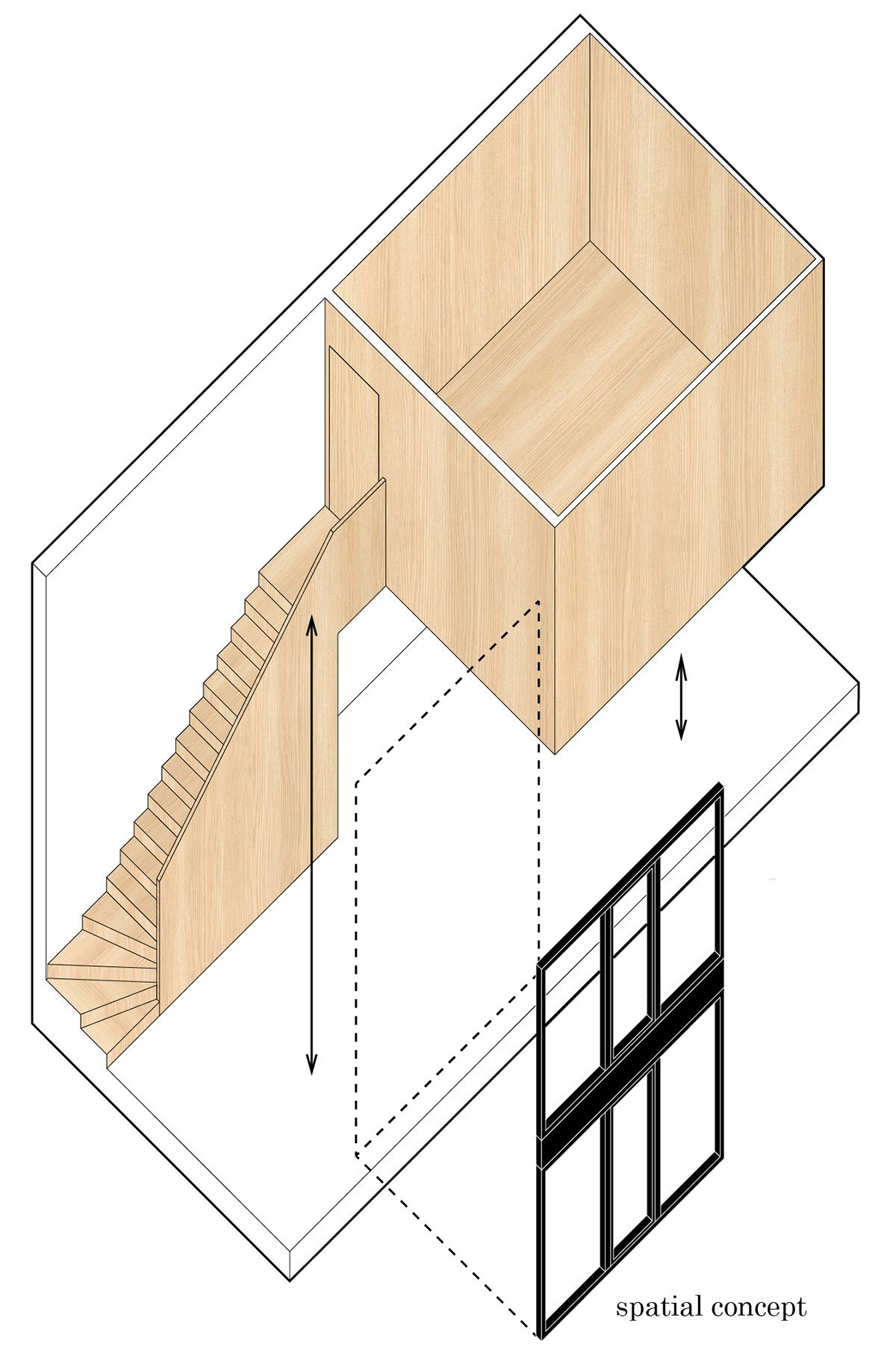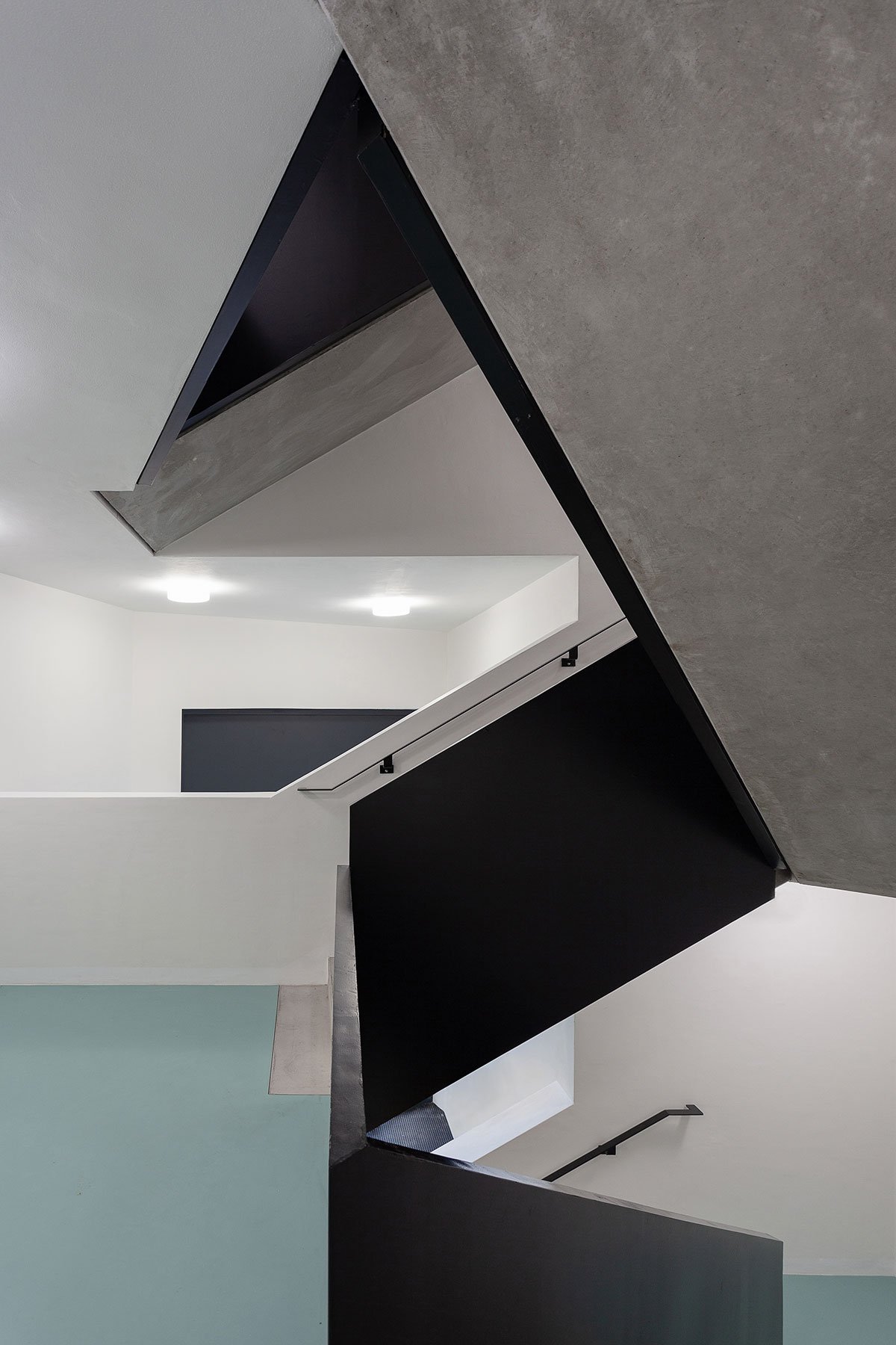 The lofts stand on an unused site, intersecting two buildings. At the heart of the building is a sculptural staircase, connecting the ground floor tenant space. On a limited area of 269 m2, the architects have built a five-story building with a total floor area of 1200 m2, comprising 14 apartments as well as commercial spaces. The lofts offer 8 standard 1-bedroom flats and ateliers on the 1st and 2nd floors and 6 lofts of 1-bedroom to 3-bedroom layouts on the 3rd and 4th floors, with areas ranging from 41 to 91 m2.