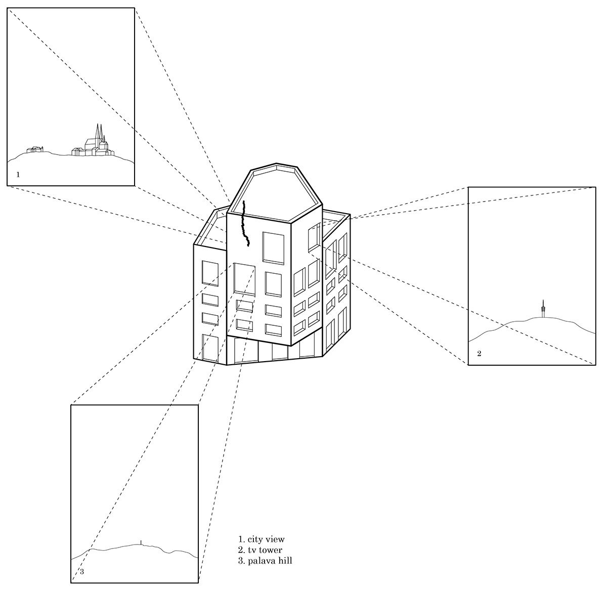 [Text as submitted by architect] The newly designed Urban Infill Lofts commence the revitalization of Brno’s post-industrial district. The building is adorned with a site-specific lighting installation and offers views of the city’s key landmarks.