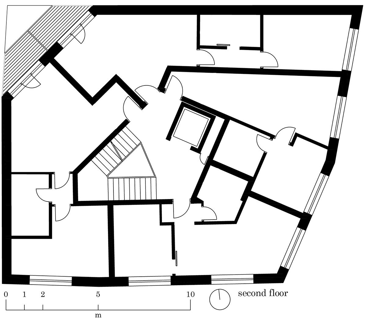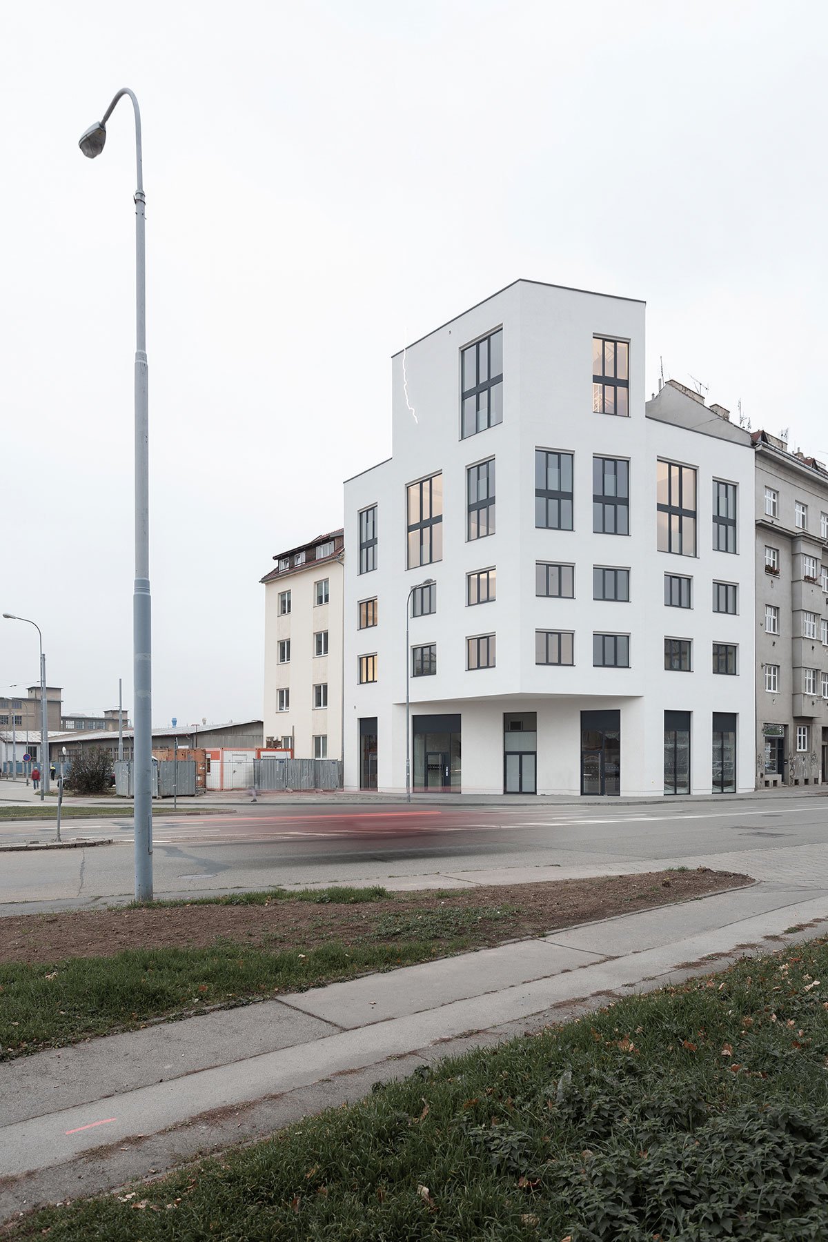 CHYBIK + KRISTOF’s design is twofold; influenced by the historical aspects of the area while simultaneously utilizing modern design elements. The dominant feature of the building are the large windows, a nod to the industrial heritage of the building, accompanied by private terraces. Historically, corner buildings are at the intersection of a main meeting point, and act as visual urban anchors in navigating the city – they are defined by their verticality and the decorative elements that mark their importance.
