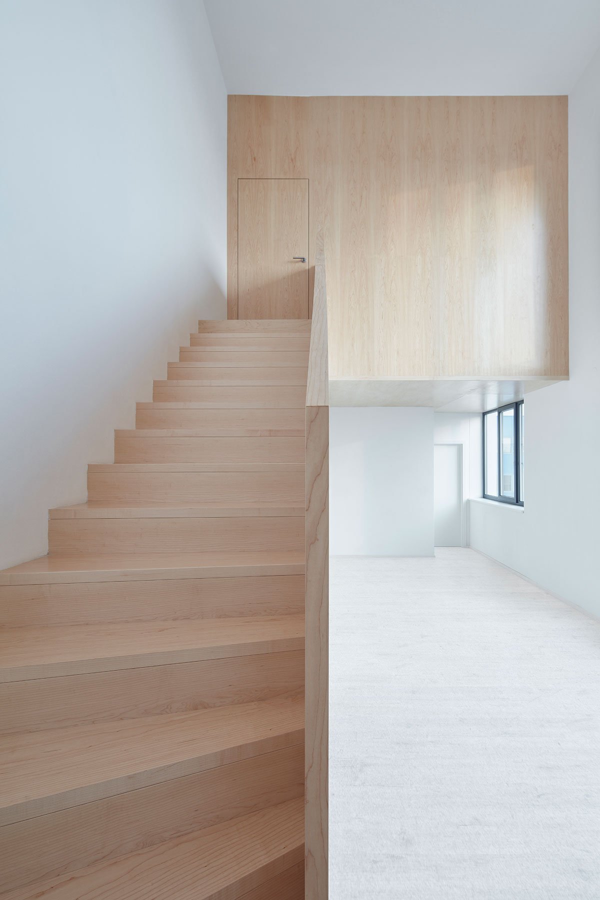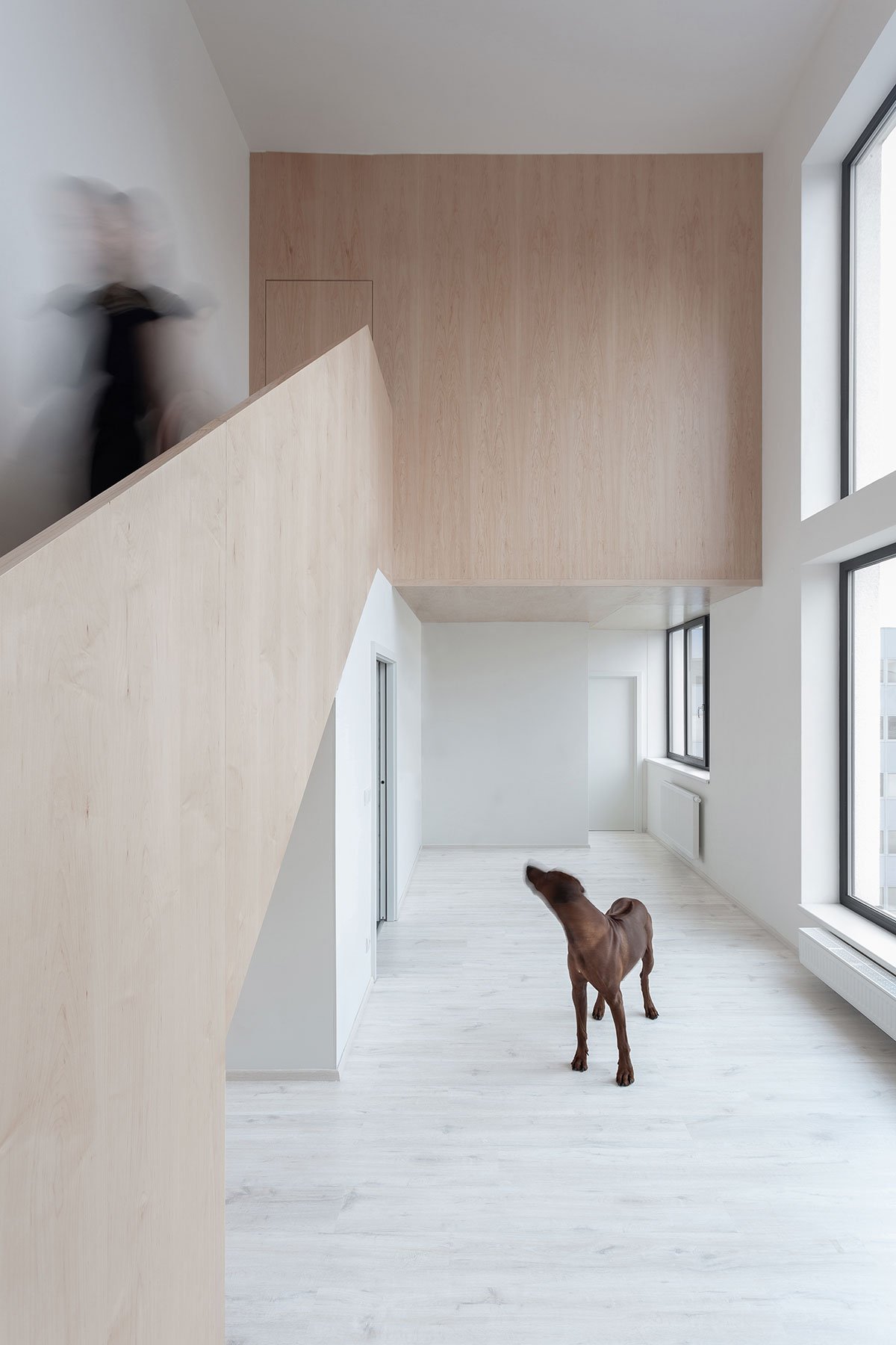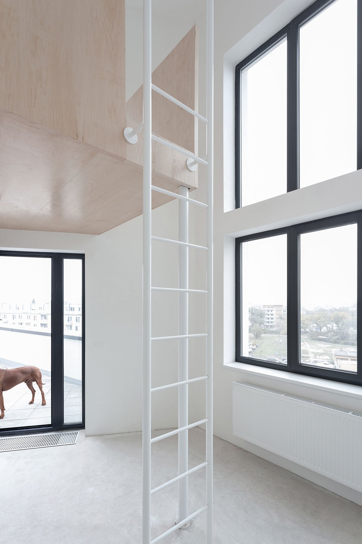 The building was constructed with a cohesive selection of materials, creating a fluid palette of reinforced concrete, ash wood, and sleek white walls. The design conscious lofts are affordable and available to a broader demographic. “The socially integrated strategy informed the interior design of the building. Through using more affordable materials, we were able to open the spacious lofts to a diverse spectrum of inhabitants.” Ondřej Chybík explains.