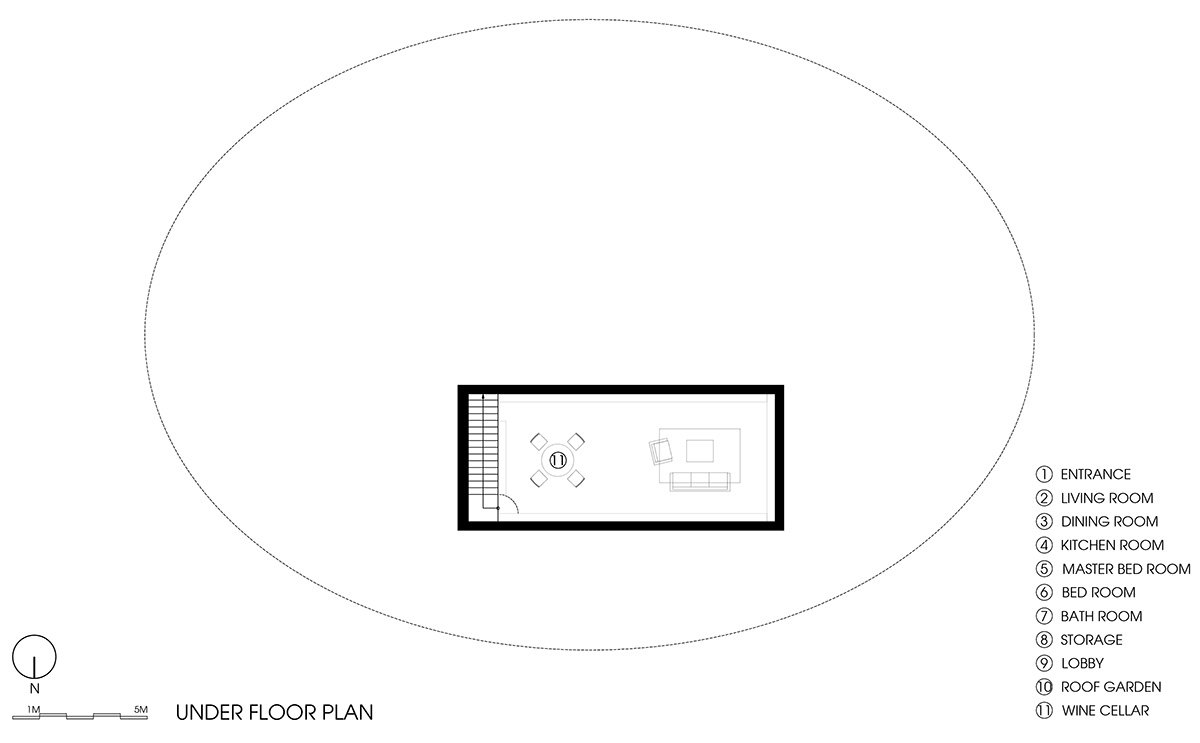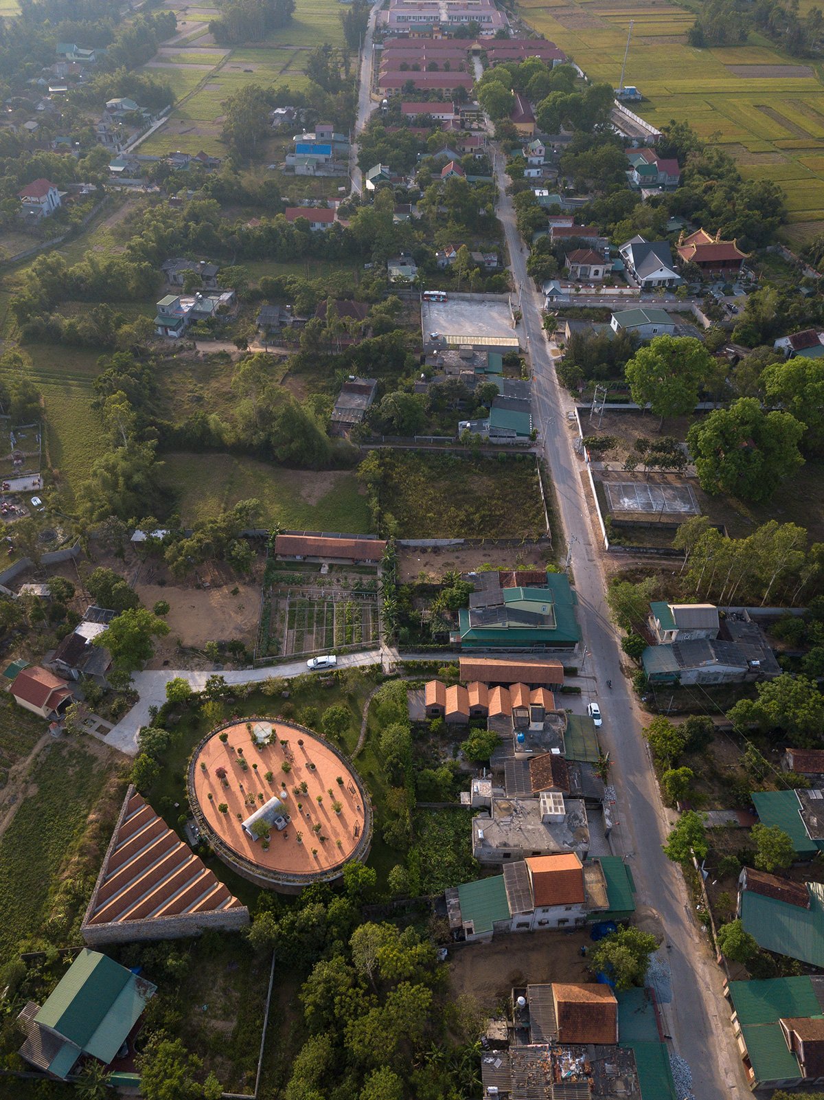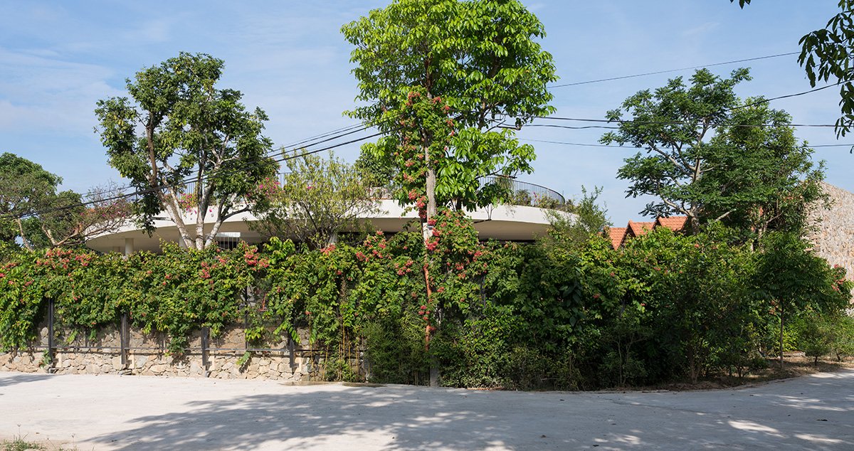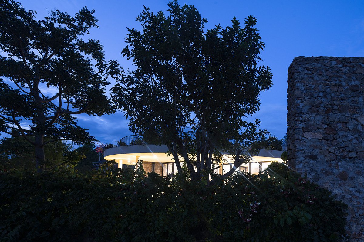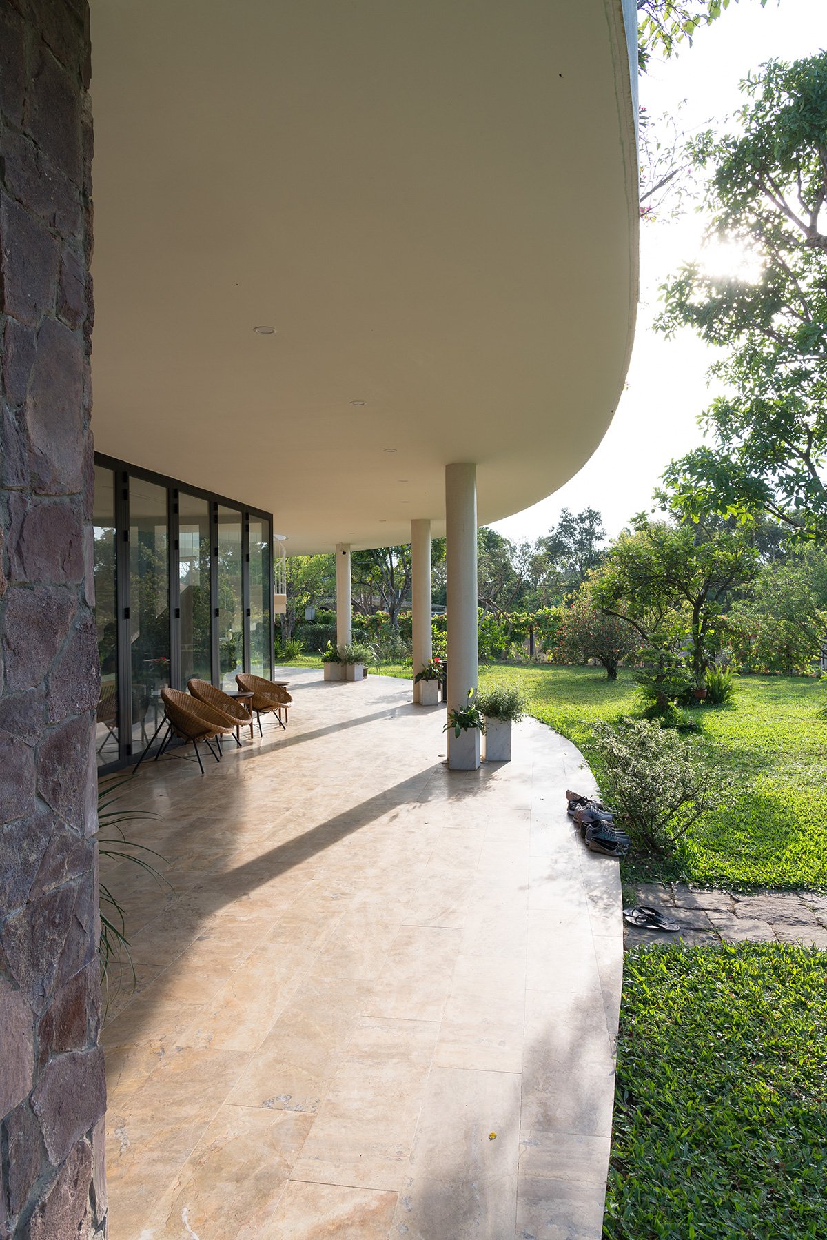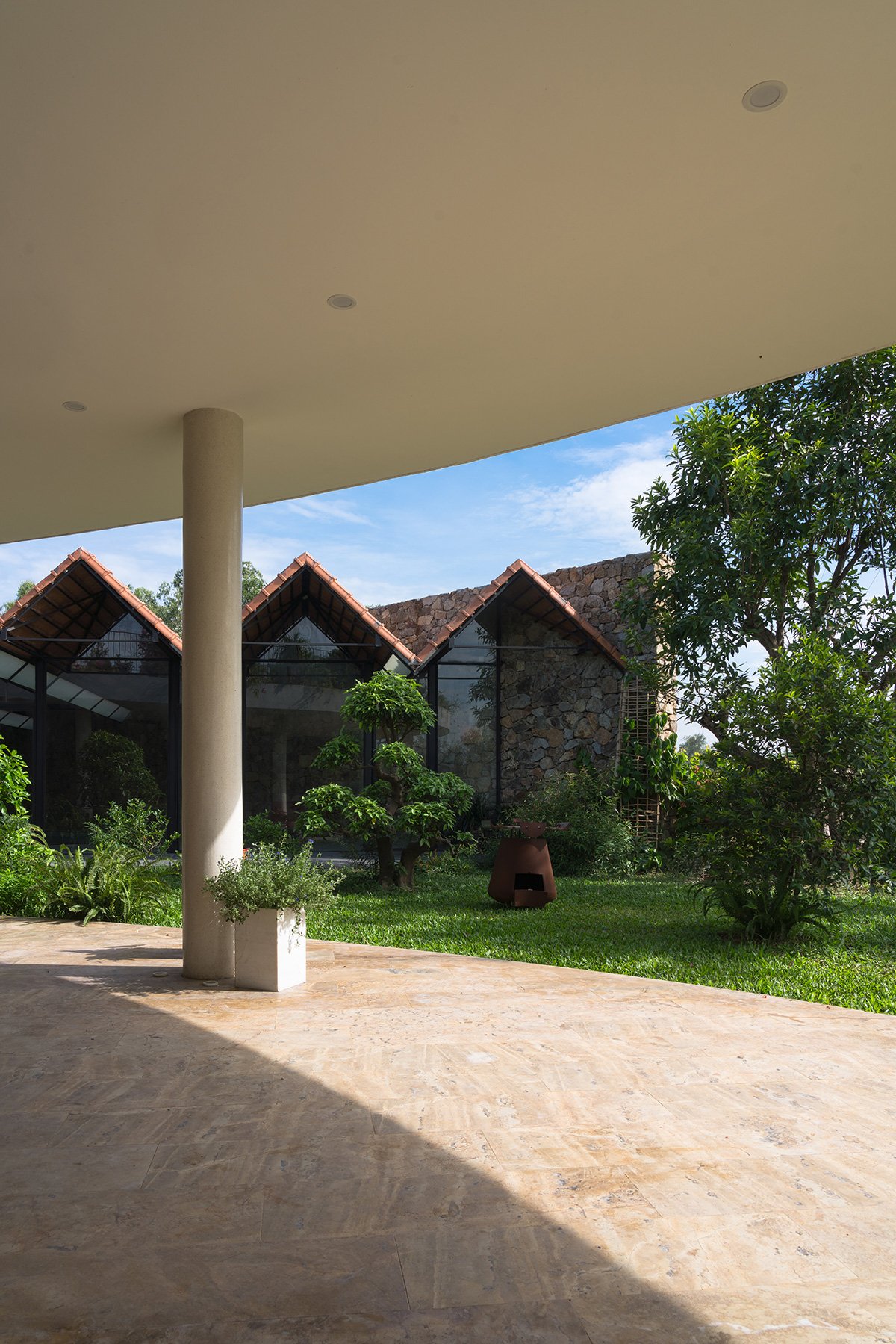 The main building is a large elliptical shape, like a vault of heaven, which covers the whole house and its shadow as a time clock in natural light. This “vault of heaven” is held up and divided into private and public spaces by 4 solid stone walls representing the east, west, south, and north. In particular, the eaves are designed around the elliptical block that imitates the eaves of an ancient Vietnamese house. This is the space that transitions the inner part of man to the nature outside and also the place where all the main activities of the house take place. The heart of the house is full of philosophy; it is arranged as a solid rock to remind us of solidarity, sticking together in the family.