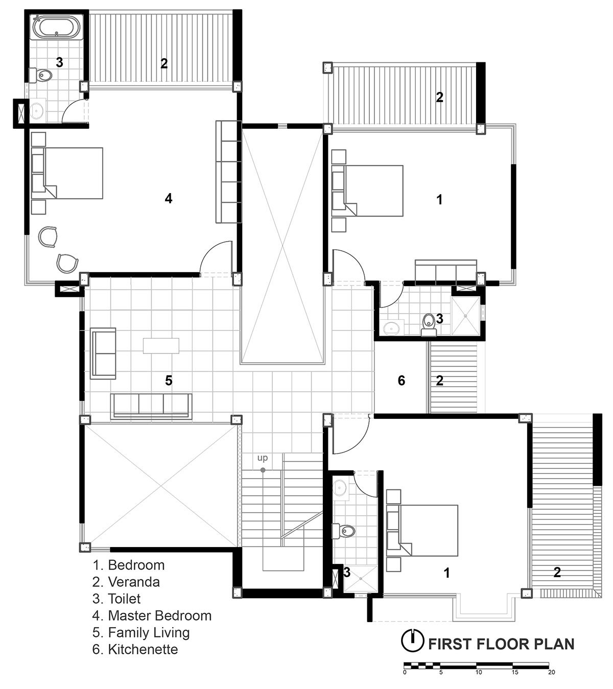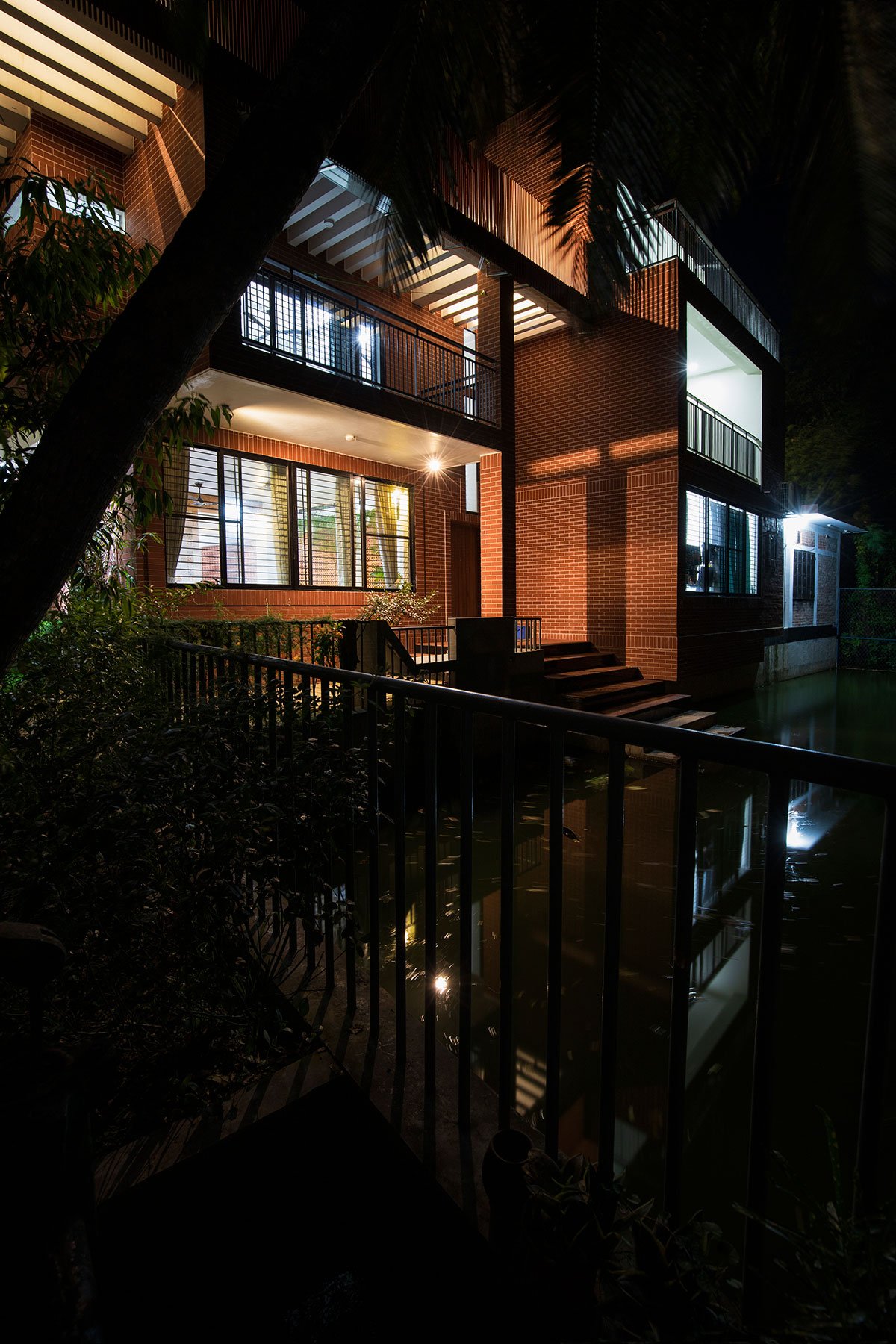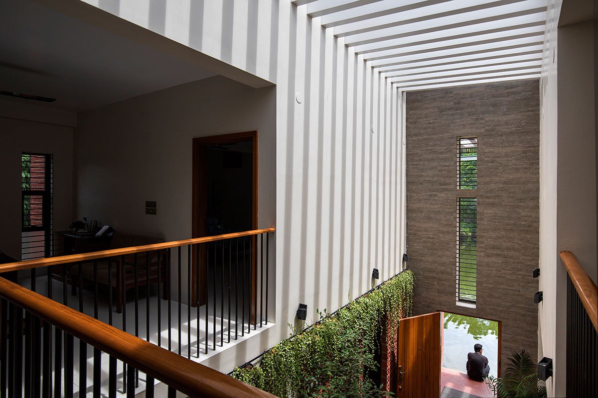 Glancing at the area from the northern side, the house seems to be a floating pond house. Alongside the peaceful outdoor spaces, large north-facing balconies, which almost touch the pond, and the roof terrace let the villa residents enjoy the monsoon, alongside the surrounding nature season, to the fullest. Despite the narrowness of the building envelope, the interior spaces did not compromise on the ingress and movement of light or air circulation. The design also took advantage of the longitudinal north-south orientation.
