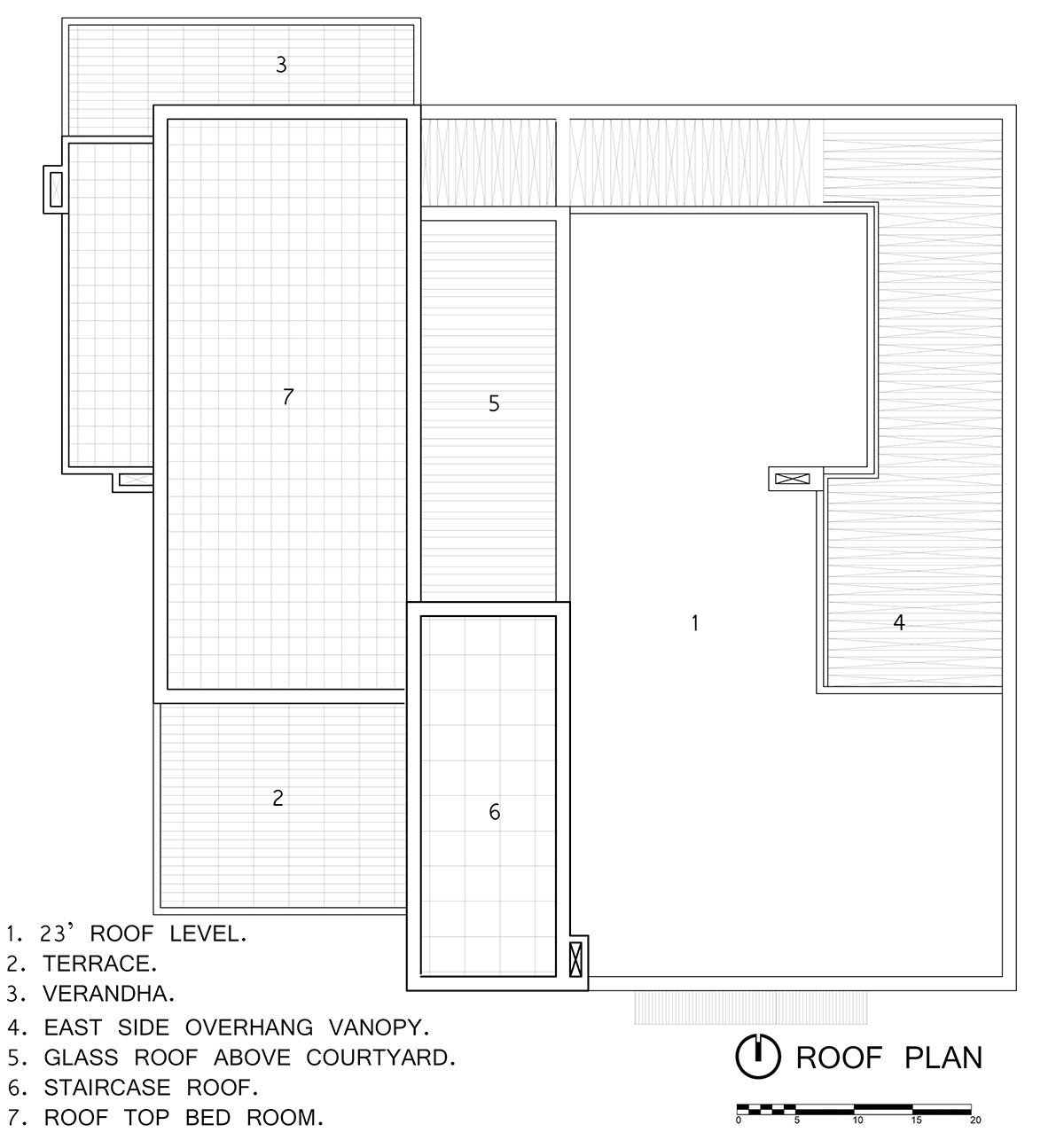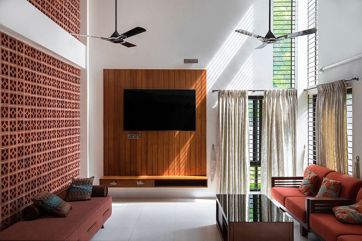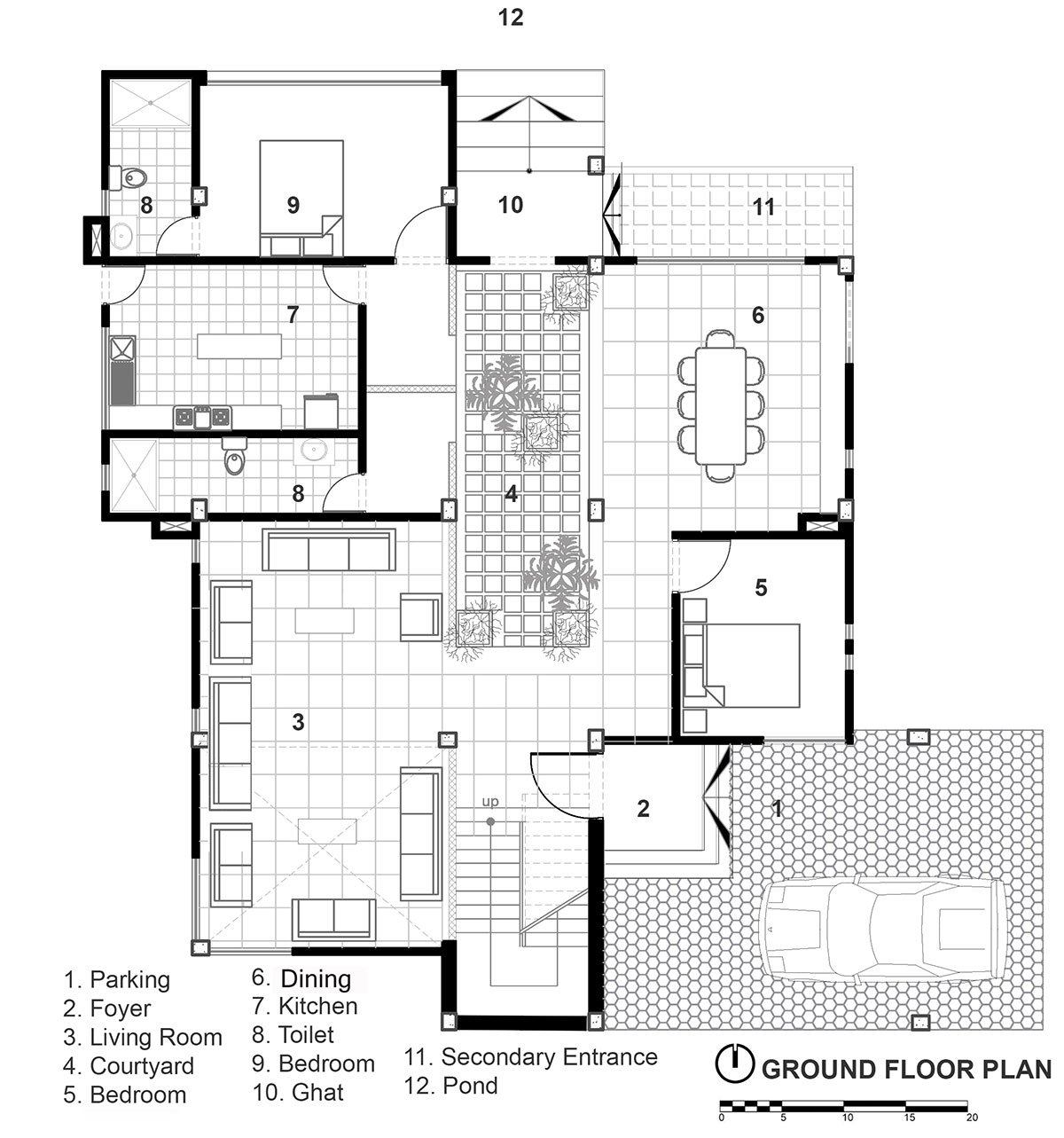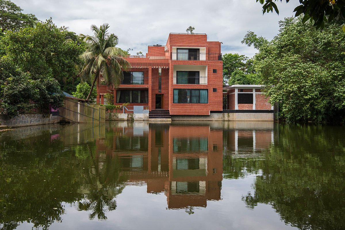 Considering the context of this site, the house is positioned in a manner that allows it to have an intimate dialogue with the surrounding green exquisiteness. Placed next to a pond, it seems as if the villa has ascended from the water of the lagoon, with a Ghat creating the bond between the two. Built perpendicularly on the north-south face, this house is designed in such a way that an abundance of natural light and fresh air can enter the house. A large-scale canopy has been constructed on the south-east edge to control the excessive heat during summer, leaving its interior cold and relaxing. The rest of the service areas, including the kitchen and toilets, have been placed on the west wing of the villa to serve the same purpose.