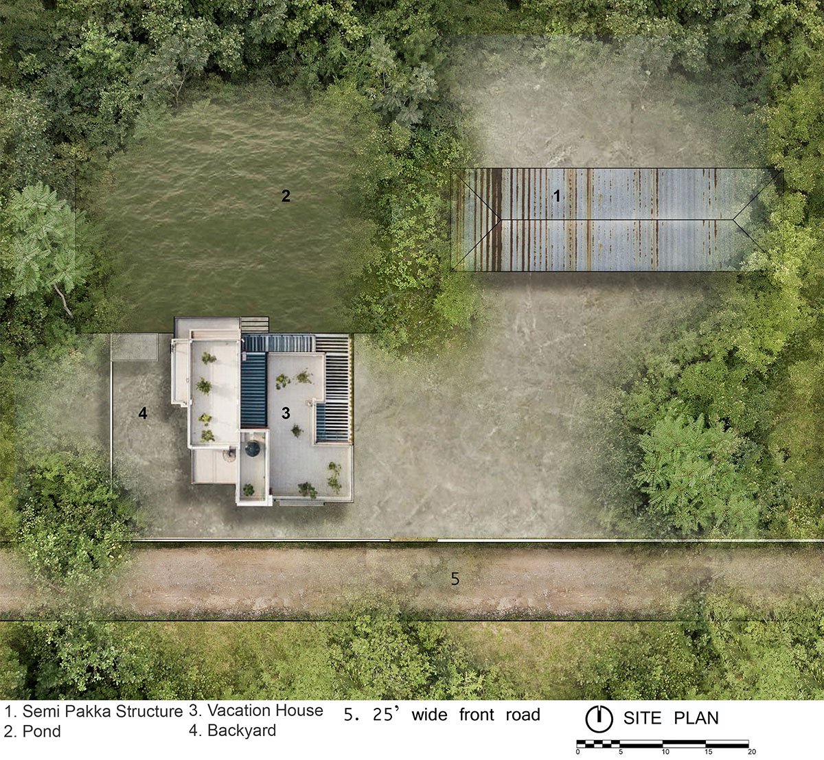 This vacation house is constructed on a land area of 2.5 acres and a plot area of 8,000 square feet. On this 2.5-acre parcel of land, there is a semi-pucca house on the north-east side, while a pond is located on the northwest side. The client wanted to build a two-story vacation house on the remaining 8,000 square feet of the total land area. The client wished to build a house that would relieve him from his regular city life, chaos, and stress when he visits it.