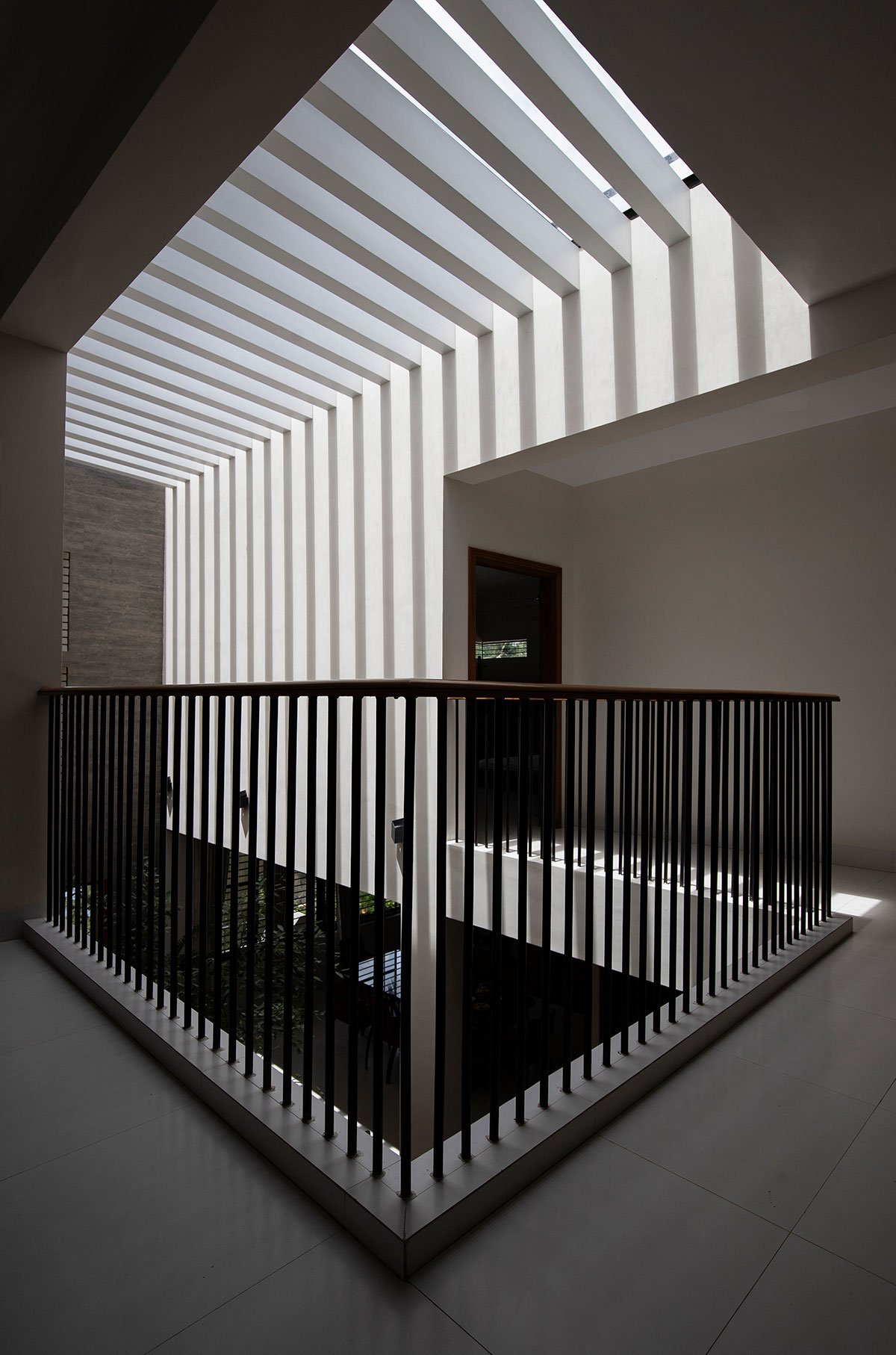 A staircase facing towards the courtyard, leading to the first floor. The designers also liked the idea of the courtyard because they wanted to connect the outdoors to the indoors so anyone who entered the house would feel like they were in touch with nature. This courtyard also helped to organize nature and light within the built space. The courtyard’s roof was constructed in such a way that as the sun moves during the day, the area’s light and shadow patterns alter. This planned construction enables the client to enjoy the light play the whole day from his common areas.