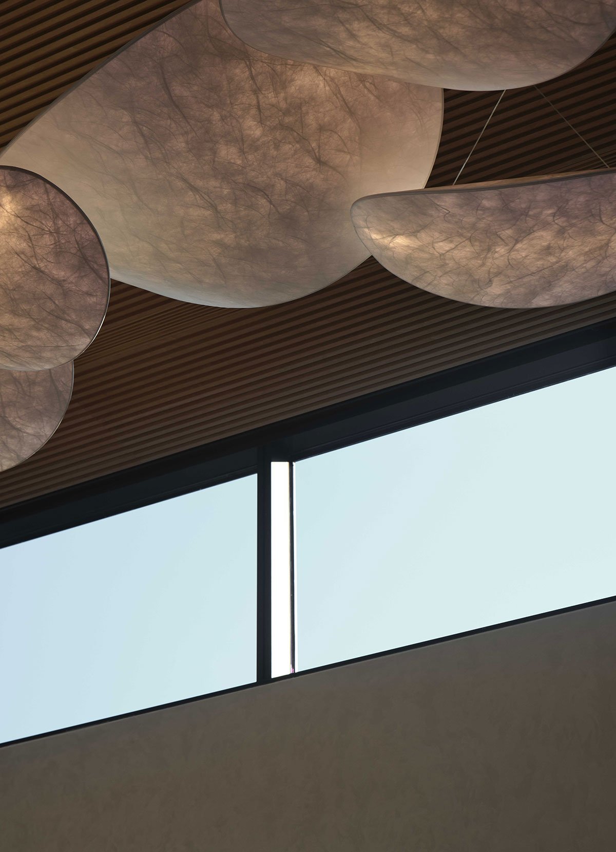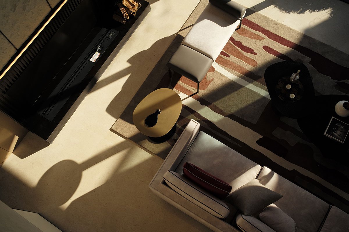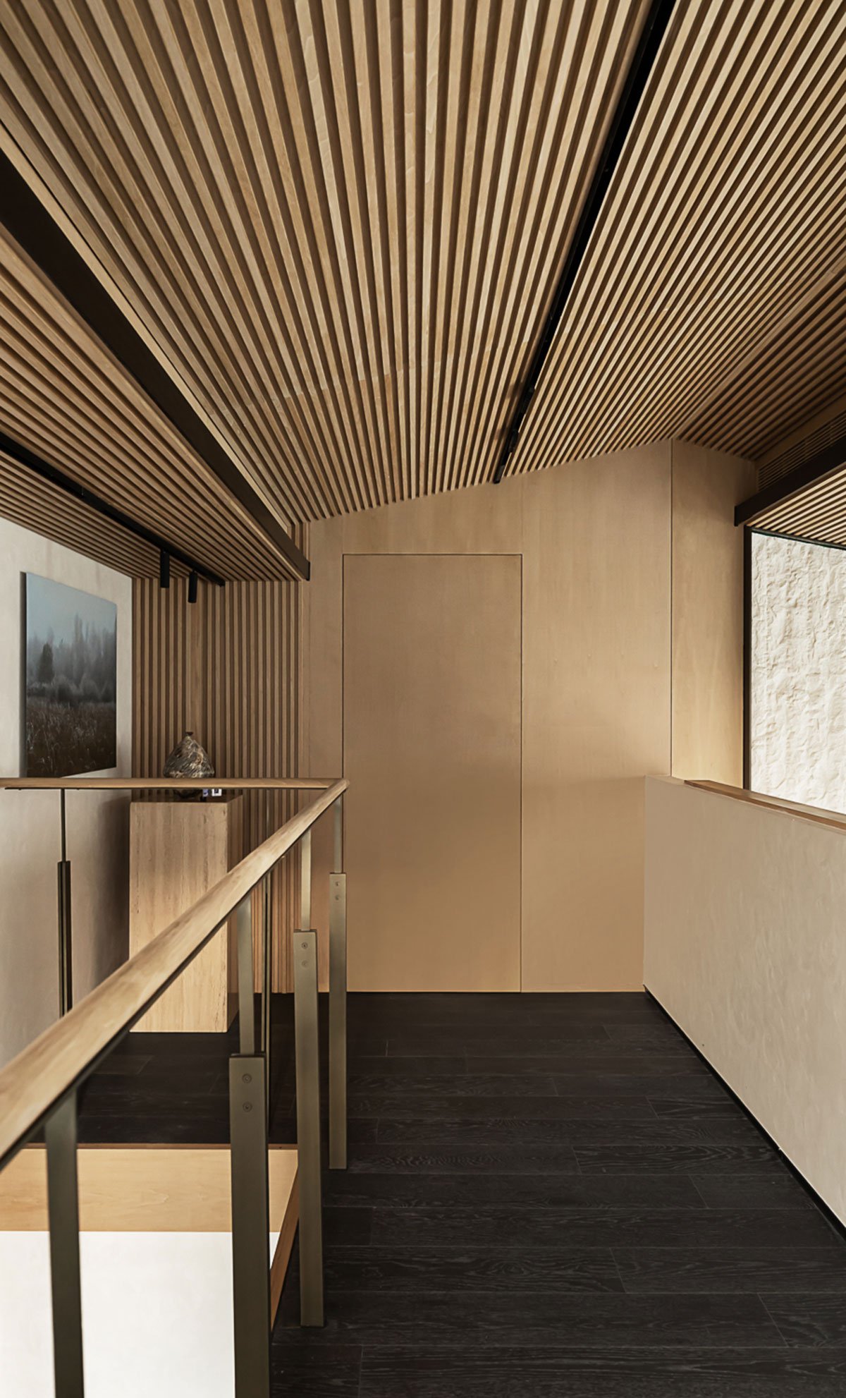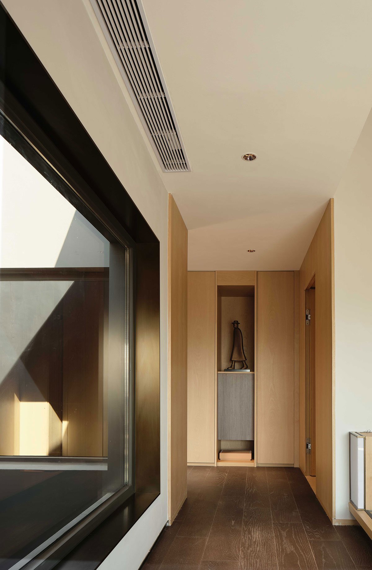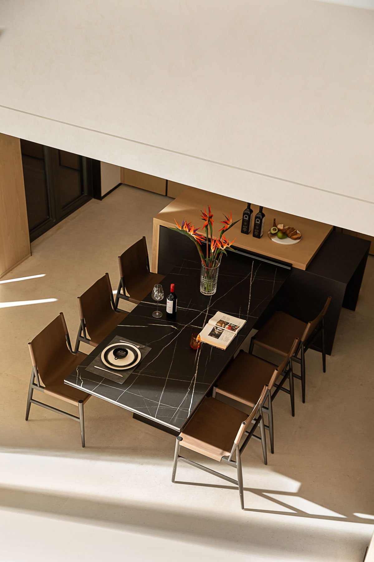 Stepping into the entrance from the north courtyard, the 4.9m high open and spacious living room breaks the conventional fixed layout of residential buildings. The TV is no longer the core of the living room but is replaced by the courtyard, nature and sky.