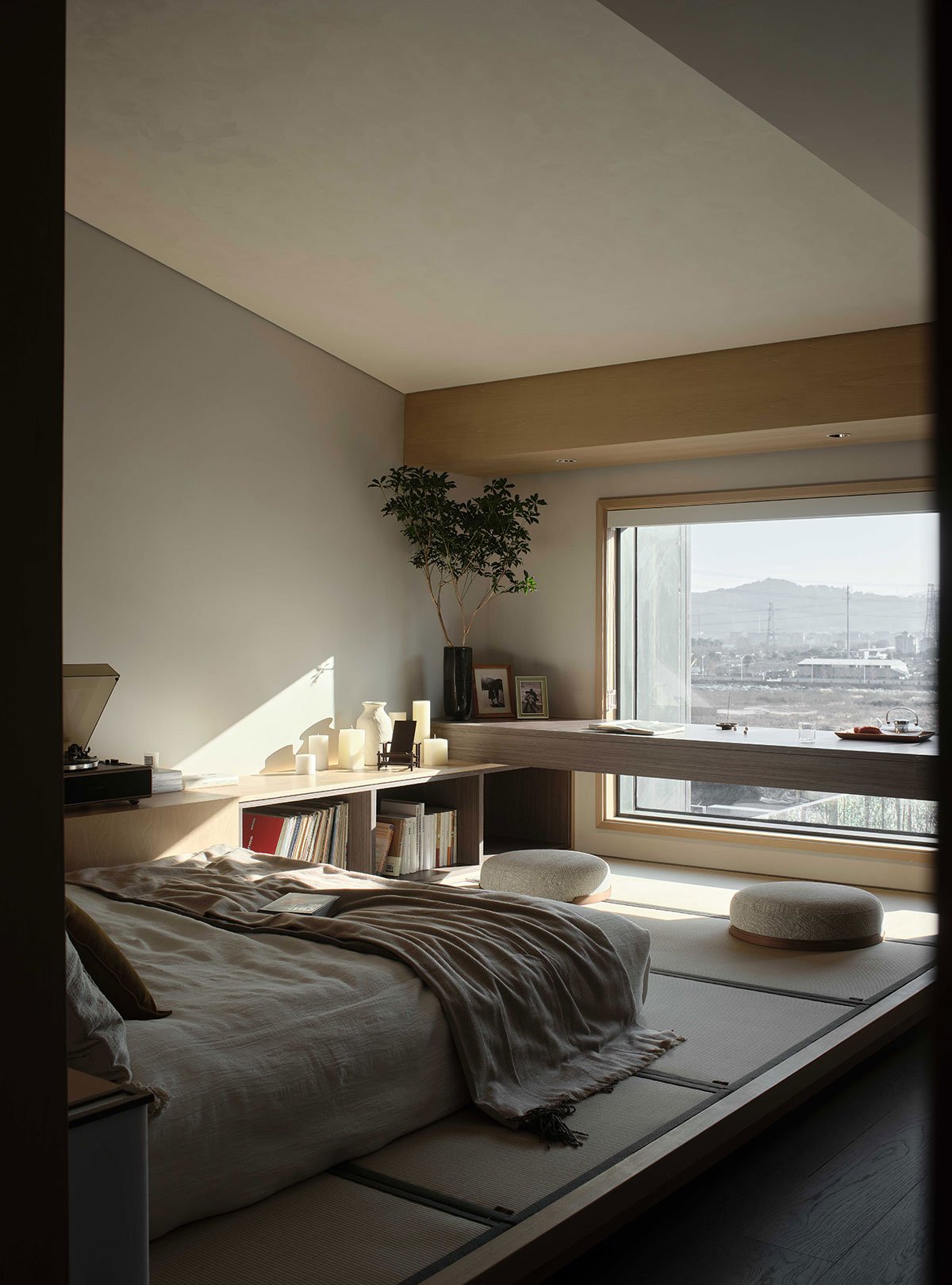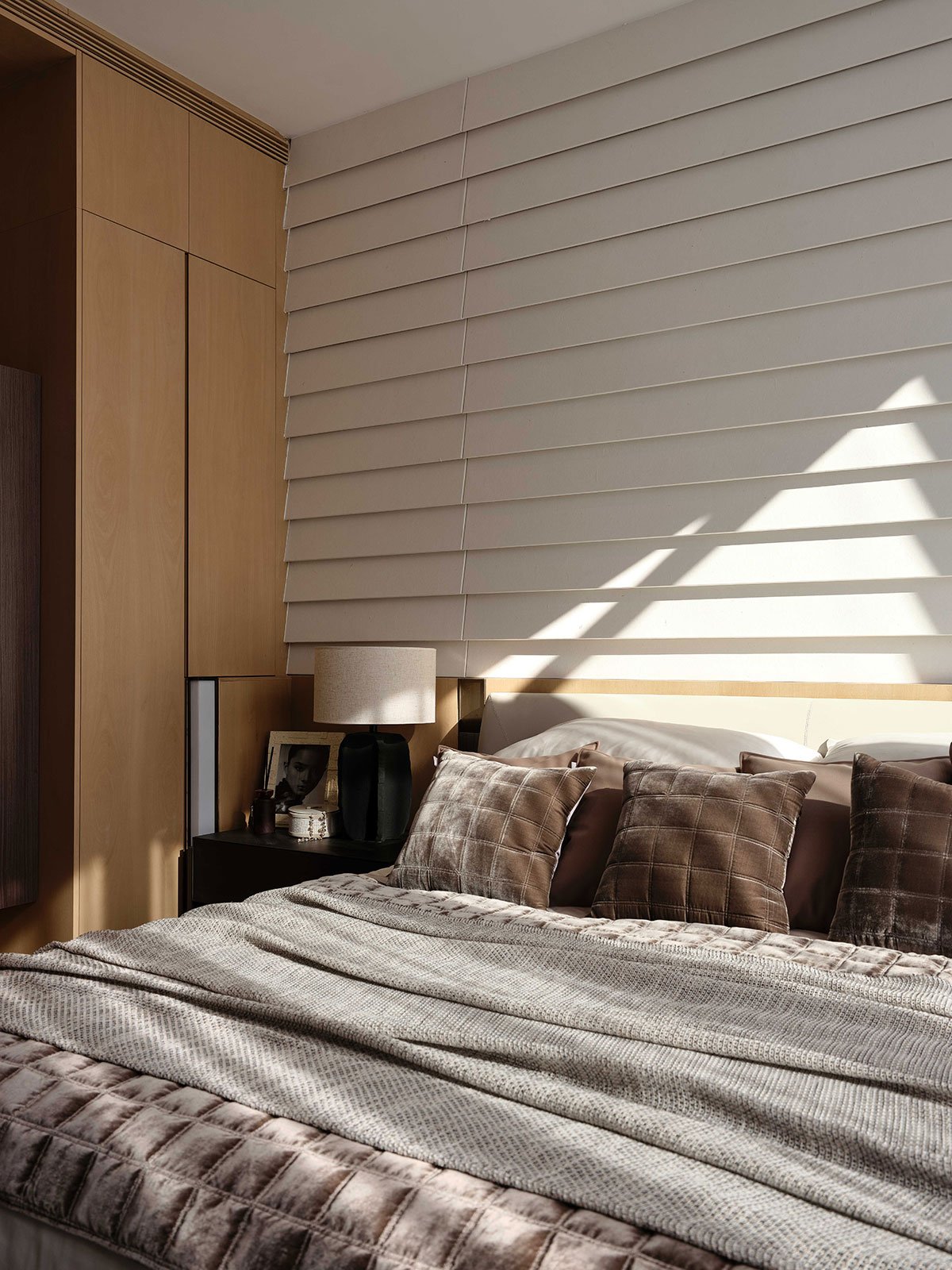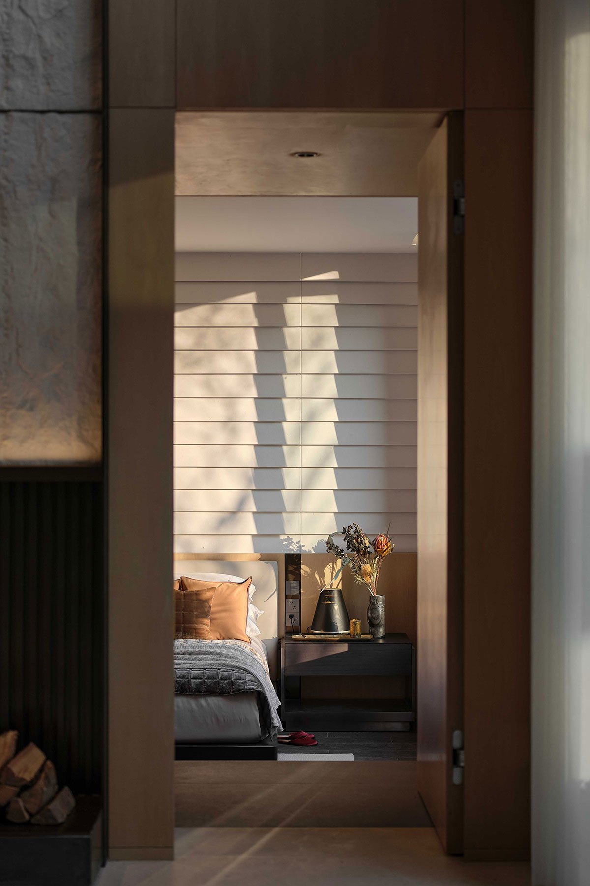 Stepping into the sunken master bedroom, the gentle breeze lifts the curtains, just level with the courtyard view. Continuing the design concept of the living room, the TV background wall of the master bedroom is replaced by the vibrant inner courtyard.