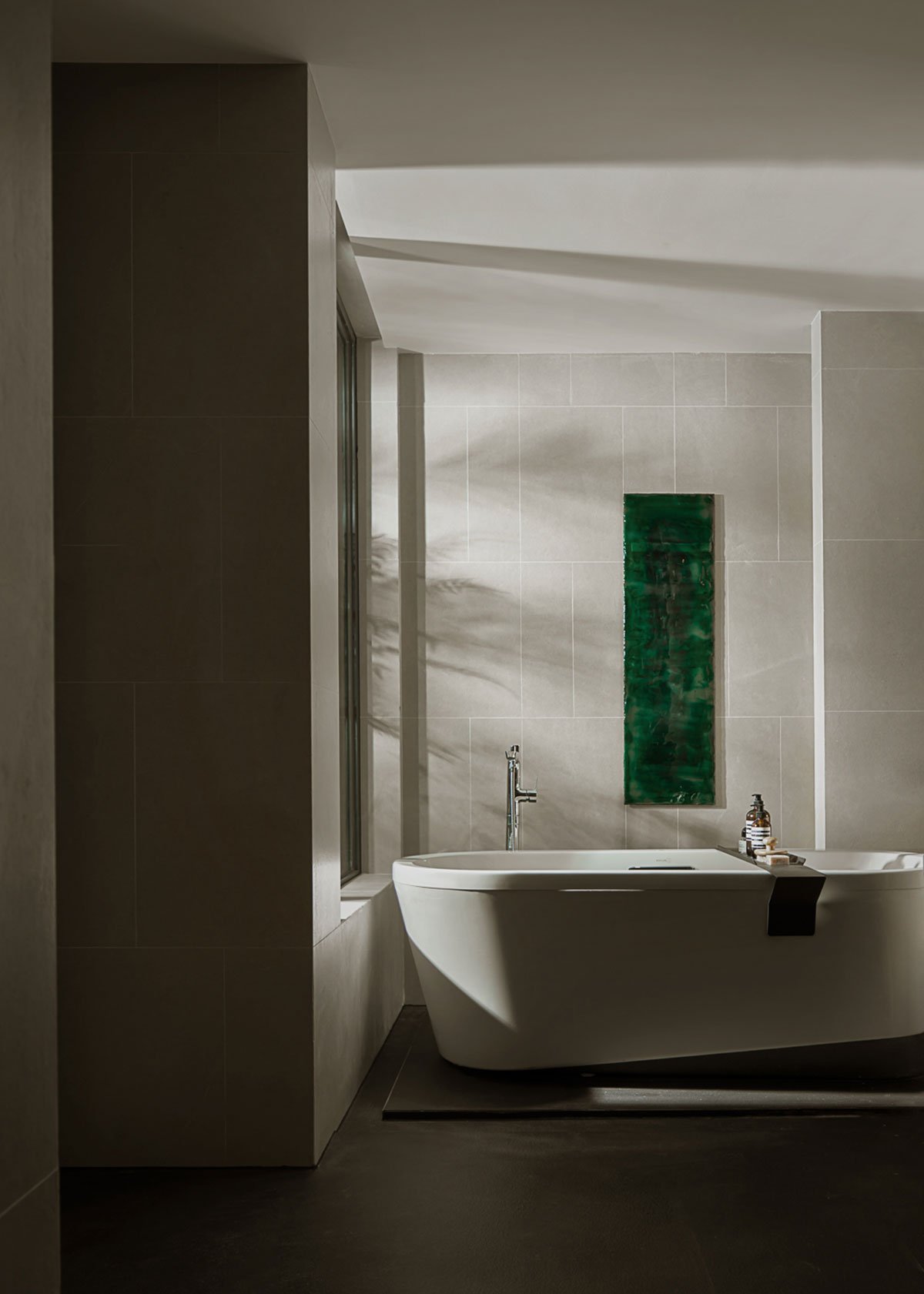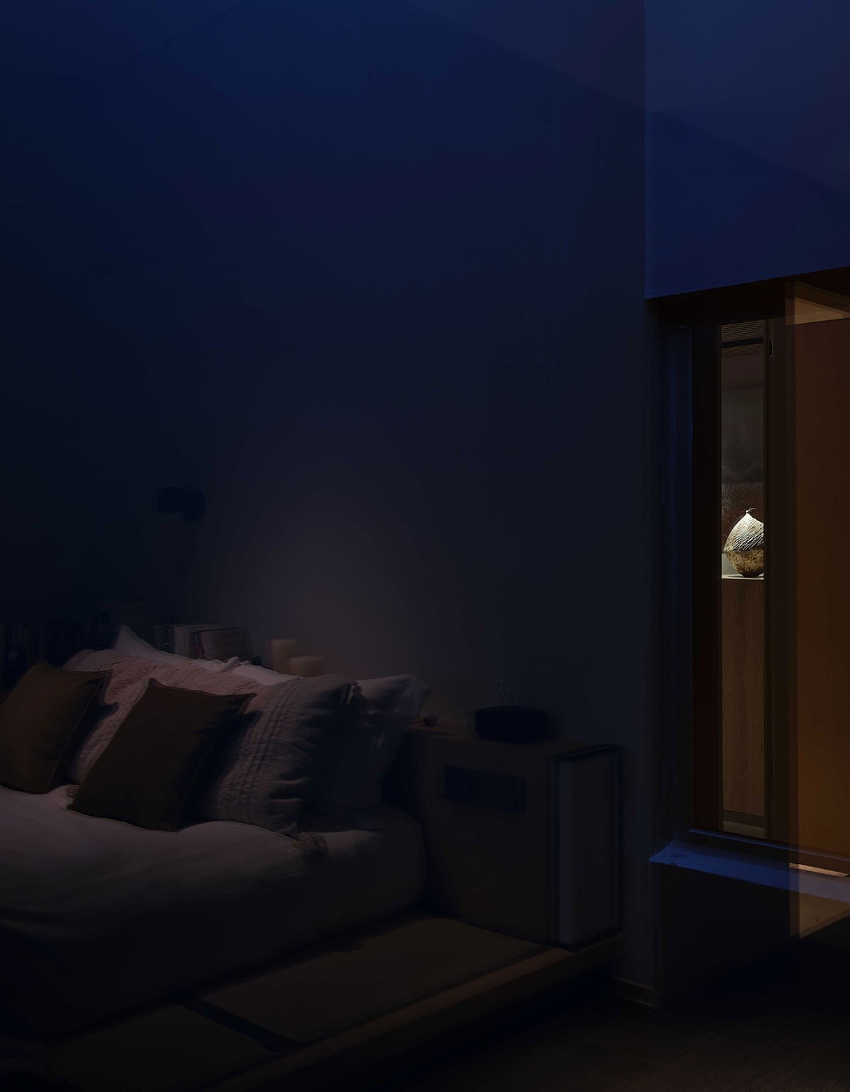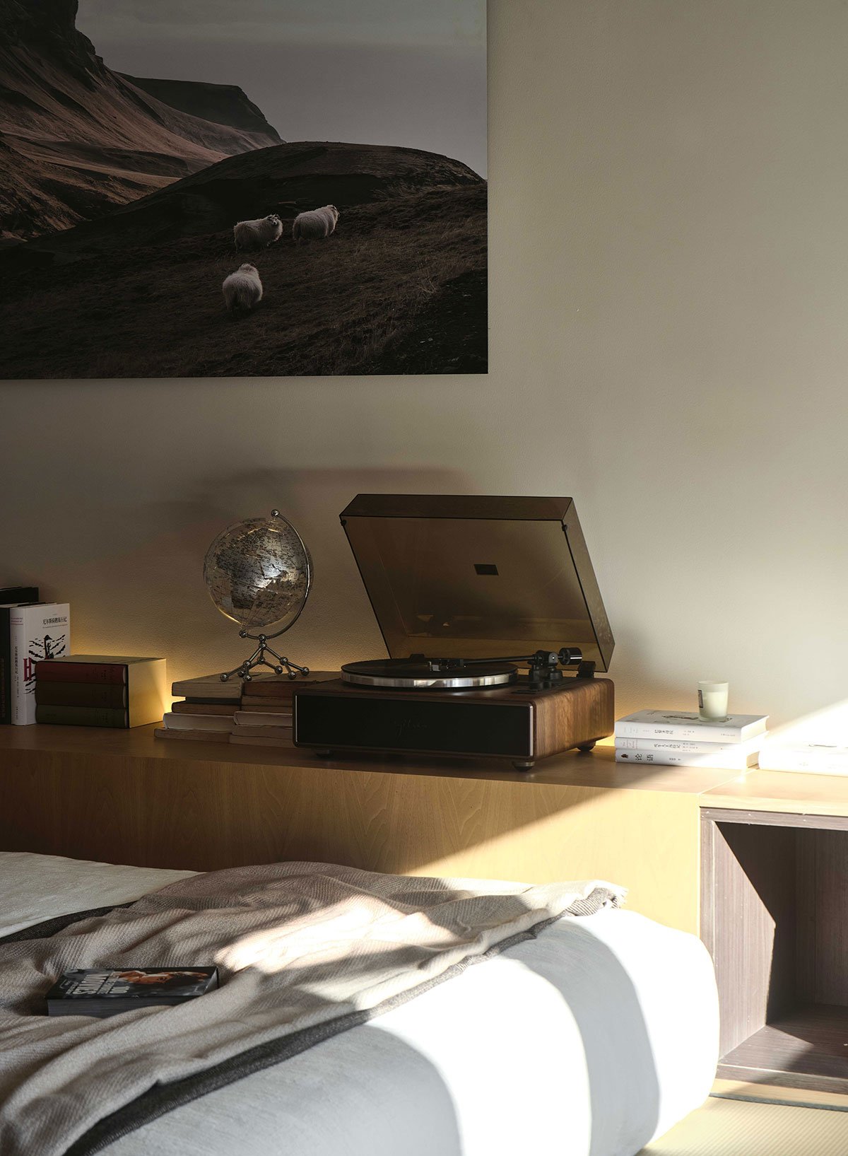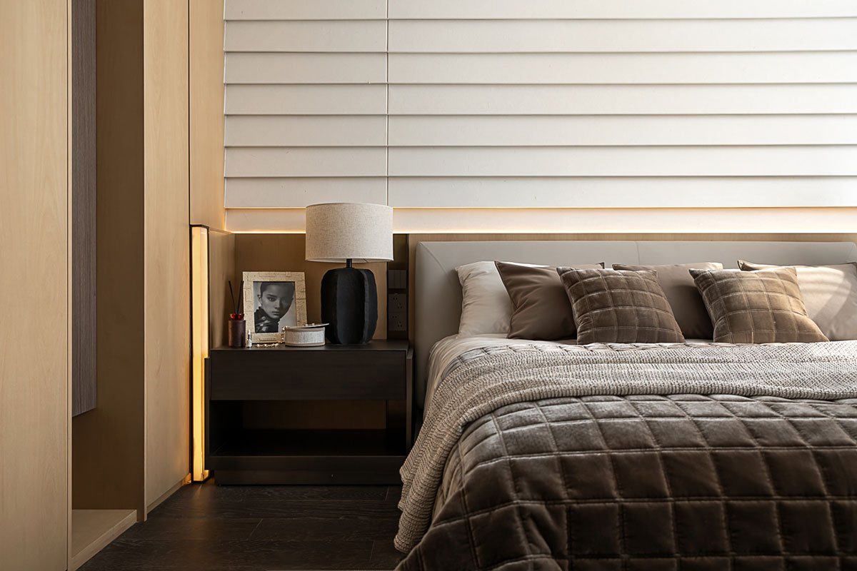 Stepping into the sunken master bedroom, the gentle breeze lifts the curtains, just level with the courtyard view. Continuing the design concept of the living room, the TV background wall of the master bedroom is replaced by the vibrant inner courtyard.