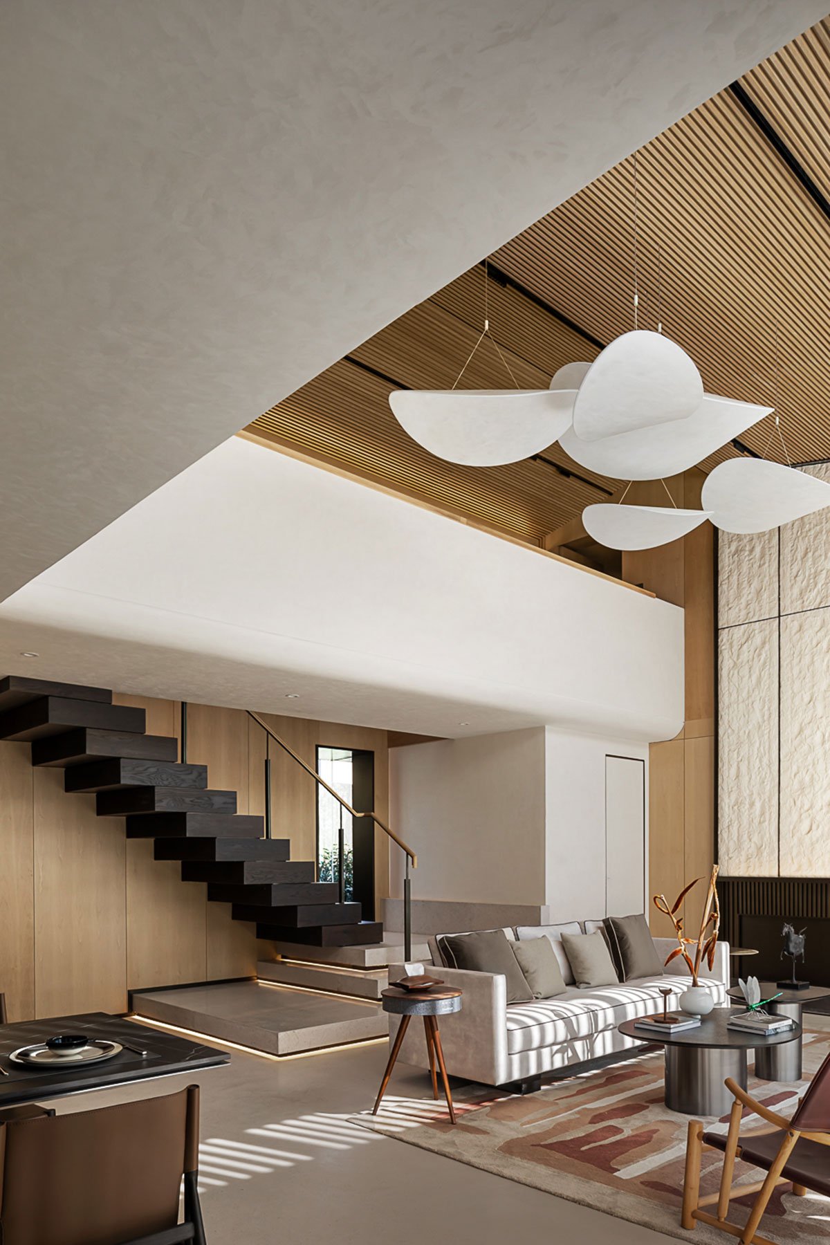Excerpt: Vanke Wonderland City Villa, a home interior by WJ Studio, connects the city and nature with a sky courtyard, seeking nature and comfort in the abundance of materials and tranquillity in the modern living experience. The house provides spacious natural landscapes and modern, comfortable living spaces for residents with supporting facilities to meet the needs of modern life.