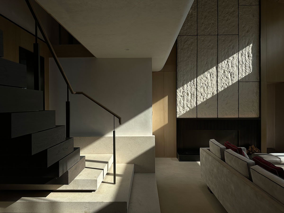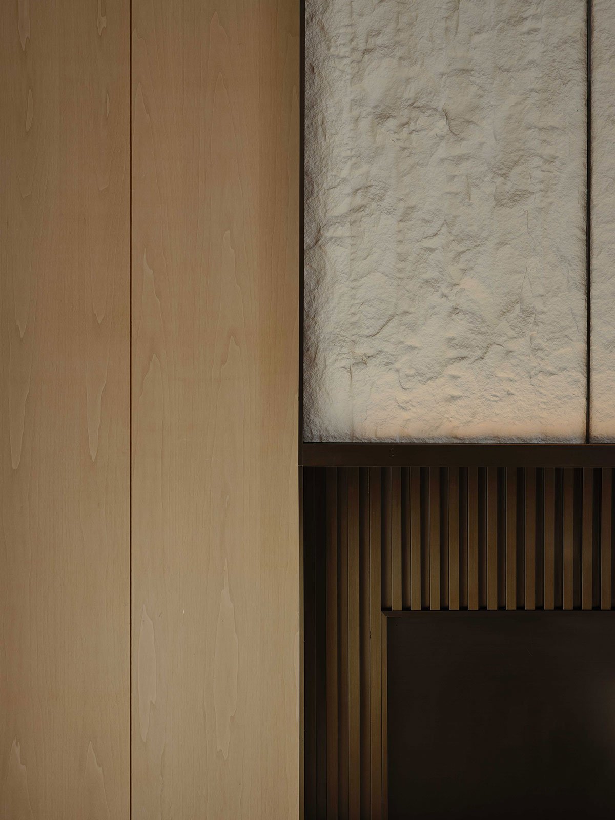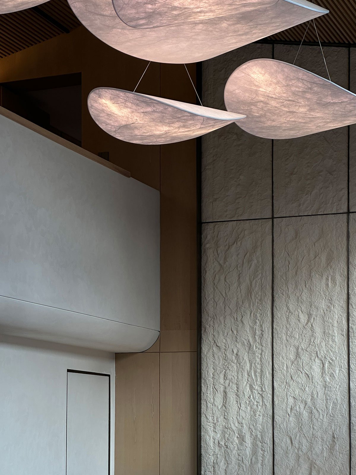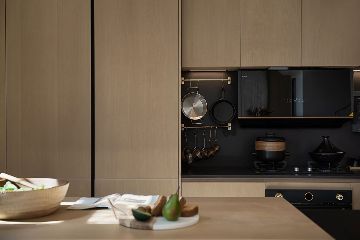 When the light falls on the main background wall above the fireplace, time is also imprinted. The stone sculpture wall and rice paper lamp, the hard and coarse grain and the soft and gentle materials are connected by the injected light, together creating a leisurely and comfortable place. The dining room and kitchen are integrated into the design, making the kitchen no longer an isolated, enclosed space but combining the island counter and dining table to expand into a social venue for communication, sharing and banquet hosting, giving the space more complexity and possibility.