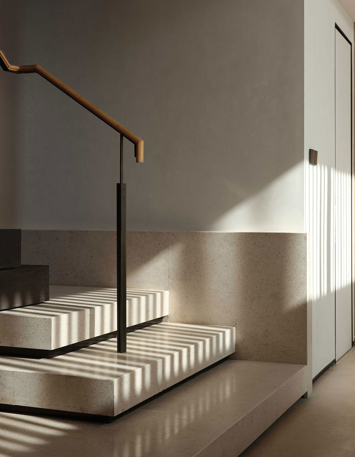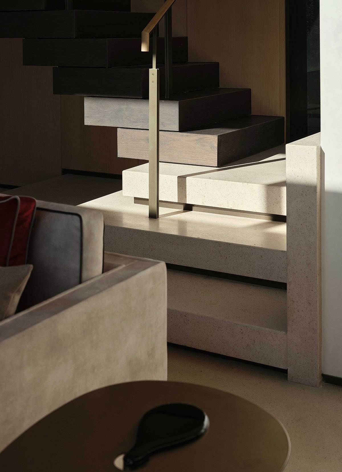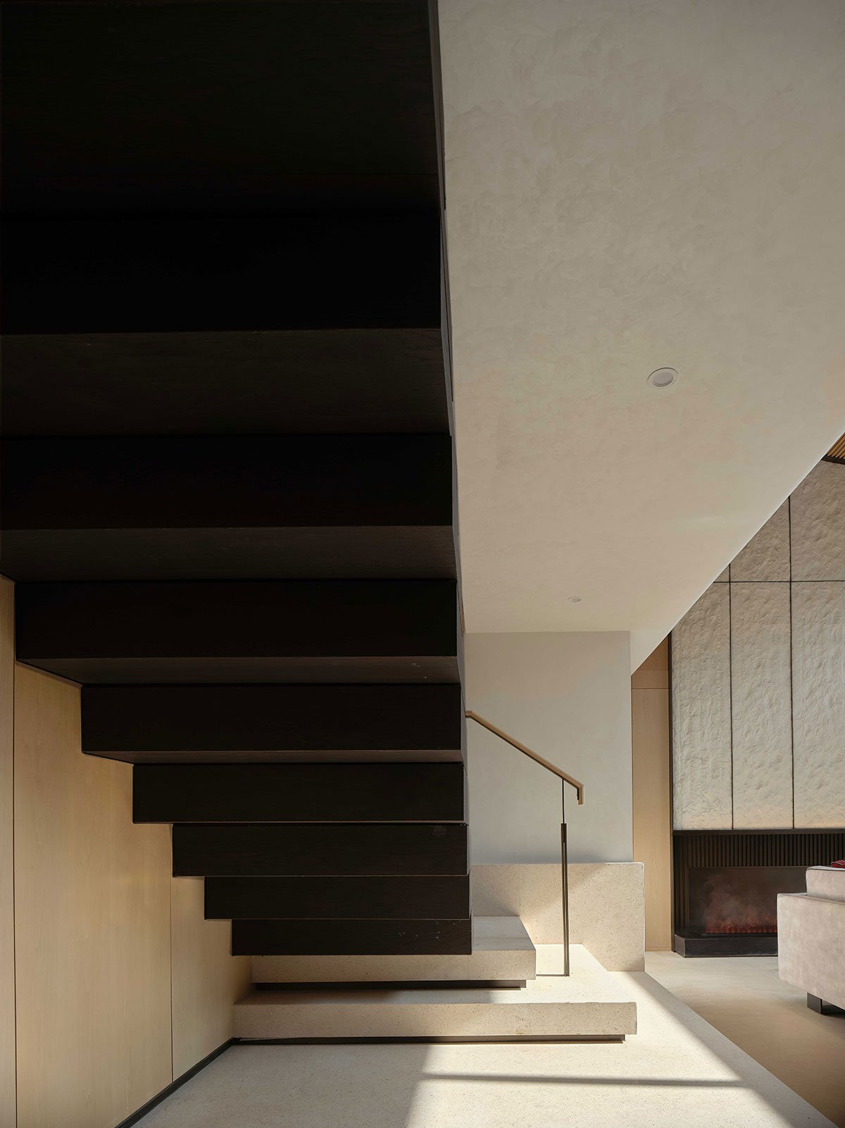 Waiting for a beam of appropriate light to spill from the treetops, privacy, breathability and natural force coexist, creating a comfortable and natural back to the simple happy living island. The stairs behind the living room extend upwards, changing from warm marble tread to simple wooden decoration.