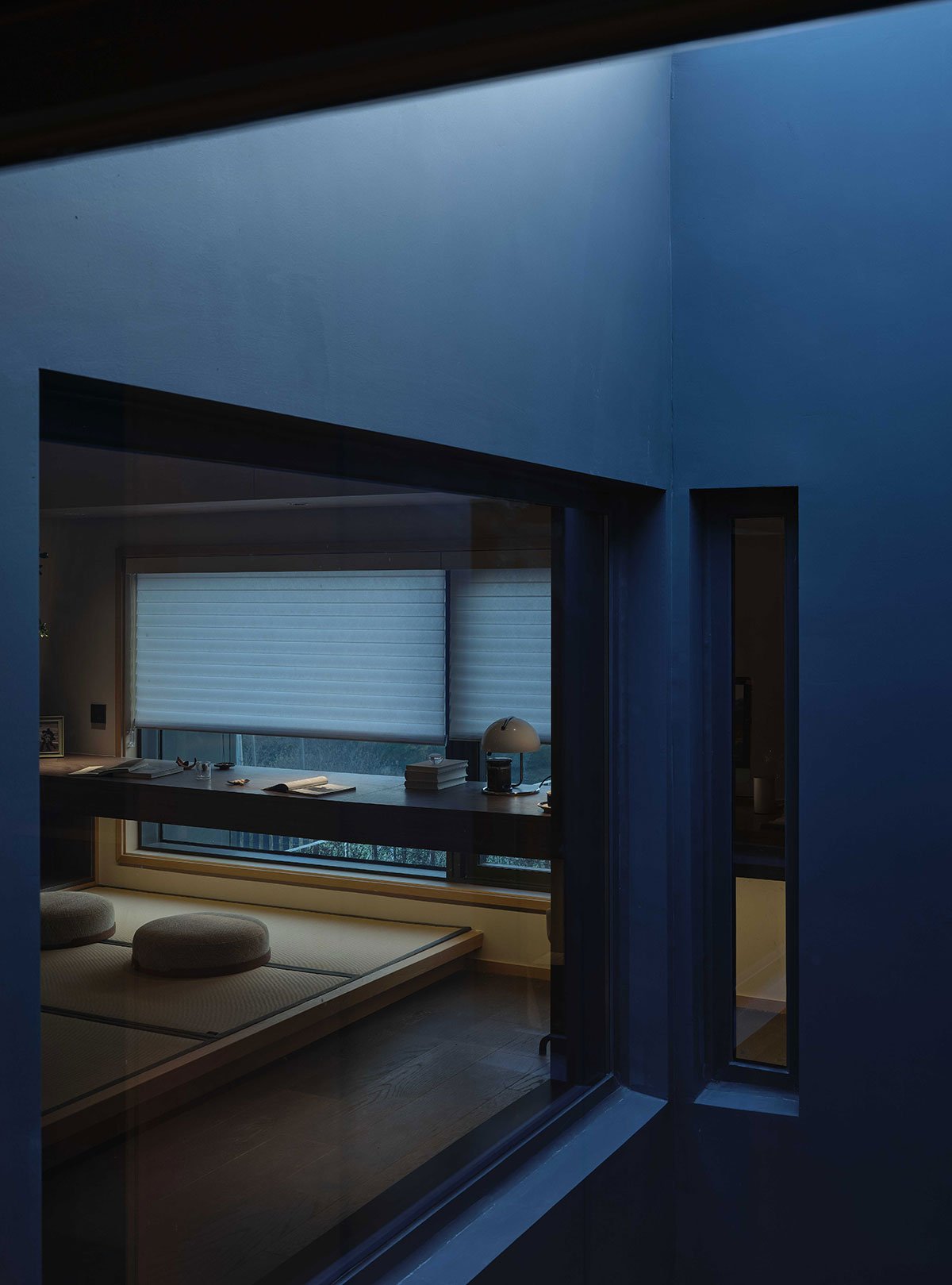 The limited second-floor space is fully and ingeniously planned as a secondary bedroom and bathroom through design. After the corridor, the sloping roof secondary bedroom uses tatami mats as the main activity space, combined with rush mats, wooden long tables, cotton and linen bedding and tranquil warm light, presenting inhabitable, learnable and playable rich attributes—the vitality and warmth, of home, lies in this.