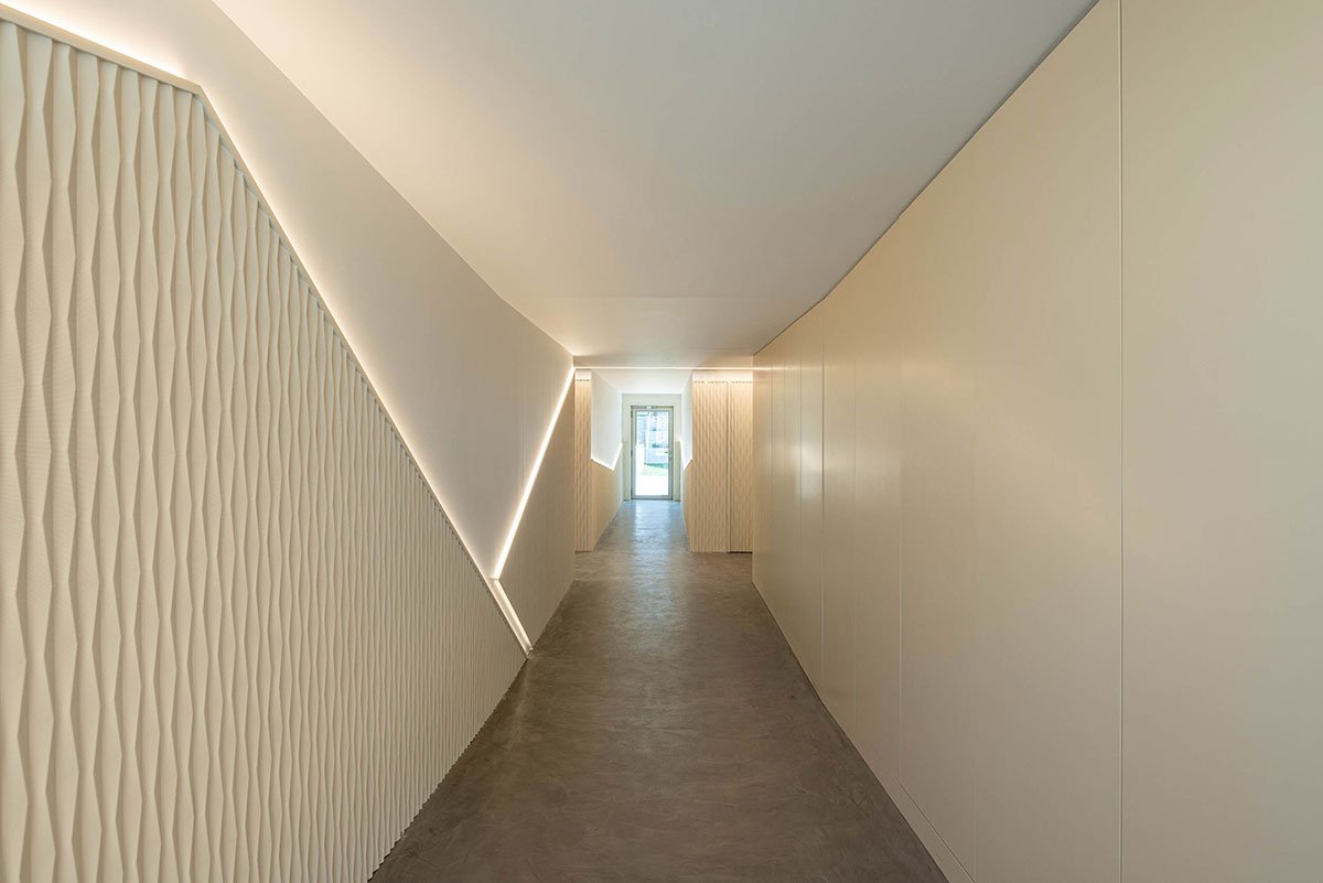 To ensure harmony with the surroundings and balance its distinctive design, the materials and colors of the building were chosen for their simplicity and sobriety, with the aim of diverting the observer’s attention to the formal dynamics created by its shape. At night, these forms are enhanced by carefully studied lighting that precisely reinforces the irregularities that characterize the facade. Divided into six floors, this building comprises seventeen apartments ranging from T2 to T3 typologies, with west or east-west orientation.