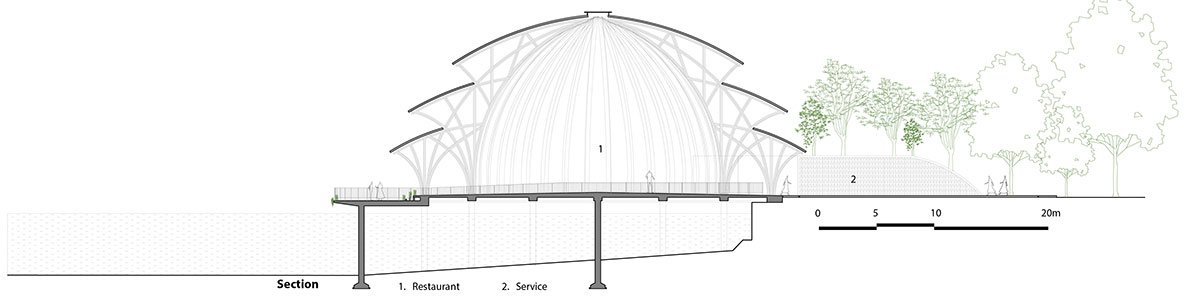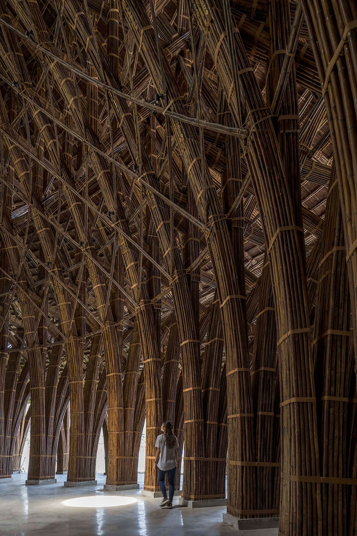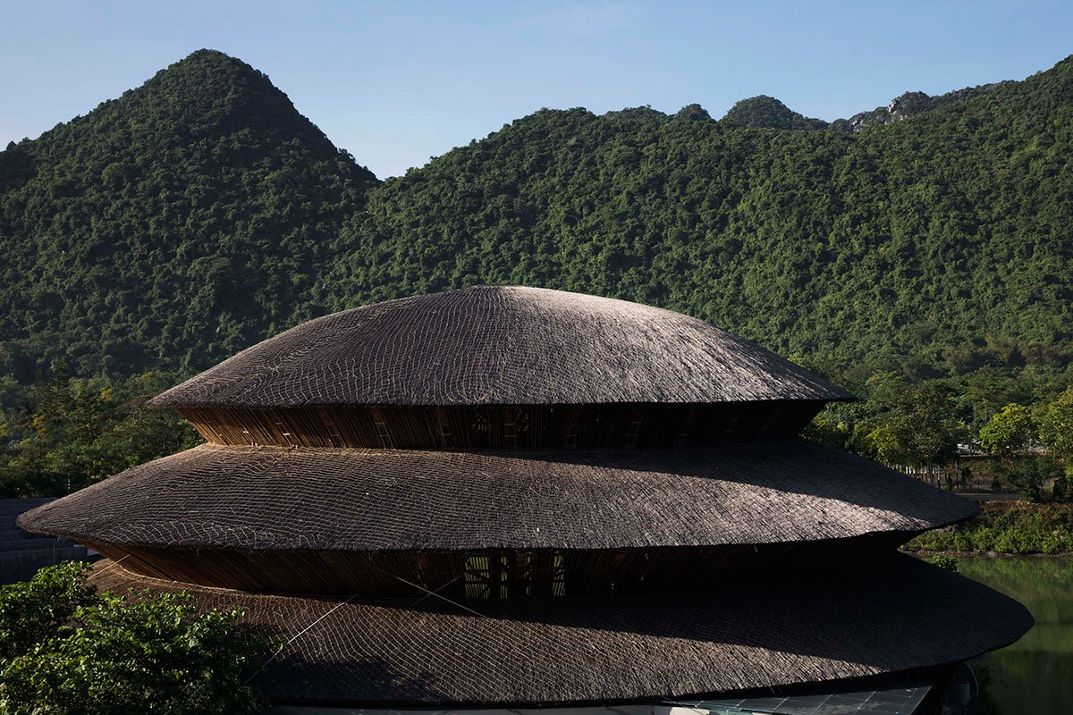 The three-gabled circular roof, spanning as much as 1050 sq m, is assembled from two stacked ring-shaped roofs and a dome roof on top that is detached by light strips, respectively. The biggest radius measures around 18 m, while the structure height stands at almost 16 m, making it VTN Architects’ highest bamboo structure to date. The stepped roof, inspired by traditional architecture, is made of 36 modular frames that appear like a multi-level structure, yet they are on a single floor.