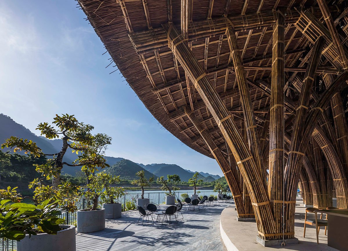The restaurant is positioned strategically next to an artificial lake that functions as a natural air conditioner. Making use of the lake is essential considering the hot and humid weather during the summer in Cuc Phuong Commune in particular and northern Vietnam in general. Additionally, the lake is also a huge reservoir to store rainwater and groundwater from the mountains.