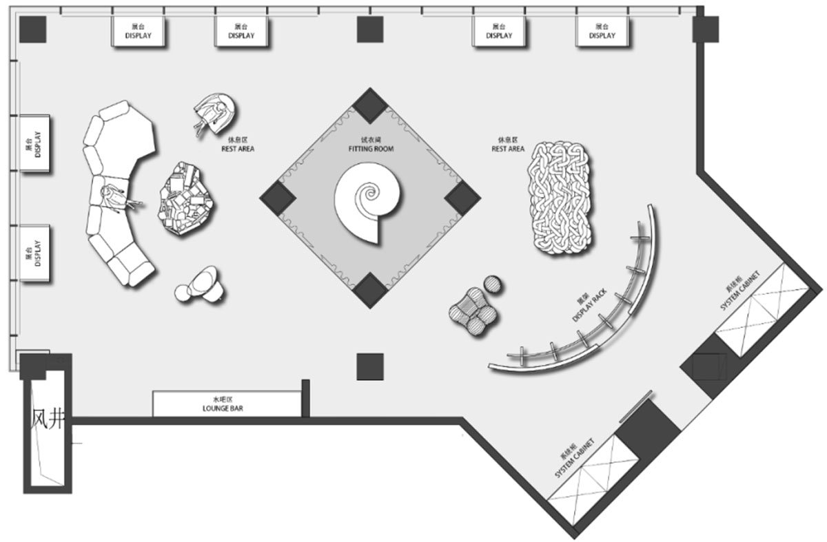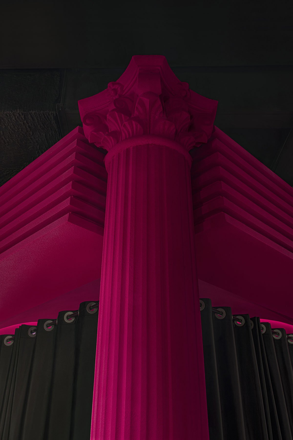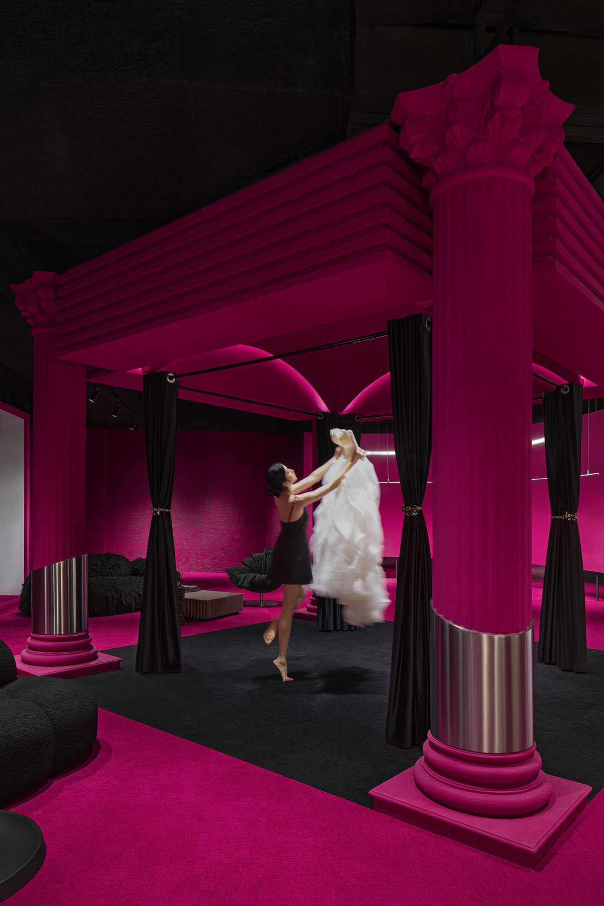 Four Doric pillars support a dome, it is a multi-functional area that integrates fitting and interaction. It becomes the visual center that gathers the focus of the audience, In this core area that incorporates the elegant combination of rose pink and black, every customer can shine as the protagonist.