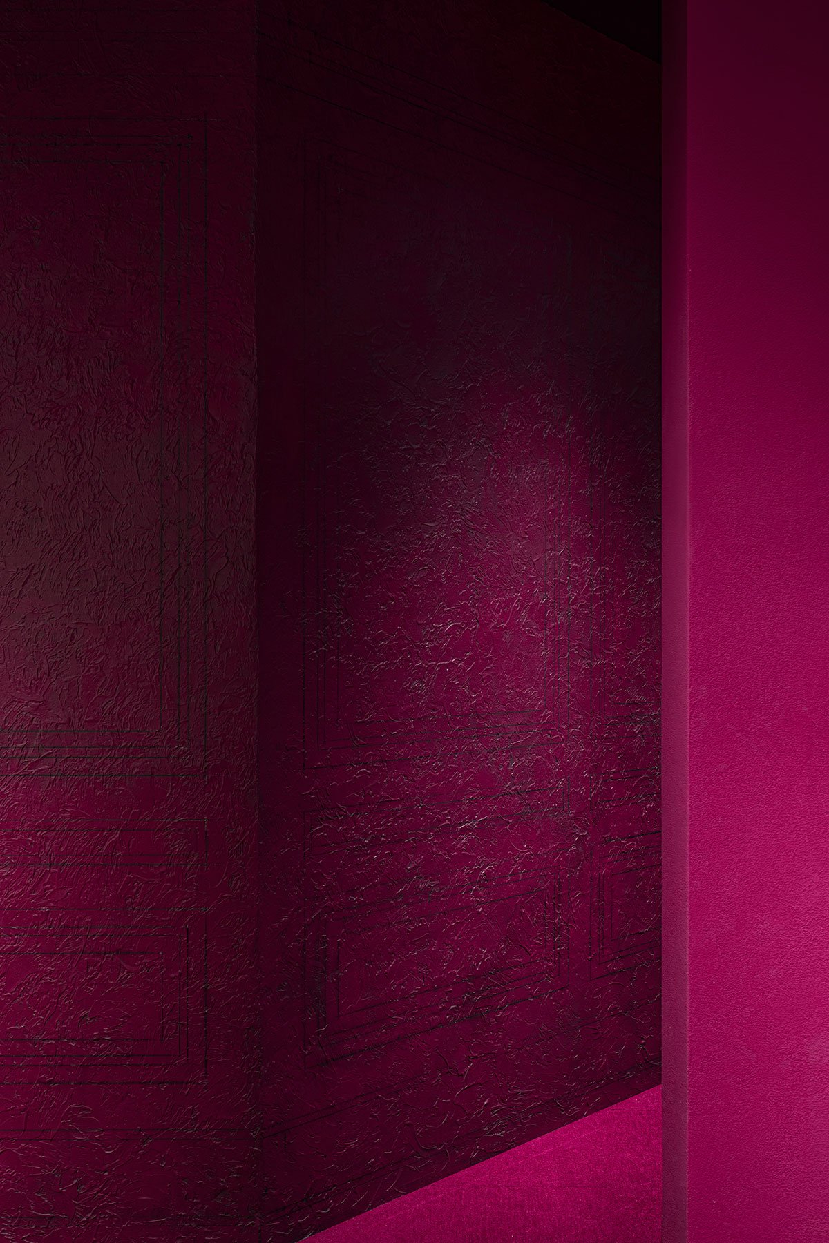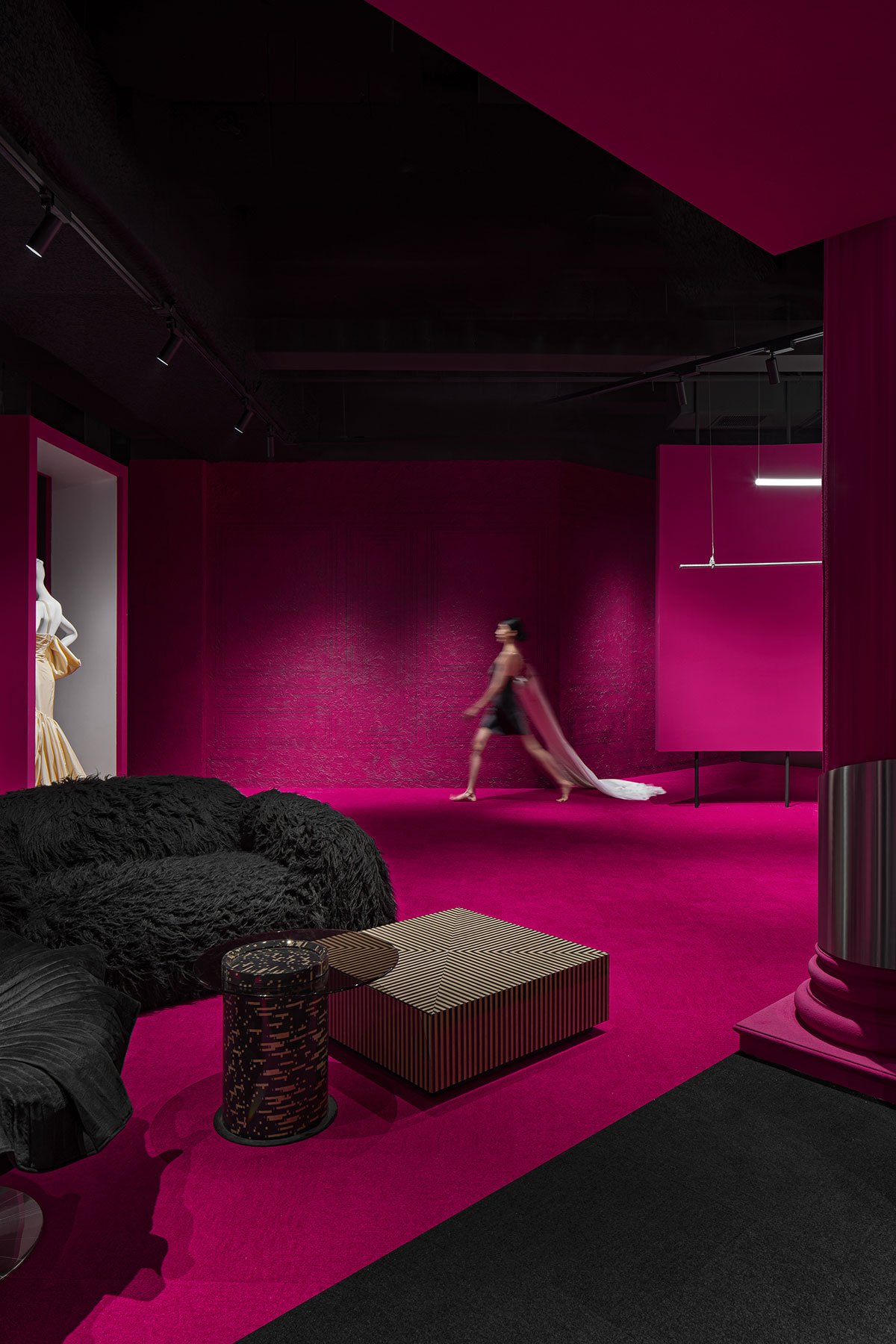 In the delightful rose pink canvas that can trigger dopamine release in the brain, black outlines the framework, leaving white to be the exclusive shade of the wedding dress itself. The designer expressed his inspiration via the bold color of rose pink in an innovative way, making the entire showroom as vibrant as a blooming rose. The brimming vibrancy and energy in the space result in a free-spirited, avant-garde, and fashionable ambiance.