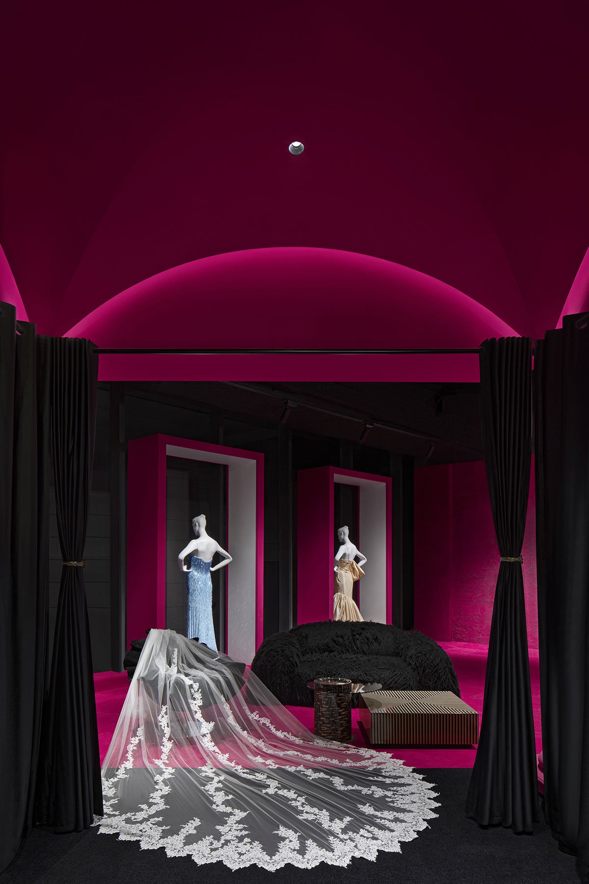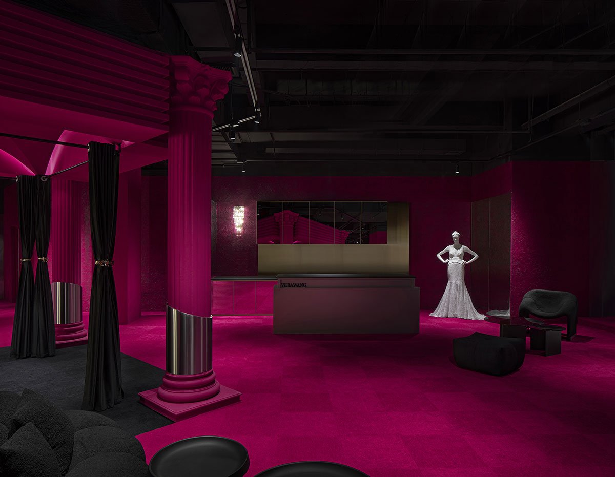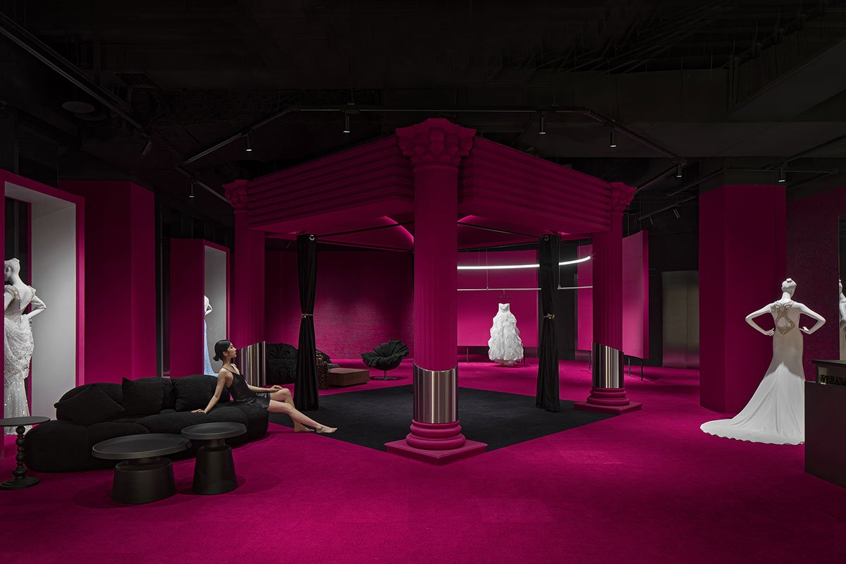 This black and pink space is not only a bridal shop, but also a “city lounge.” It is a new attempt at a cross-over exploration of commercial operations. SALONE DEL SALON combined the innovative experience of “wedding dress + afternoon tea” by placing black tables and chairs beyond the dome, to create a distinctive social consumption scene that aligns with urbanities’ desire of diverse trendy lifestyles.