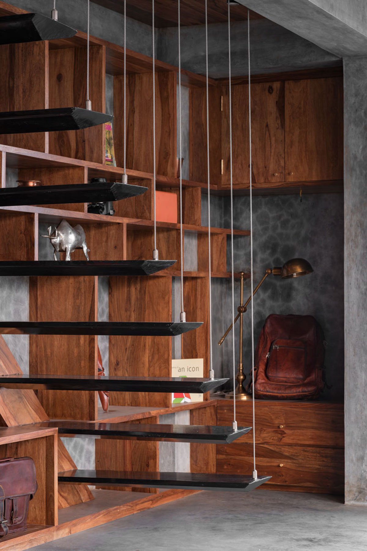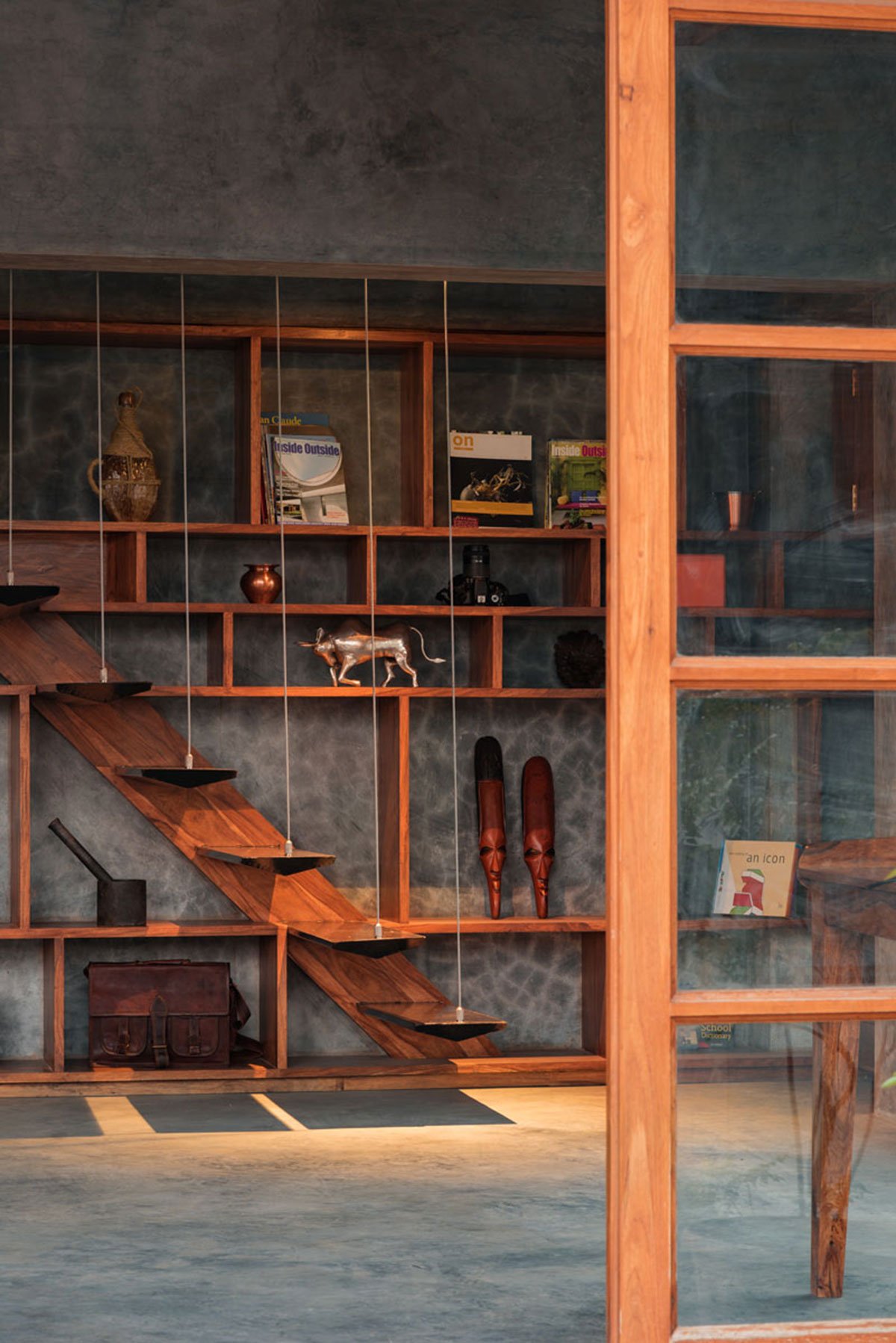 The low-on-clutter, minimal furniture allows for easy movement. The library unit is designed to be understated in its form so as to consciously reduce its visual impact. A metal staircase hung from stainless steel wires on one end and anchored to a wooden beam on the other leads to a store room above. Here, the treads are designed in a way, so as to perfectly align with the shelves of the library unit. Similarly, a lot of elements such as the door handle, door stopper, tower bolts, drawer handles are custom designed to follow this language with the notion to fade away.