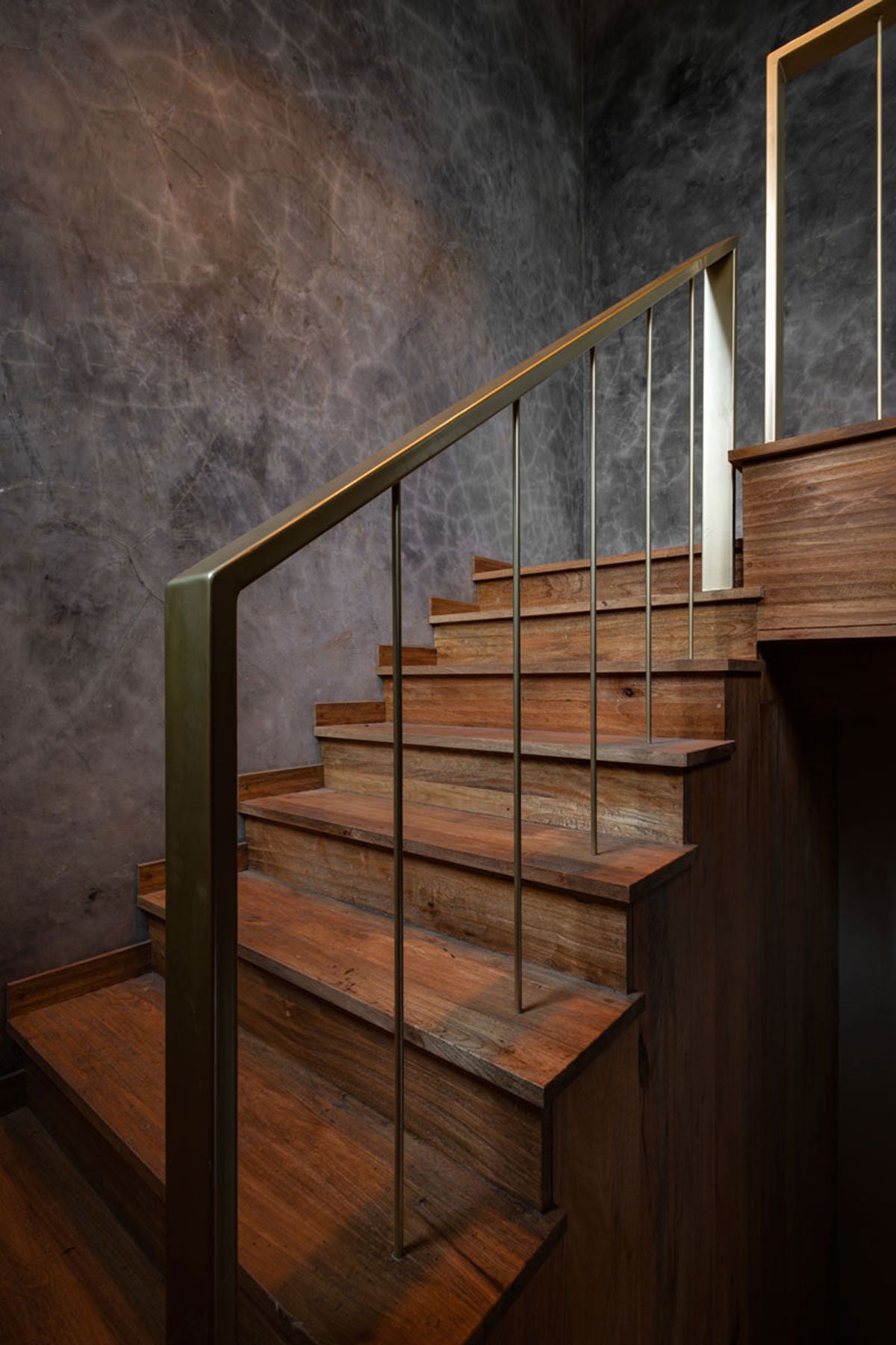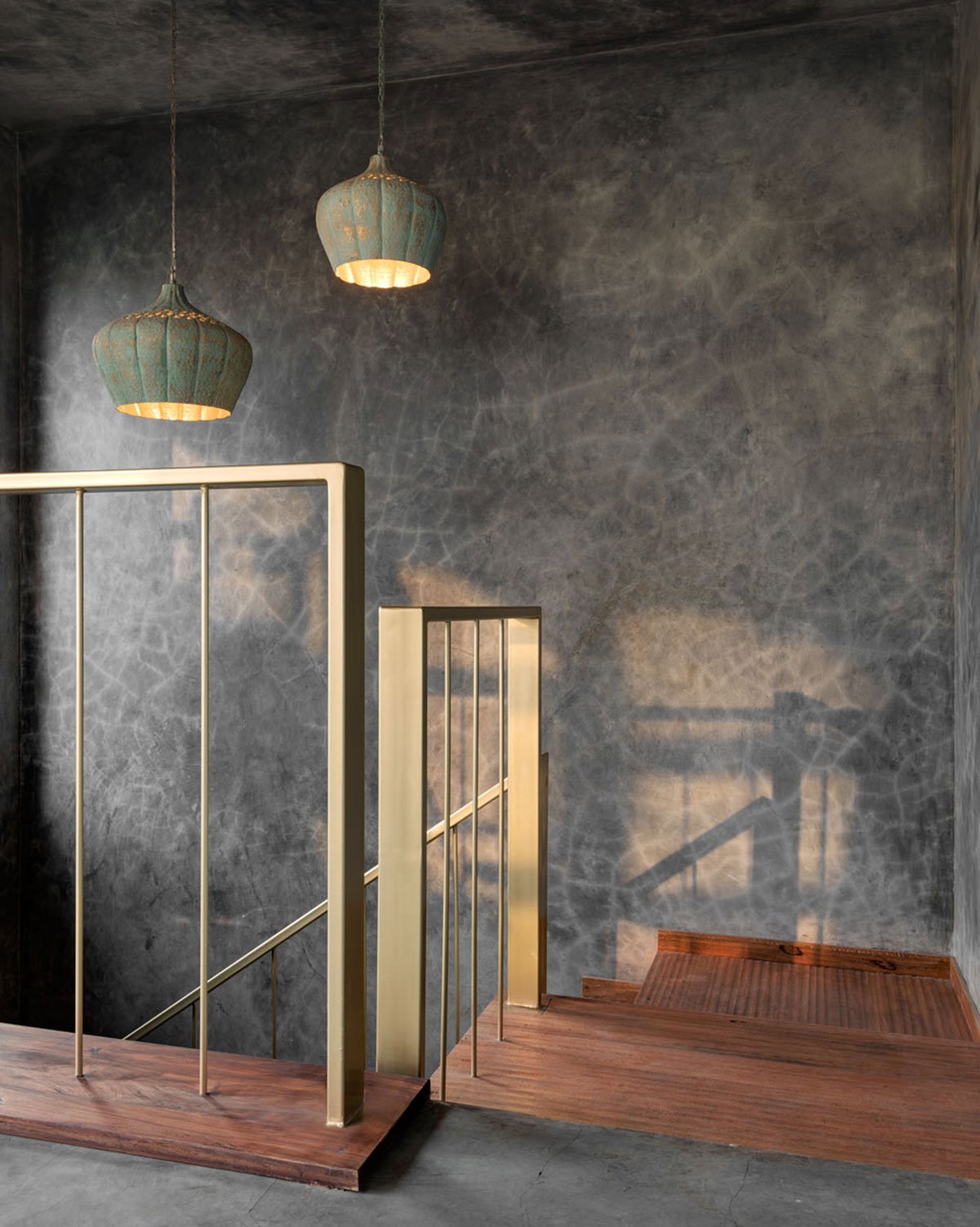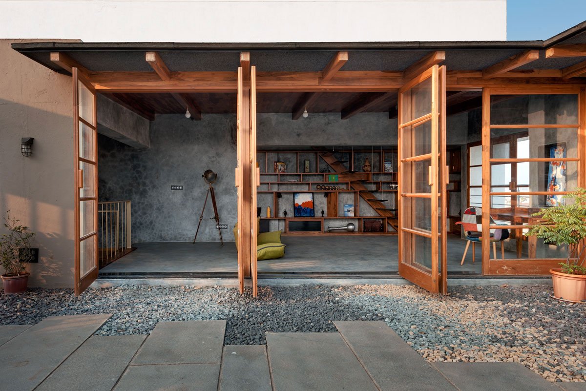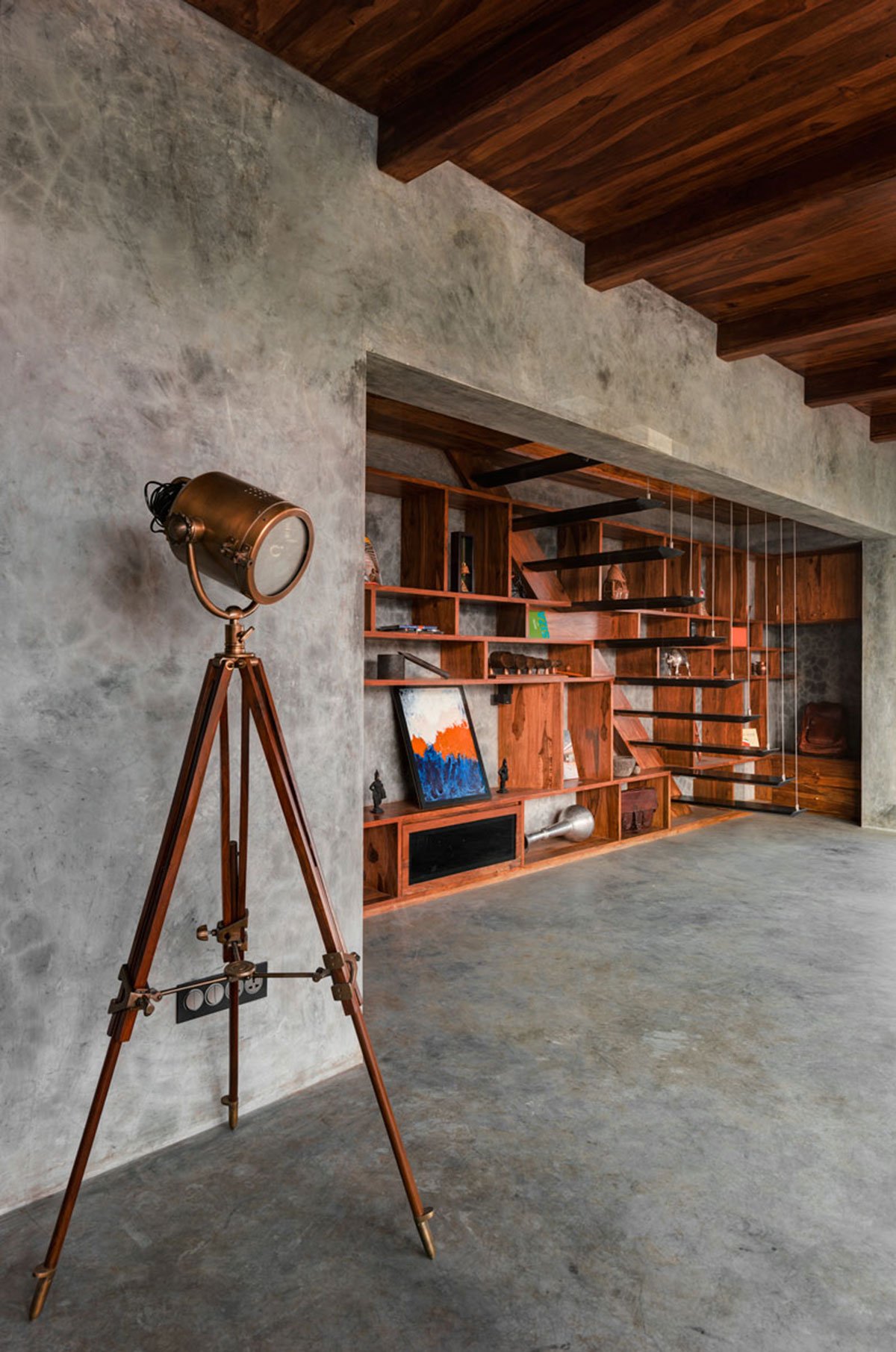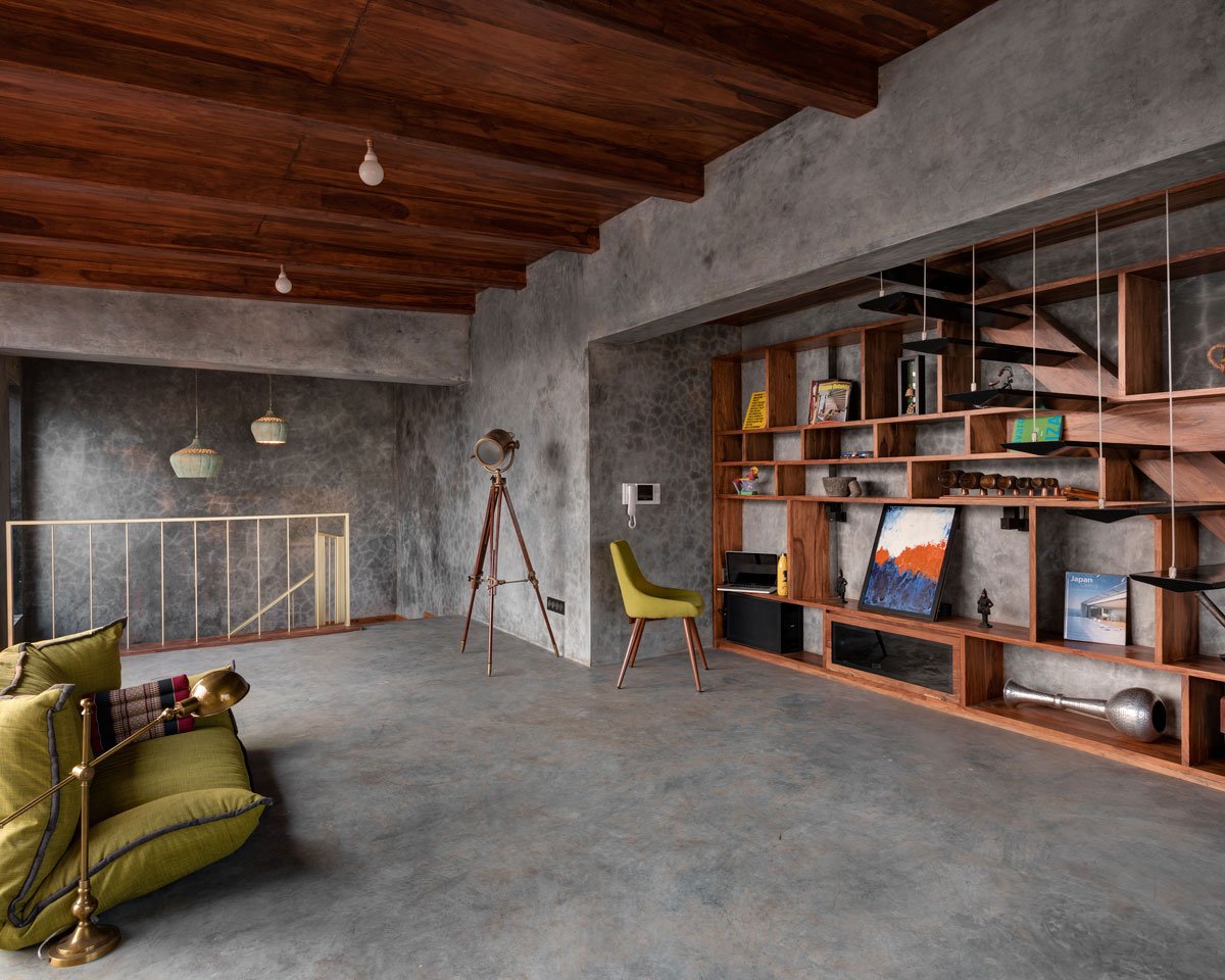 Bold earthy undertones of the cement textured walls and Teak wood furniture are used to set the tone of this space. The roof library overlooks the terrace garden through a wooden glass paneled façade, which gives a notion of an enclosure that can open up completely, blurring the boundaries of the inside from the outside. This uniformity of space is also accentuated by the use of natural materials like cement plaster, teak wood, granite stone and brass metal which span inside as well as outside. The hand movement imprints on the cement plaster constantly give a sense of tactility of the process that has undergone to make its architecture.