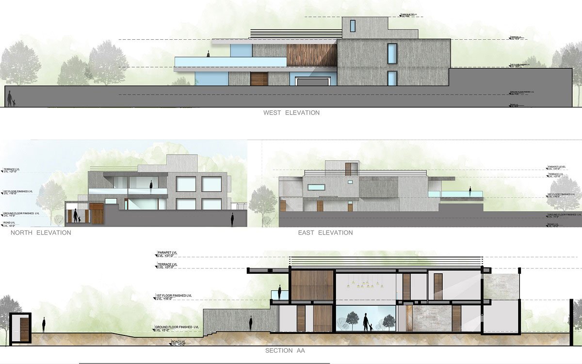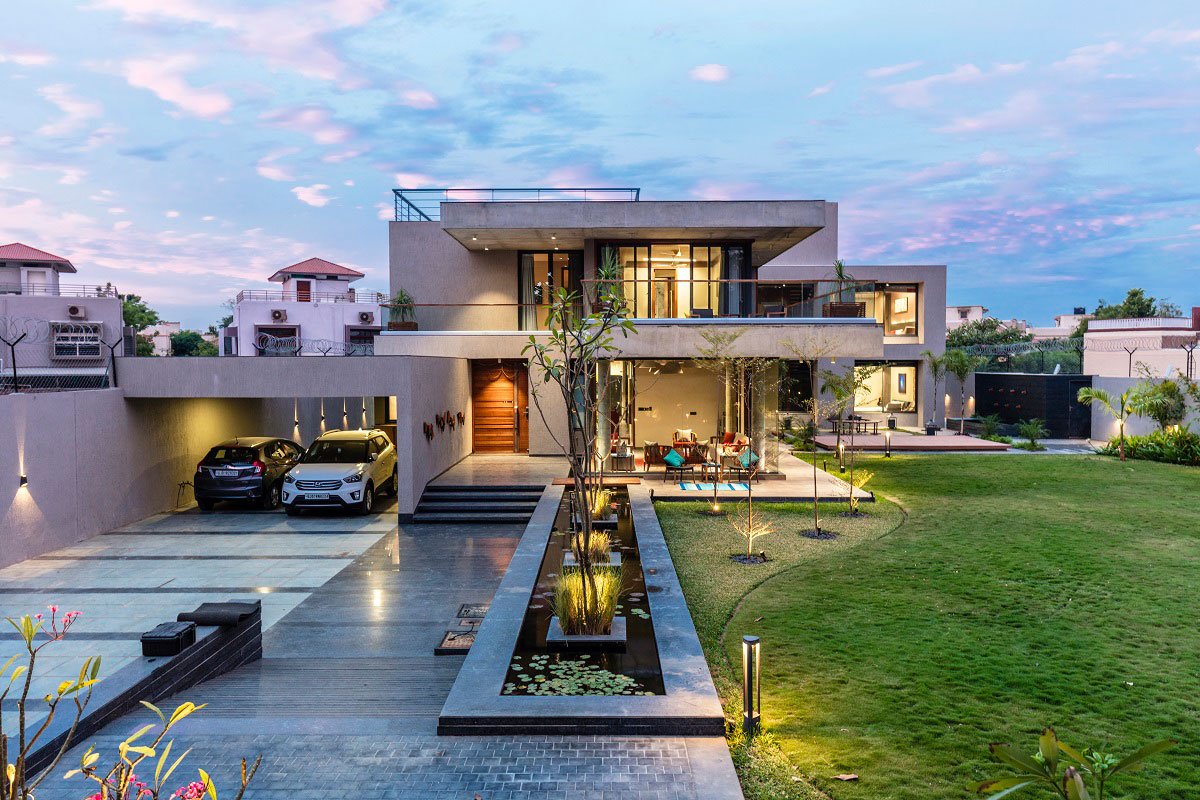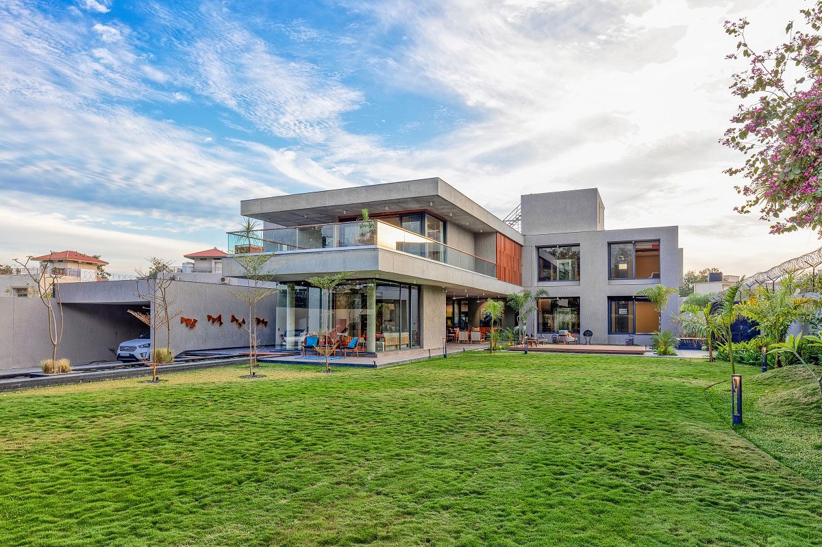 [Text as submitted by Architect] This quintessential contemporary house is a perfect representation of the architectural language that the firm follows; clean, straight-line and minimalist. A modern villa with cantilever exposed RCC slabs and glass facades. This house is a right balance between the inner and outer space; wherein the constructed structure stands in equality with the landscaped area. The L-formation architectural planning is a result of the sun path and directions. The L-plan was done so that most of the areas open up towards North, which works best for the Indian climate.