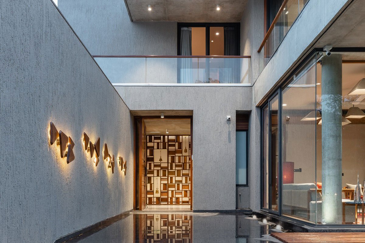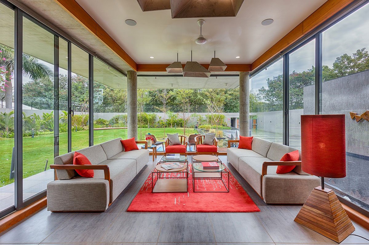 This house is a right balance between the inner and outer space; wherein the constructed structure stands in equality with the landscaped area. Coexisting is a prevalent concept that our designs are based on, especially if we are responsible for landscape designing as well as architectural planning. We believe that they both enhance each other’s beauty by coexisting. The drawing room is situated such that it sits amidst the lush green of the landscape on three sides and a water body on one side. The glass facades of this particular area makes one feel like a part of the landscape even when inside the house.