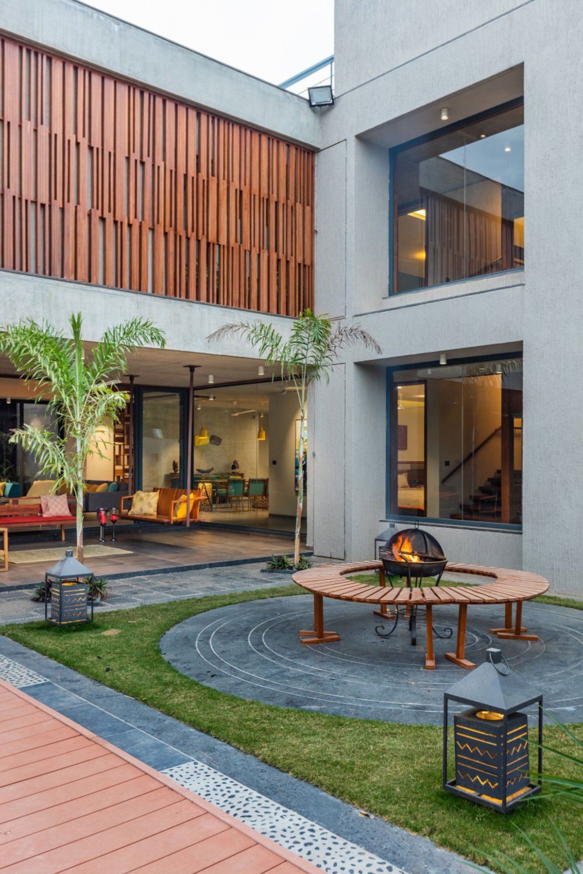 “Coexistence” is a prevalent concept that the firm’s designs are based on, especially if responsible for landscape designing as well as architectural planning. The firm believes that they both enhance each other’s beauty by coexistence. The drawing room sits amidst the lush green of the landscape on three sides and a water body on one side. The glass facades of this particular area make one feel like a part of the landscape even when inside the house.