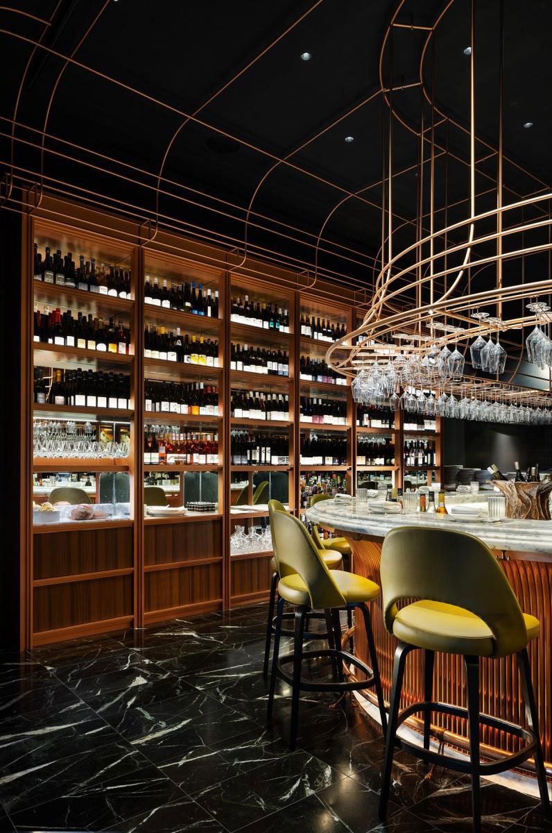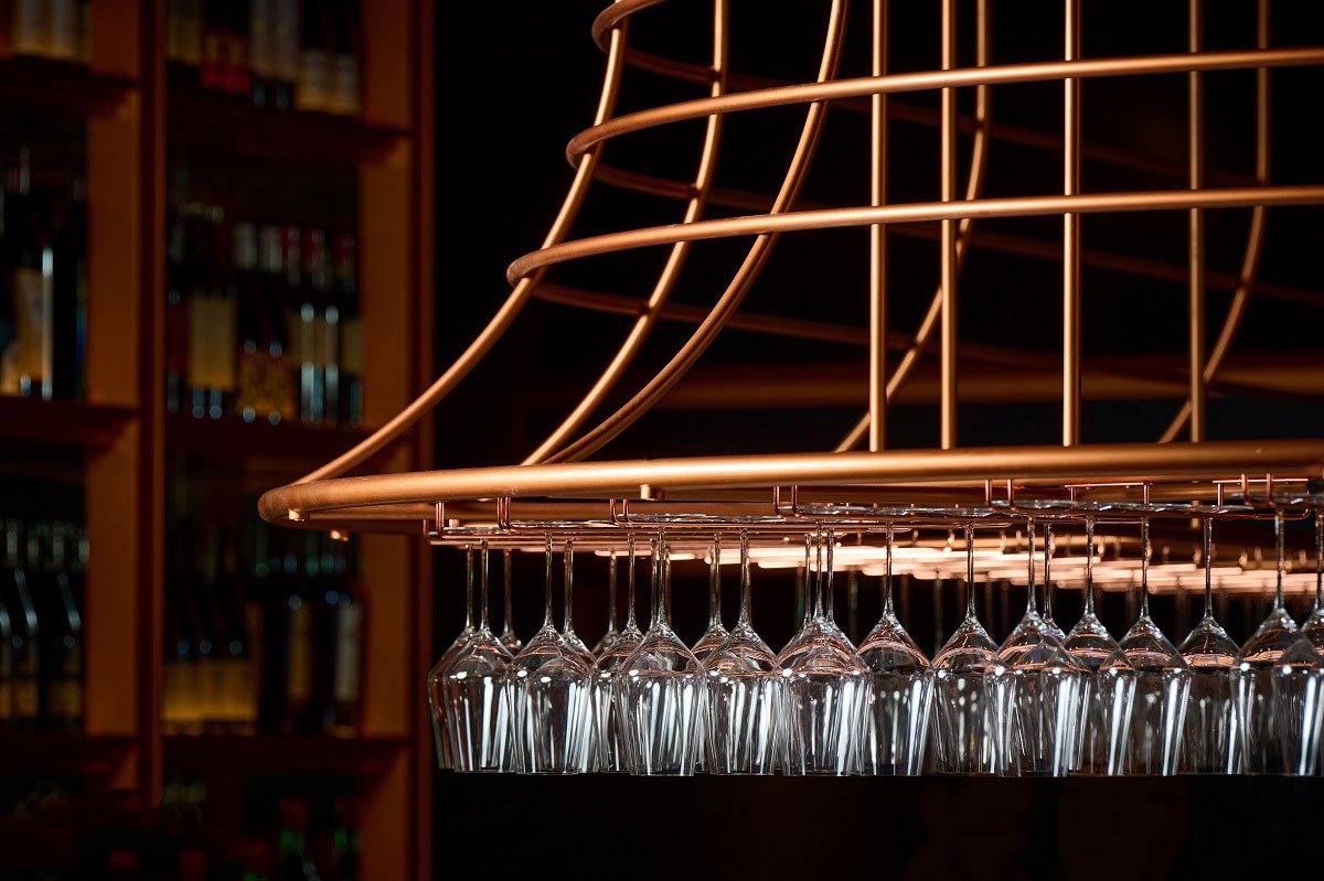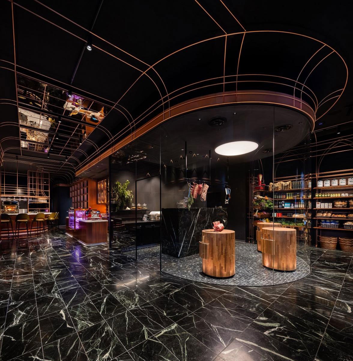 Informed by this conversation, and a closely collaborative partnership with Anthony, we designed an immersive venue for Victor Churchill’s grand entrance to the Melbourne food scene. Keeping the Puharich legacy in mind, we developed a design language which speaks to the family’s Croatian roots; looking to the gilded churches and Baroque architecture of the country. This is iterated through fine anodised copper arches, forming both a decorative and functional framework of shelving and display, custom fabricated by DiEmme Creative Solutions.