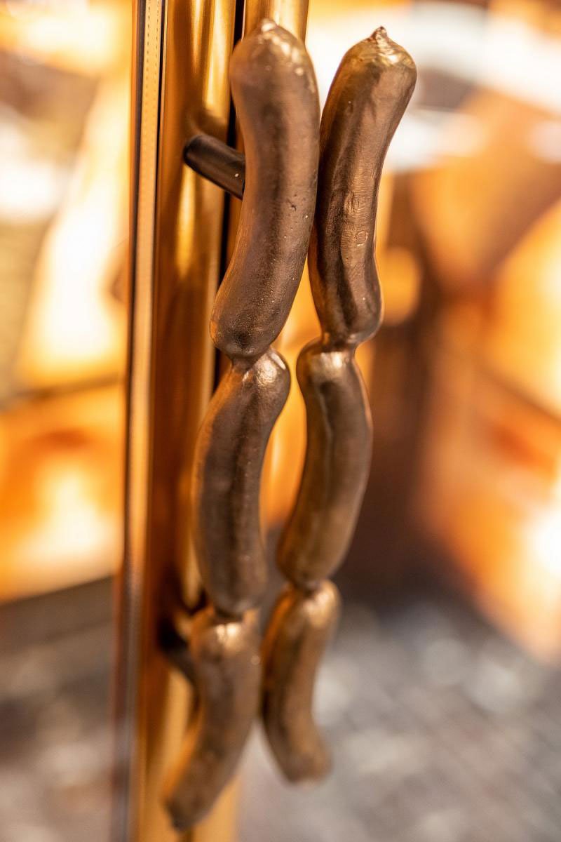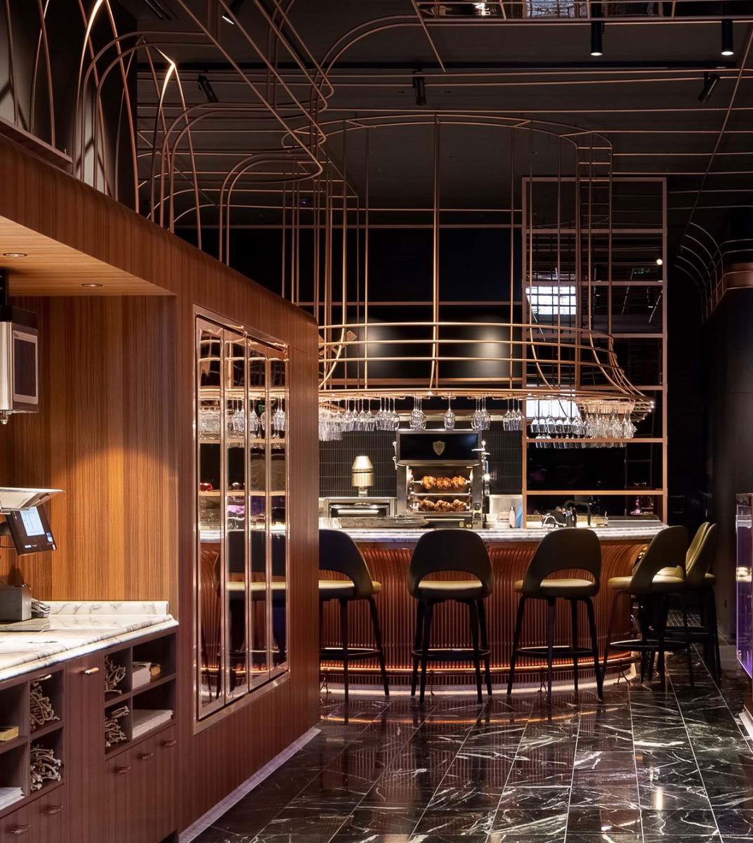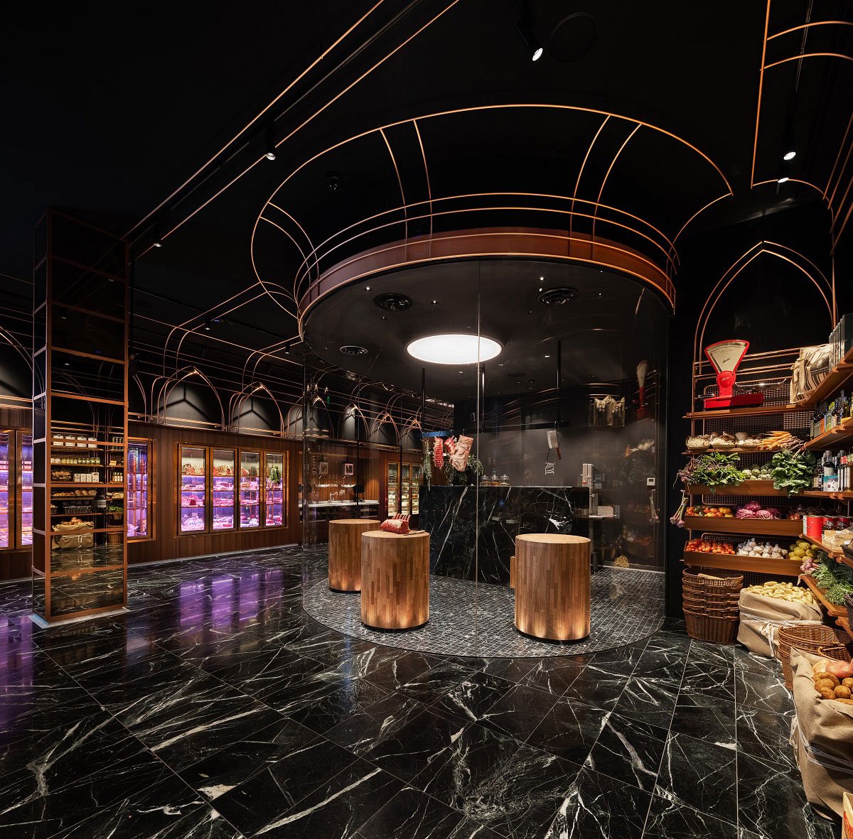 Informed by this conversation, and a closely collaborative partnership with Anthony, we designed an immersive venue for Victor Churchill’s grand entrance to the Melbourne food scene. Keeping the Puharich legacy in mind, we developed a design language which speaks to the family’s Croatian roots; looking to the gilded churches and Baroque architecture of the country. This is iterated through fine anodised copper arches, forming both a decorative and functional framework of shelving and display, custom fabricated by DiEmme Creative Solutions.