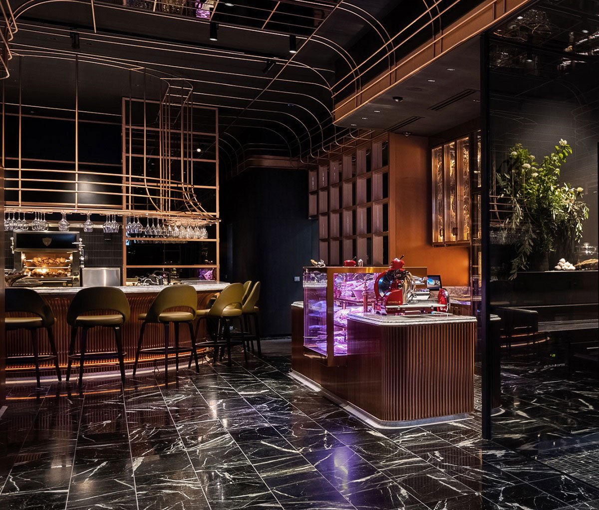 Our response is both visually opulent and operationally robust, featuring dramatic Italian verde marble floors and variegated stone tile from Three by Three, all warmly cast in tailored lighting design by Greg Dunk at LO-FI. Backlit Himalayan salt bricks emit a diffused flesh-toned glow, painstakingly hand cut to line the walls of the curing room – one of Victor Churchill’s signature features, like the three solid hardwood chopping blocks, which tie this venue to its predecessors. A reverence for tradition and trade is similarly reflected in exemplary equipment behind the counter, including Australia’s first Josper charcoal-fuelled rotisserie, and an original restored Berkel slicer from the 1930s.