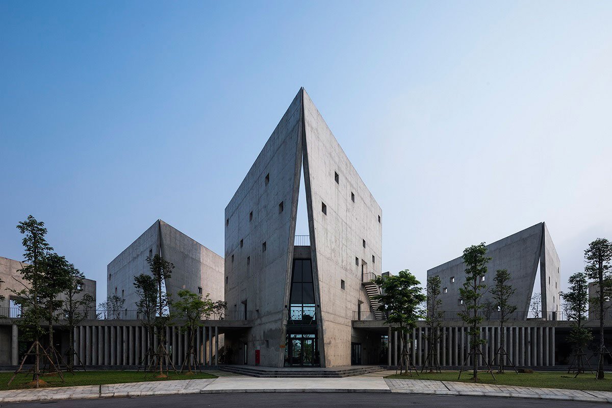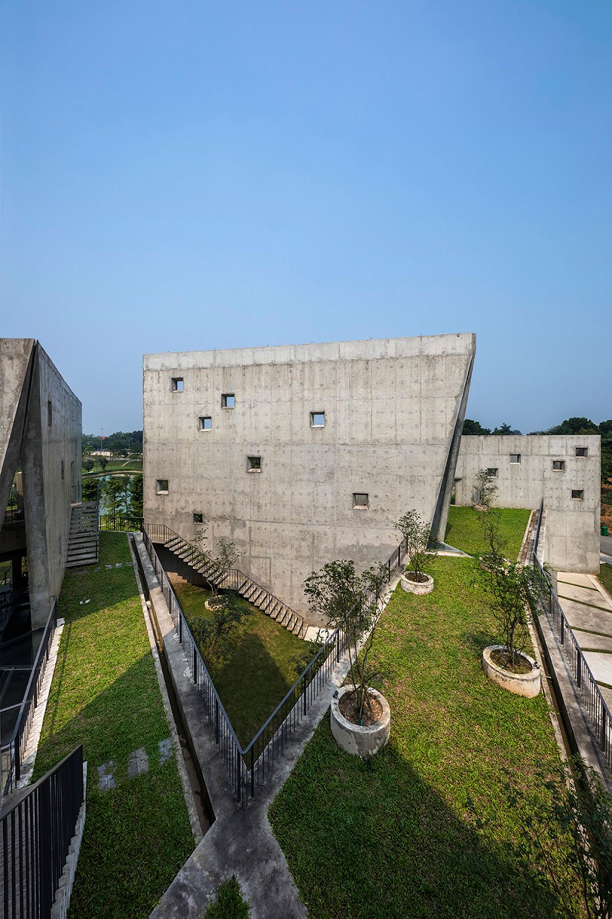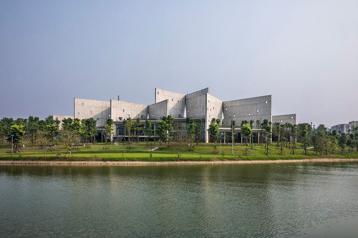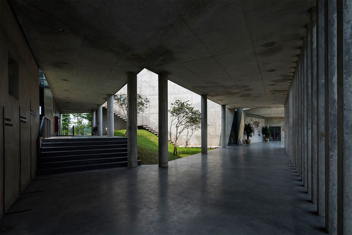 There are six V-shaped wall blocks which freely arranged follow the lay of land and connected by an open corridor. These blocks from triangular surface spaces: two sides closed and the other side opens towards lake and trees. The wall create an open book shape that exhibits “open from inside to nature”. While the open side directly faces to surrounding environment allow people to both relax, be immersed in nature and concentrate.
