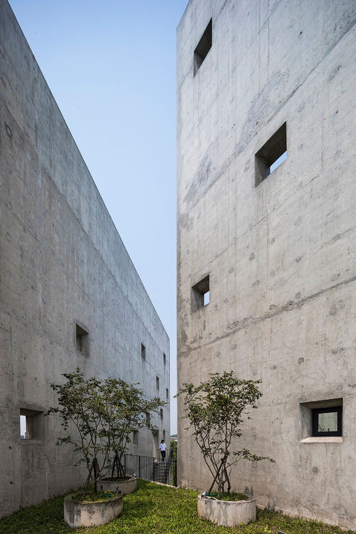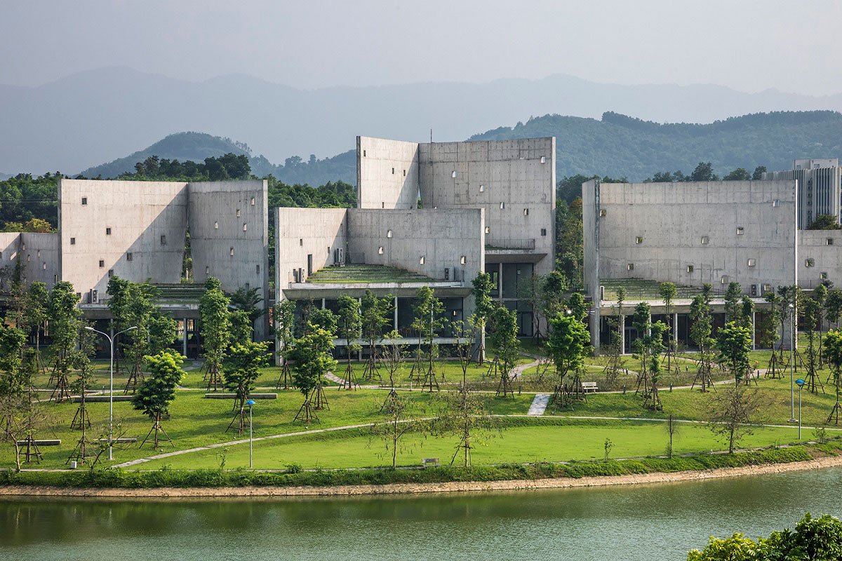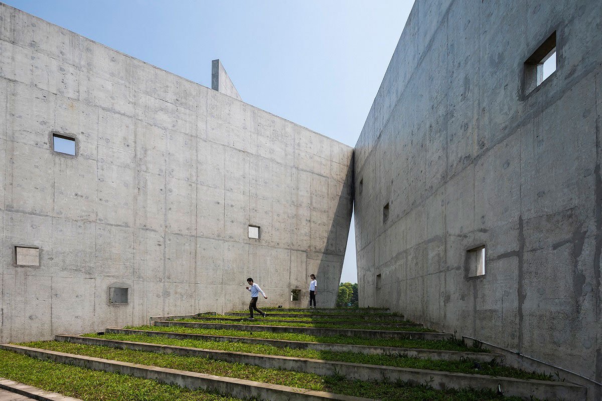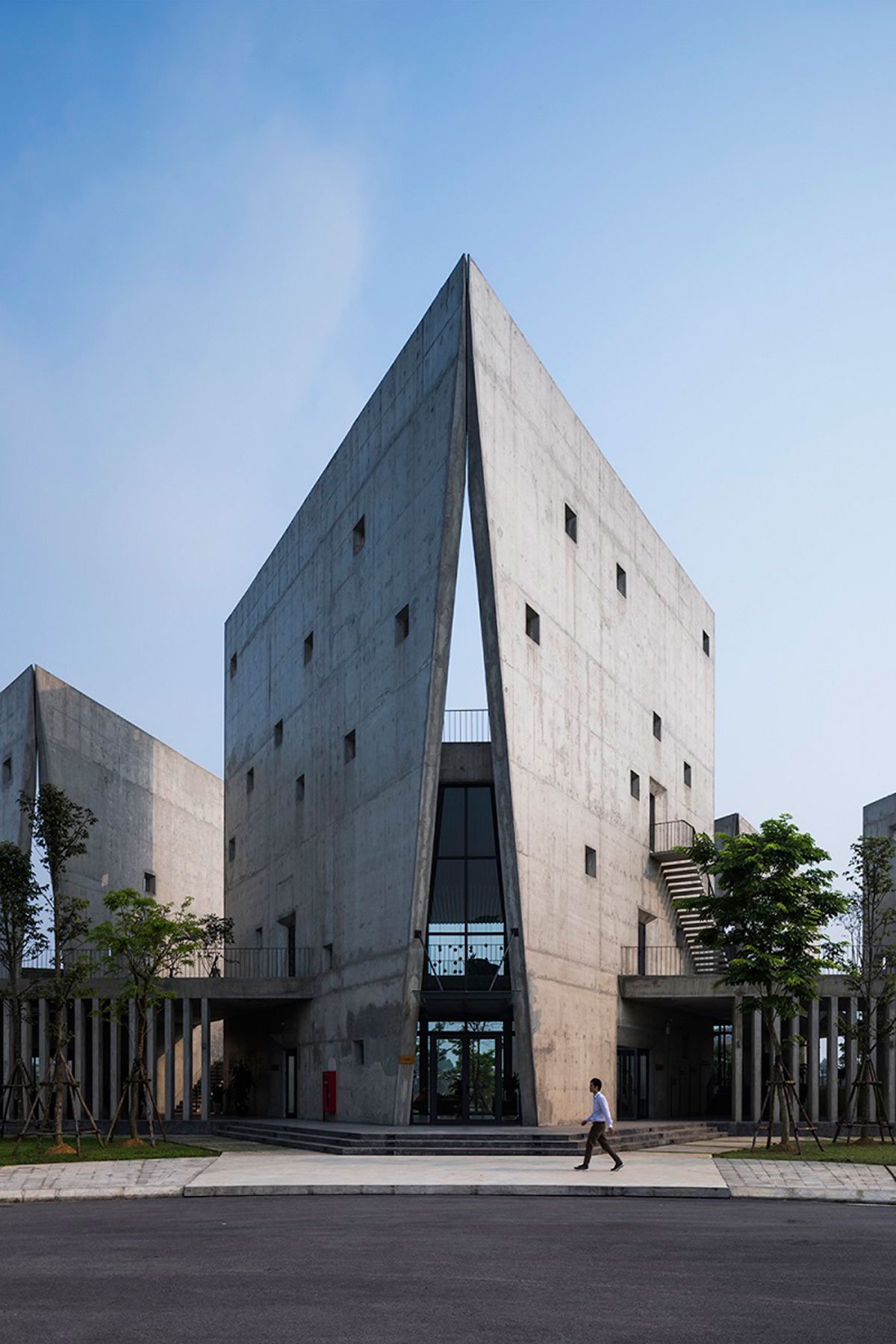 There are six V-shaped wall blocks which freely arranged follow the lay of land and connected by an open corridor. These blocks from triangular surface spaces: two sides closed and the other side opens towards lake and trees. The wall create an open book shape that exhibits “open from inside to nature”. While the open side directly faces to surrounding environment allow people to both relax, be immersed in nature and concentrate.