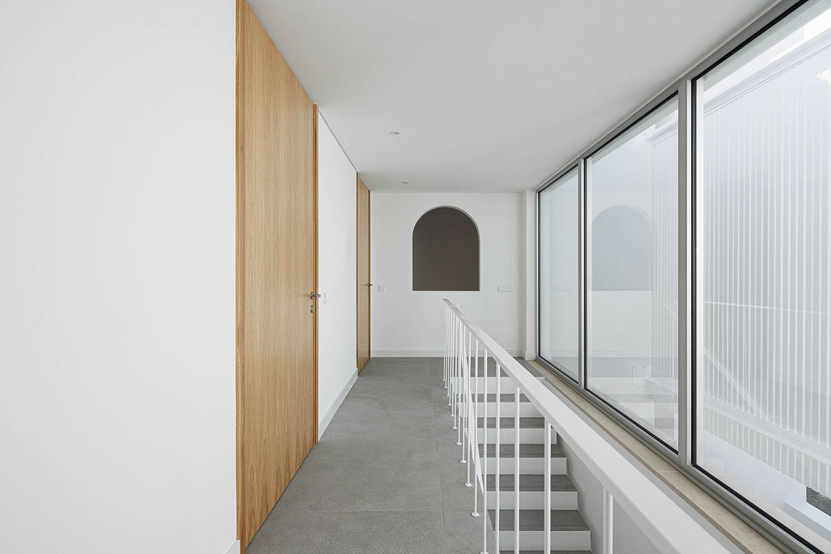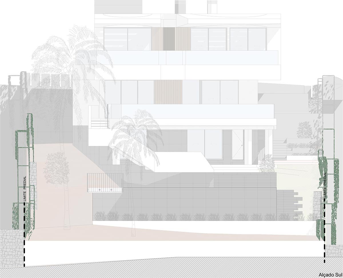Due to its unique location, this project has a dual identity. On the one hand, we have a minimalist and pure language on the north façade, resulting from a smaller volume and the necessary privacy of its spaces. On the other hand, to the south, there is a more exuberant and complex design. In which the volumetry acquires another amplitude resulting from its size.