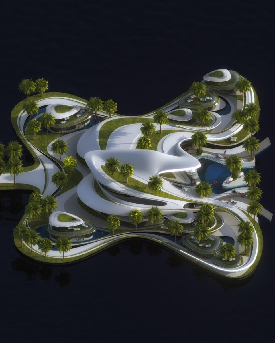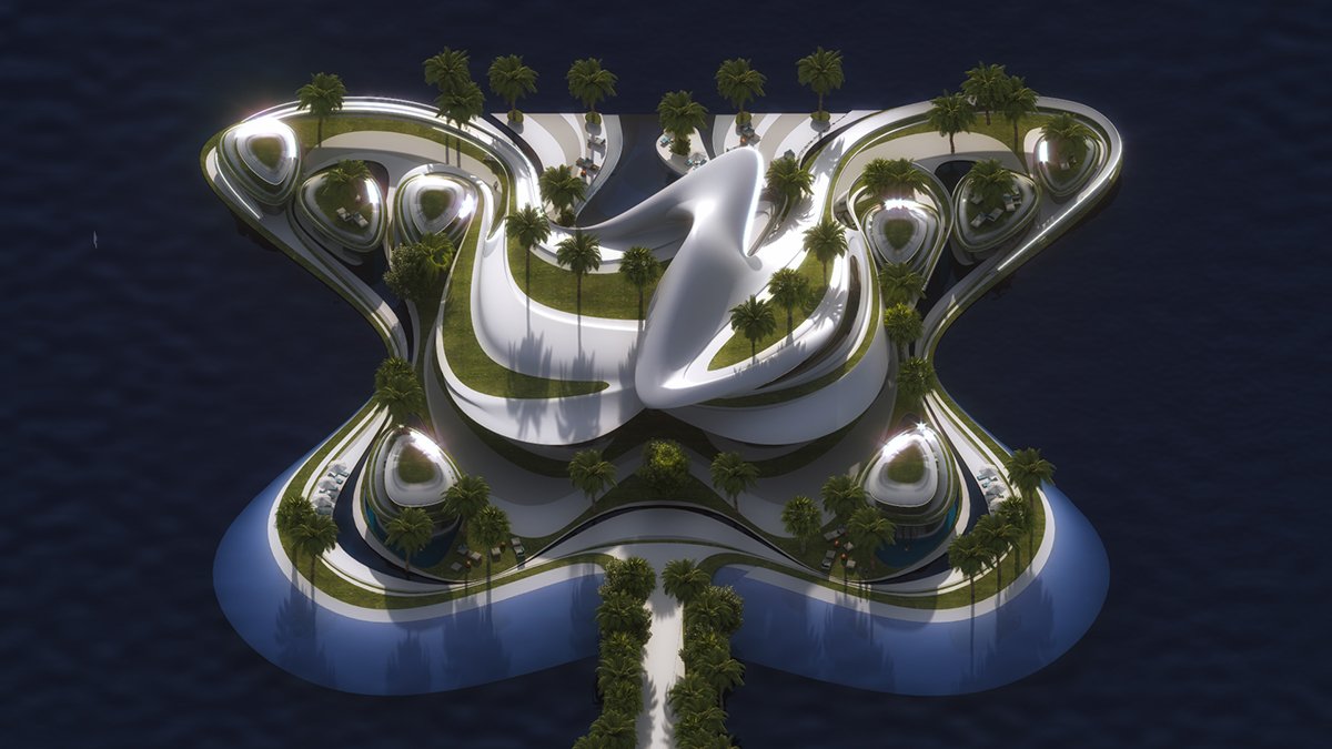 Fluidity is essential in our design as we have created a flowing and fluid concept to allow the air to flow through, with light creating soft shadows and to see endless curves as art. The island has 360-degree views of the beautiful scenic ocean and the sky. The main central building and the guest buildings all have rooftop terraces to allow more social space to be used to the island’s advantage. We want to use every space in the best way possible.