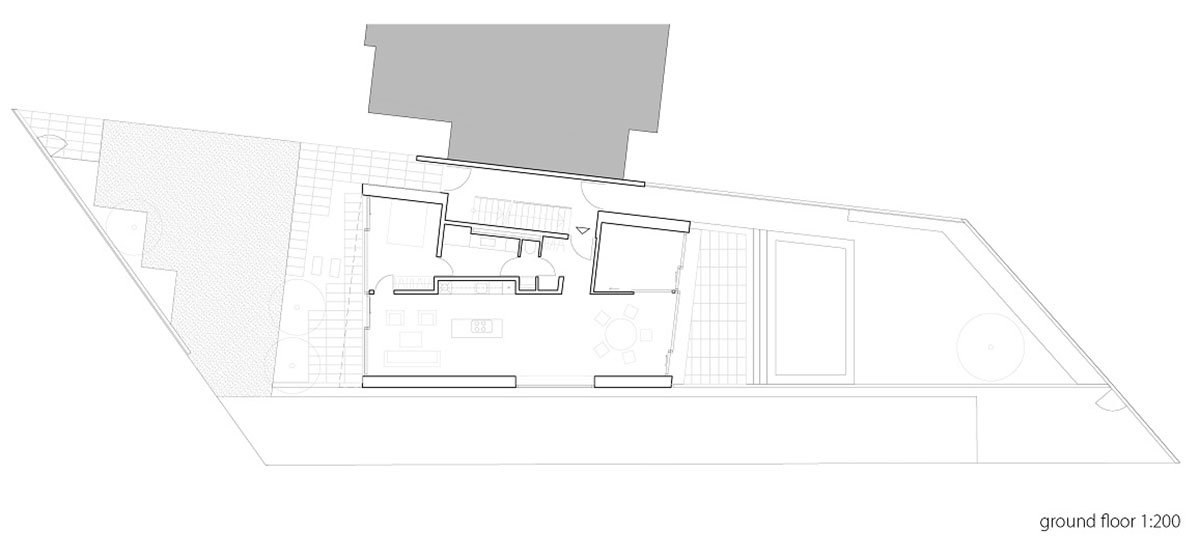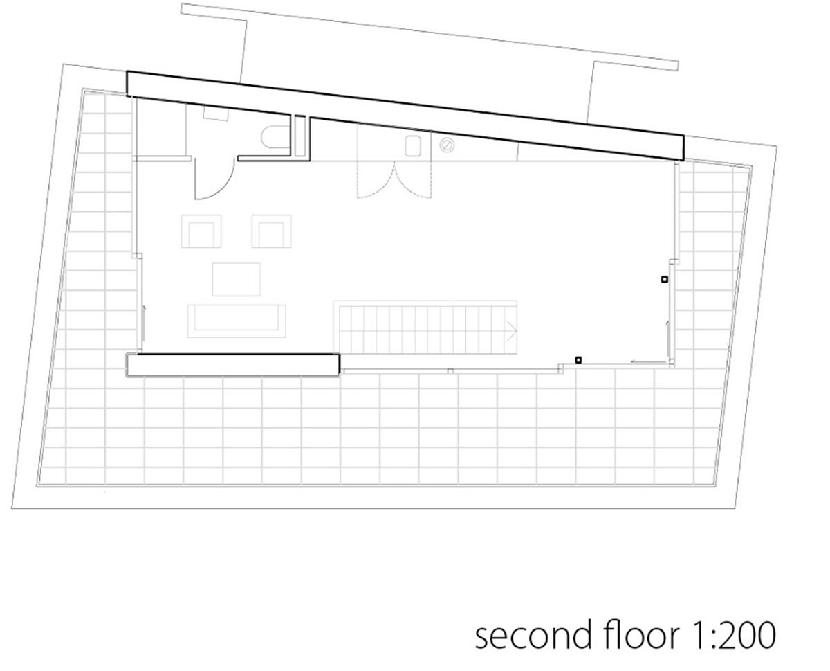 The first impression of the construction is of a container as a living space. However, the eye is soon drawn to the discrepancies between the use of ninety-degree angles and a slightly deviating complementary angle. The friction between the two angles, used both in the wall structure and the floor plan, can be felt as movement throughout the entire structure. From the intimate entrance to the large open plan living space, this interaction between the perpendicular and the oblique defines a certain perception that pervades the experience of the structure.