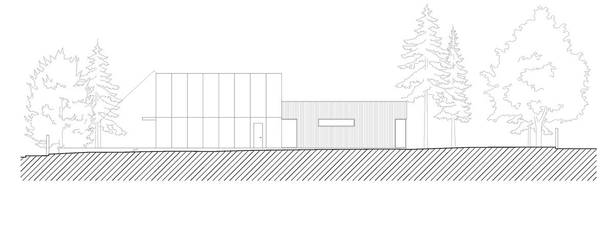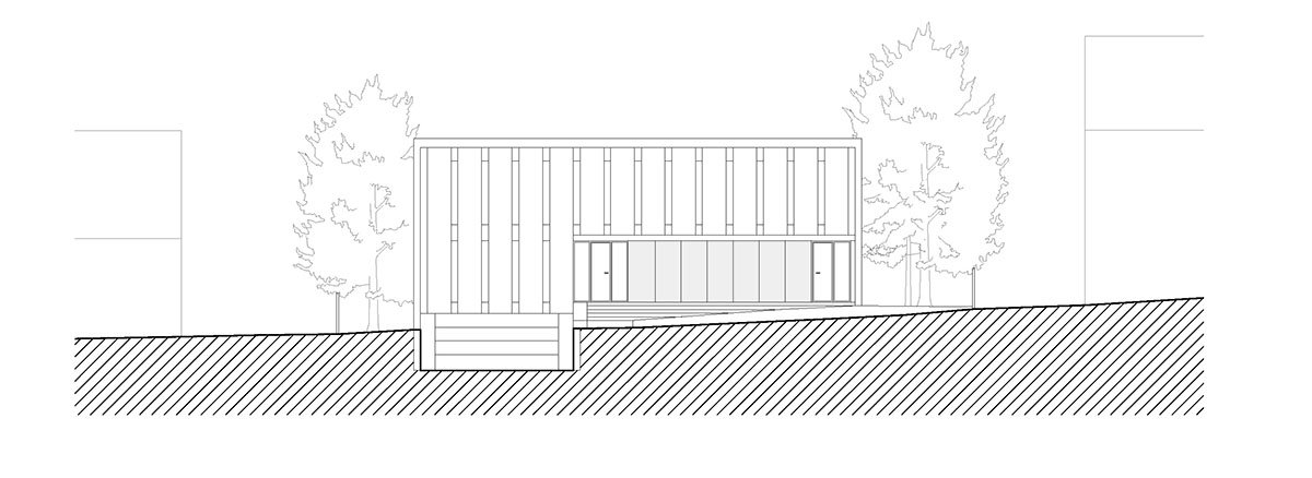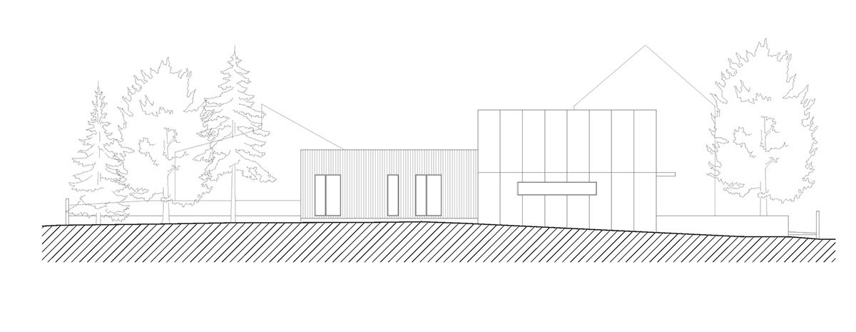 A vertical modular pattern establishes the north façade reflecting the lower need for fenestration in this direction; the façade is finished with traditional render. The southern façade, from which a discernible wing of the primary living part projects into the garden, is quite different; thanks to its large glass panels, it is maximally open to the sharp relief of the outdoor space. Its cedar siding reinforces the house’s connection to nature and the plot’s environmental intimacy.