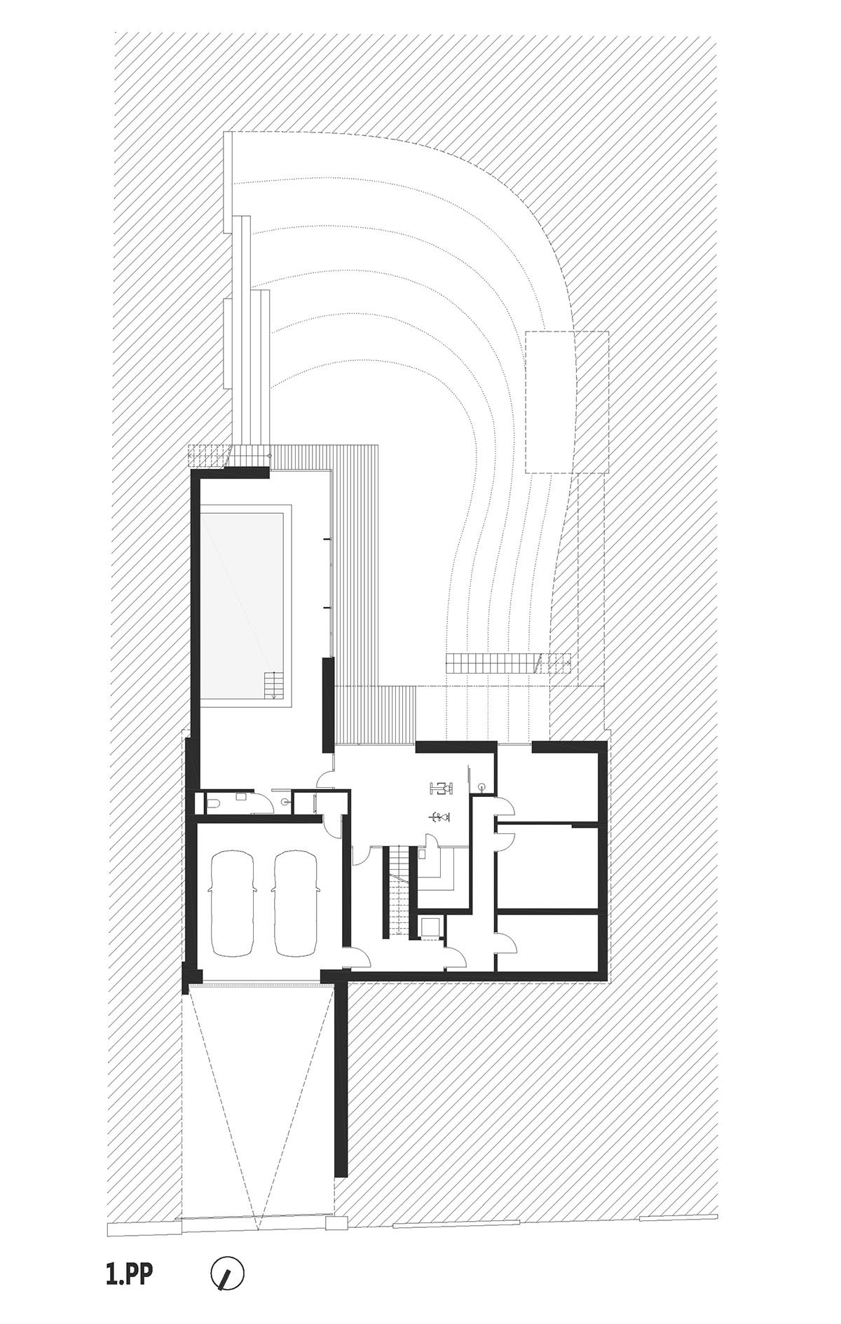 The main family areas are on the ground floor, as the client required. There is a large living room and a dining room with a kitchen dimensioned to gather a more prominent family; there are the master bedroom and appropriate amenities here, too. Two guest rooms and a study with a separate street entry are on the first floor. Aside from the garage and technical rooms, there is an eight-meter-long swimming pool with a sauna and a small fitness room in the basement. By its glass wall, the swimming pool opens to the lowered part of the garden, which is recessed to bring pleasure into this part of the house.