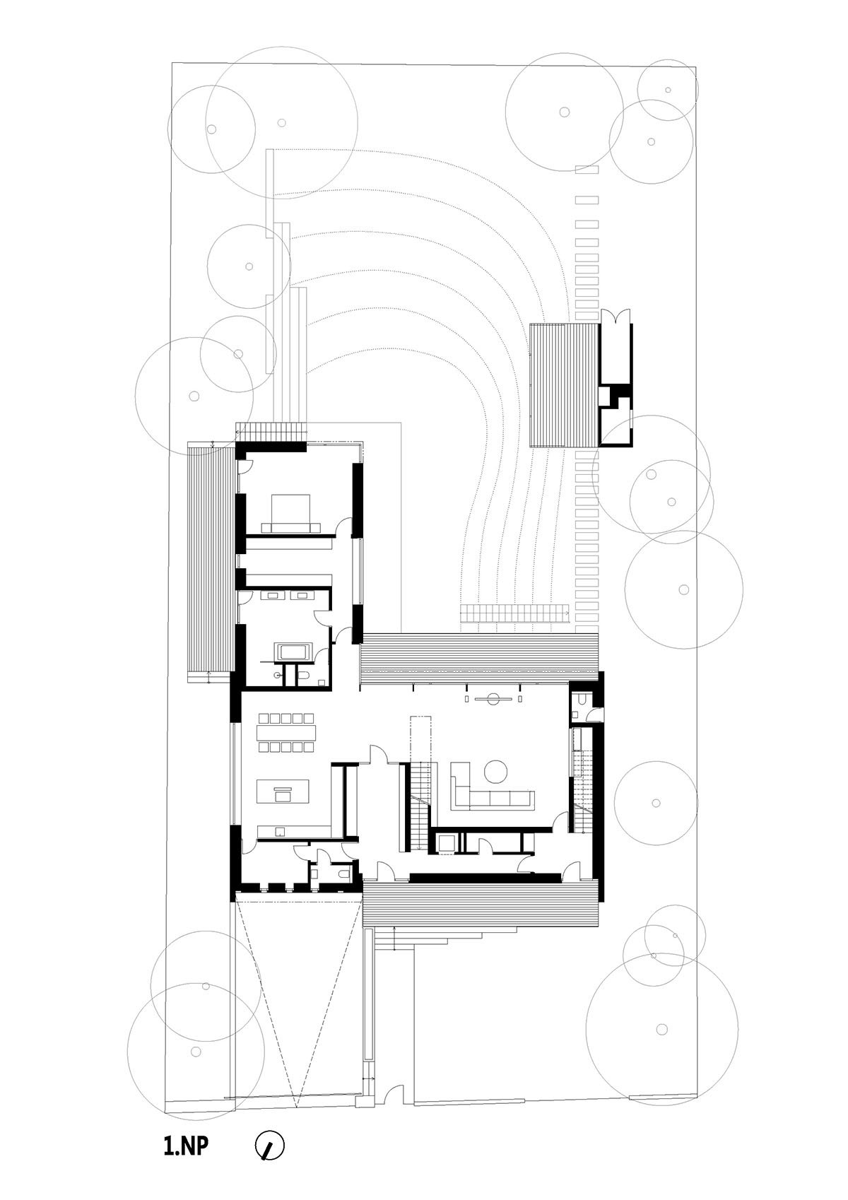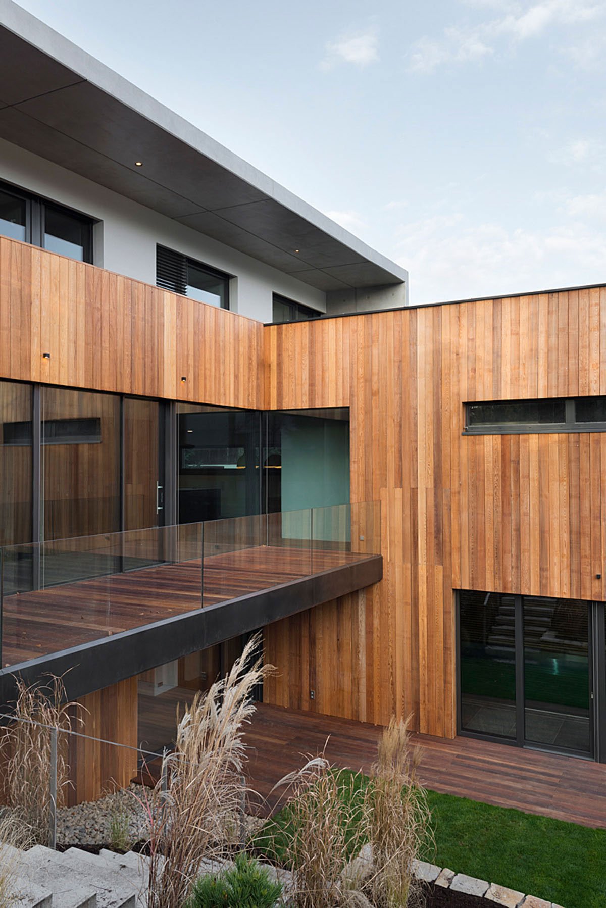 An intense interconnection, mingling of the home and the garden, and creating of protected privacy in its part is an essential principle of our design. The garden is planted with the same species of plants as the nearby Průhonický park; the steeper part of the landscape is covered with rhododendrons, like in the park.
