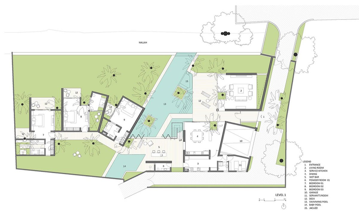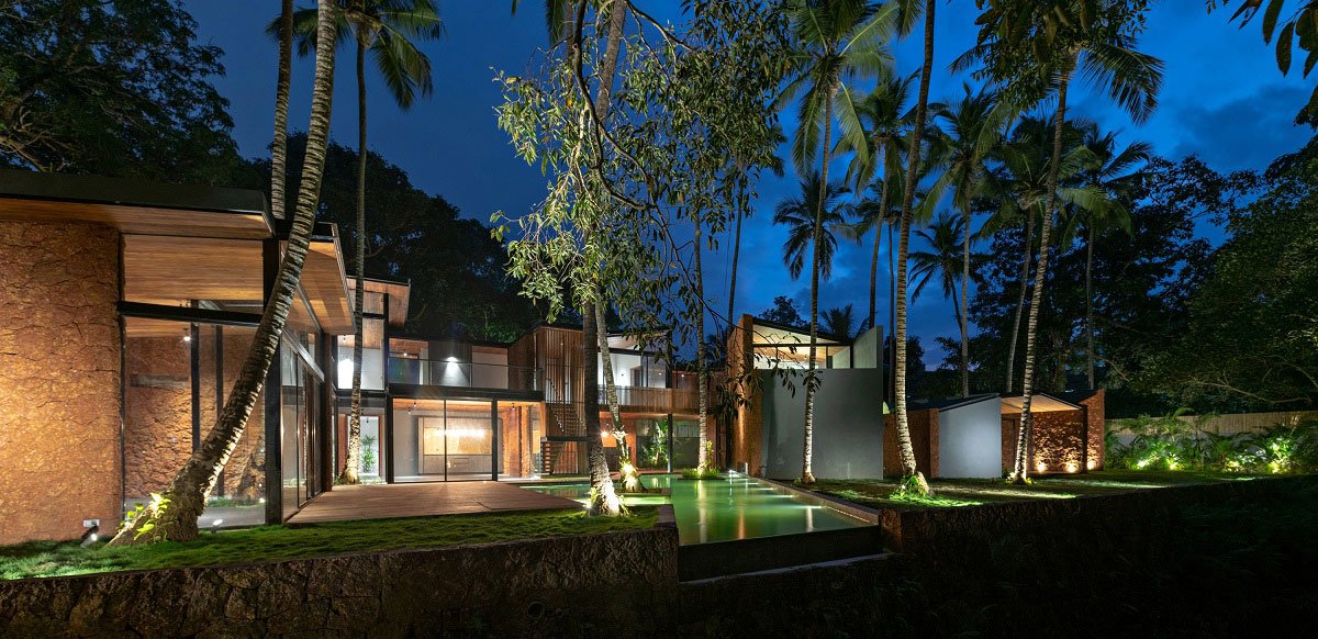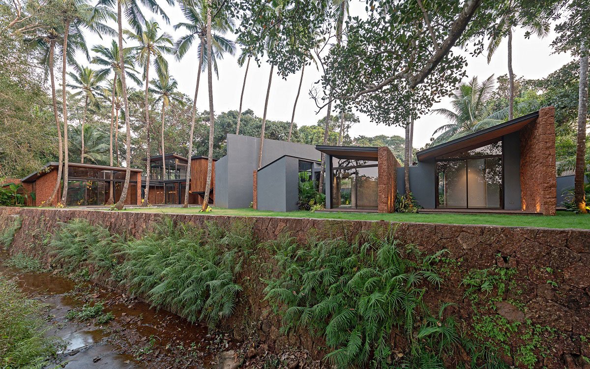 Consequently, the structure is fragmented rather than monolithic, reminiscent of an old-time Goan village but at the same time entirely modern. Each bedroom on the ground floor, for example, feels like a separate home, replete with an en-suite bathrooms, a rear garden, a front garden and an internal courtyard flanked by laterite walls. These independent volumes are interconnected with decks, passages and bridges that meander through the trees and over pools and gardens.