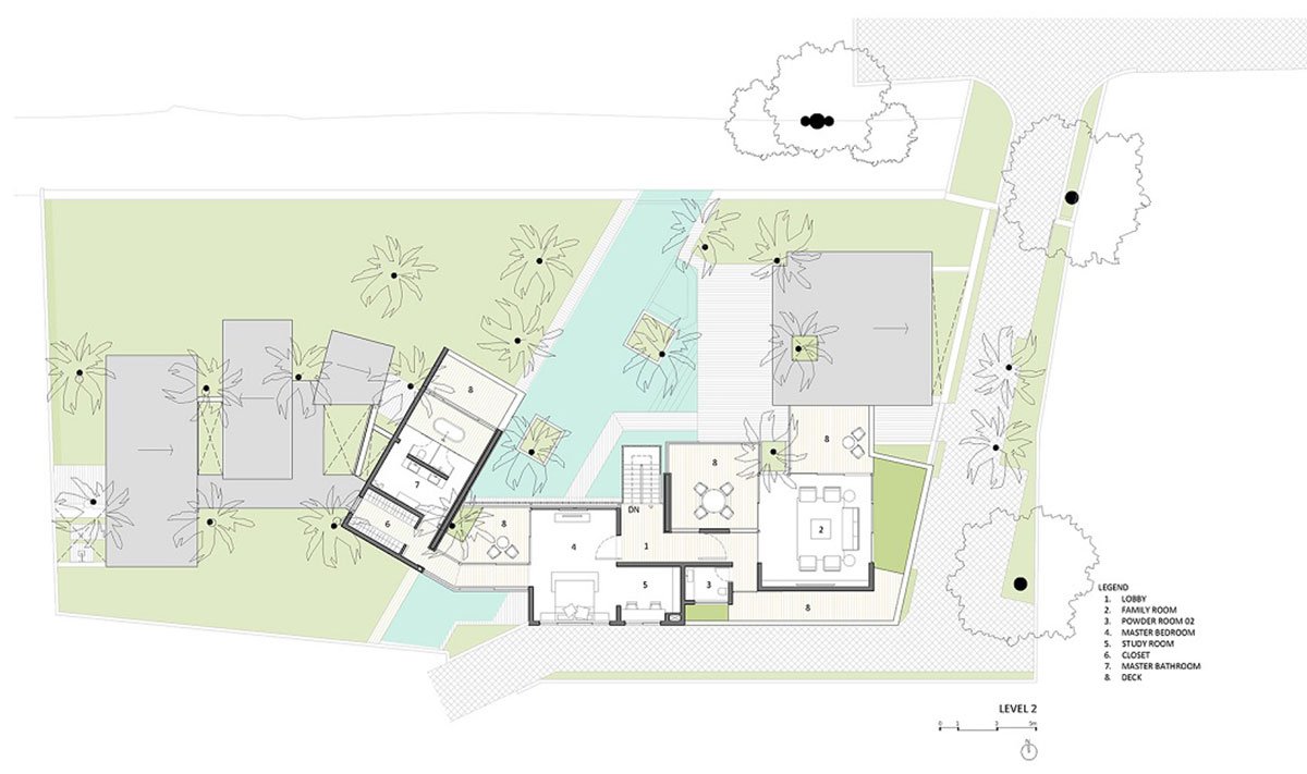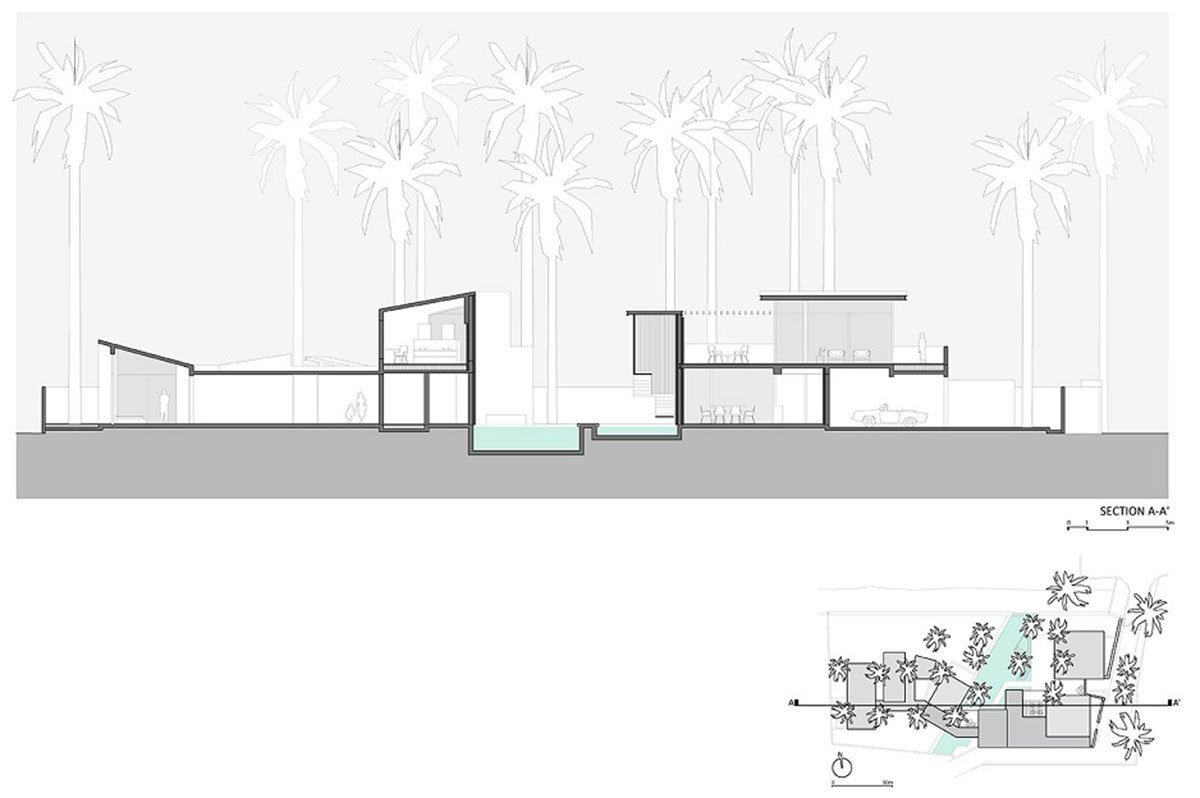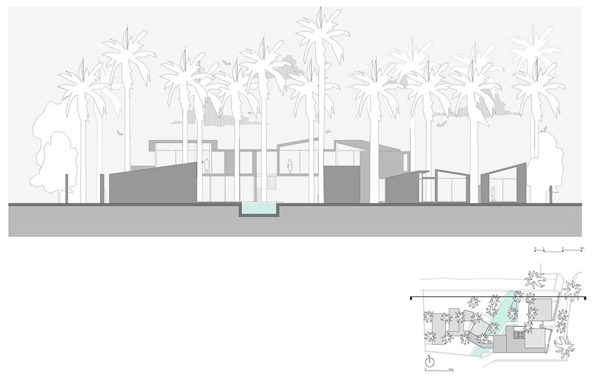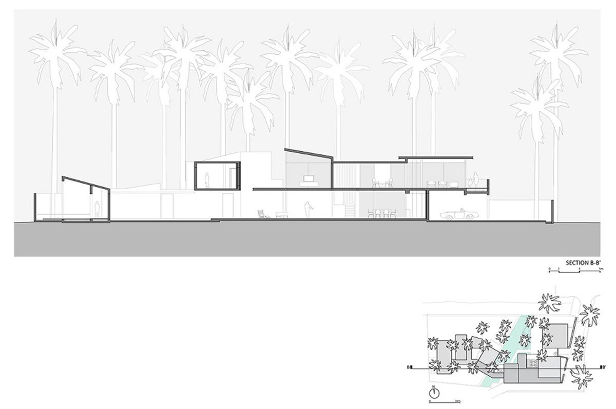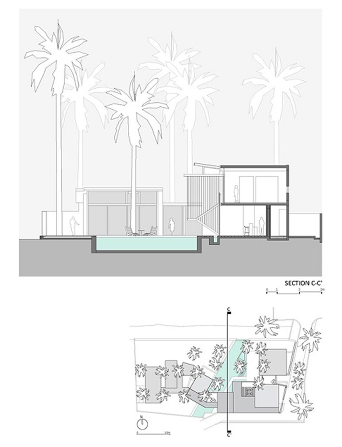 [Text as submitted by the Architect] Villa in the Palms is named after the 19 towering coconut palms that thrived for decades on the land, which dictated the villa’s concept and footprint. This four-bedroom house overlooks a field and a seasonal stream.