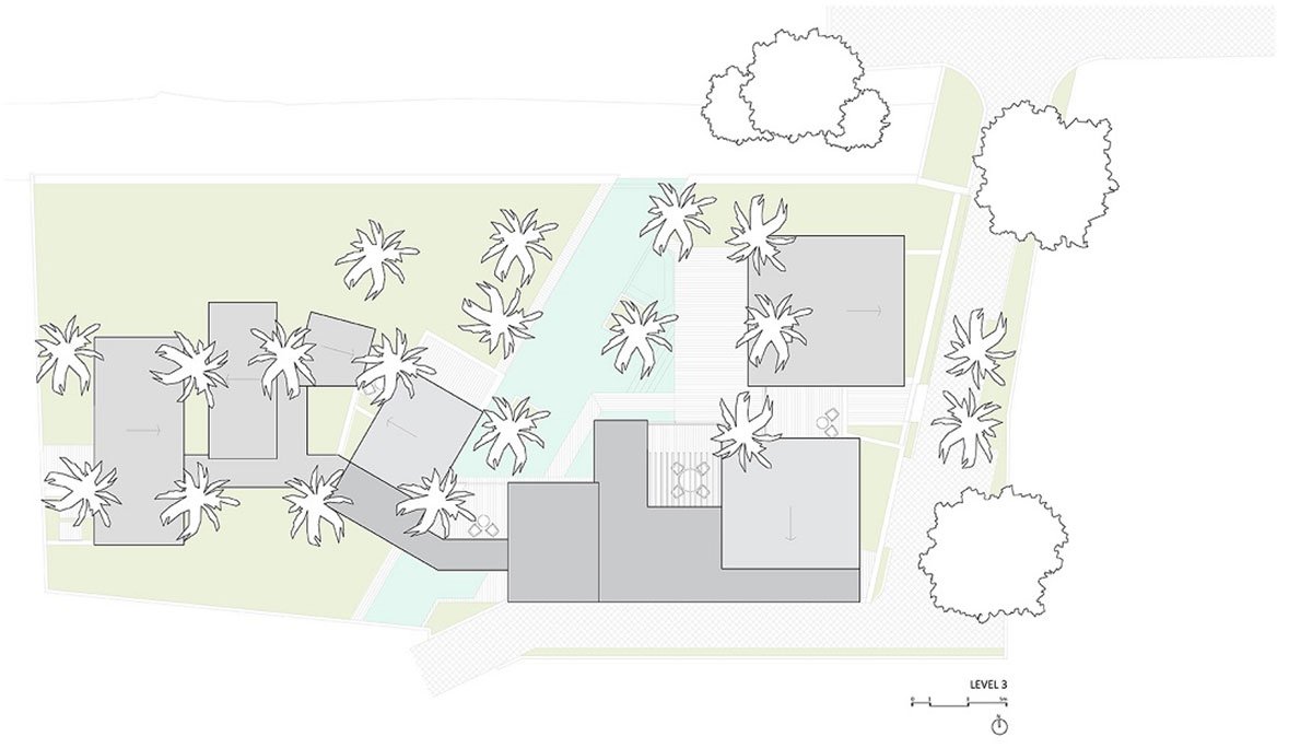 Embedded into the natural landscape, Villa in the Palms appears almost village-like, pockets of small homes nestled between 80-year-old coconut trees, nearly invisible from points further up the approach road. The fact that the trees on site existed for decades gives the overall house a very rooted presence.
